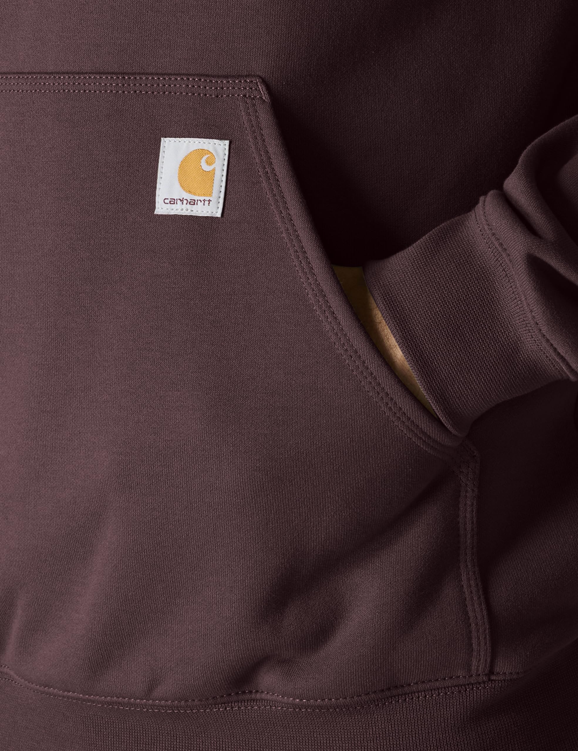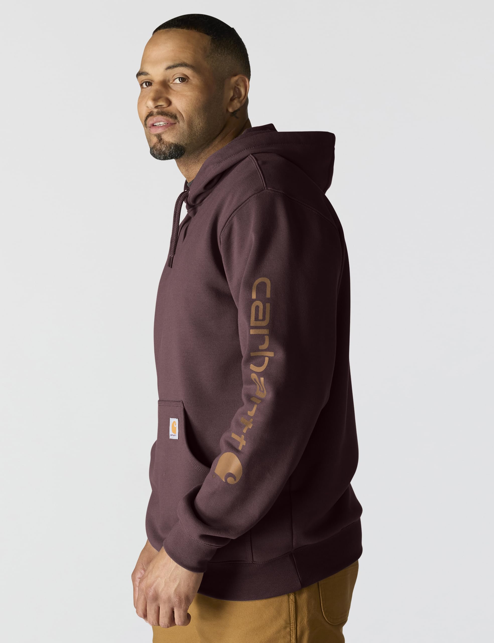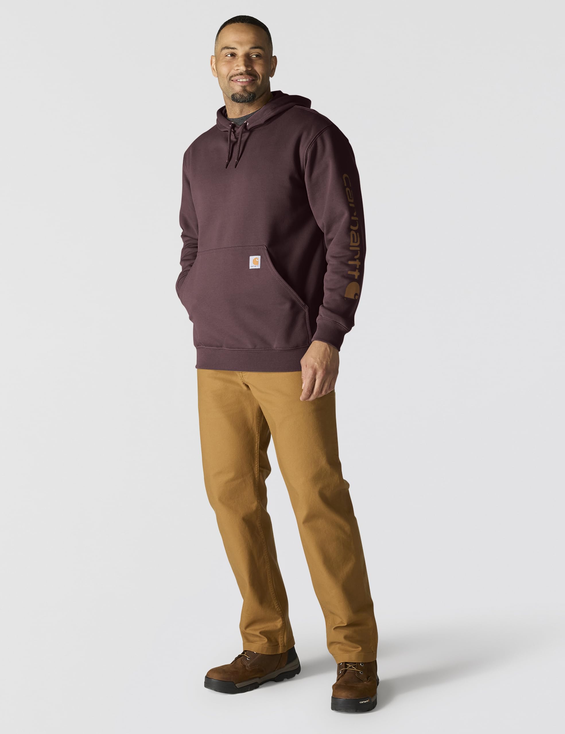 Description Product Description Carhartt's midweight hooded logo-sleeve sweatshirt comes in great colors. Made of a 10.5-ounce, 50% cotton/50% polyester blend, it features an attached hood with draw-cord closure, front hand-warmer pocket, spandex-reinforced rib-knit cuffs and waistband. The carhartt logo is printed on the sleeve and a logo patch is sewn on the pocket. Product Care:Machine wash cold with like colors, Do not bleach, Tumble dry low remove promptly, Do not iron ornamentation From the Manufacturer Our midweight hooded logo-sleeve sweatshirt comes in great colors. Made of a 10.5-ounce, 50% cotton/50% polyester blend, it features an attached hood with draw-cord closure, front hand-warmer pocket, spandex-reinforced rib-knit cuffs and waistband. The Carhartt logo is printed on the sleeve and a logo patch is sewn on the pocket.