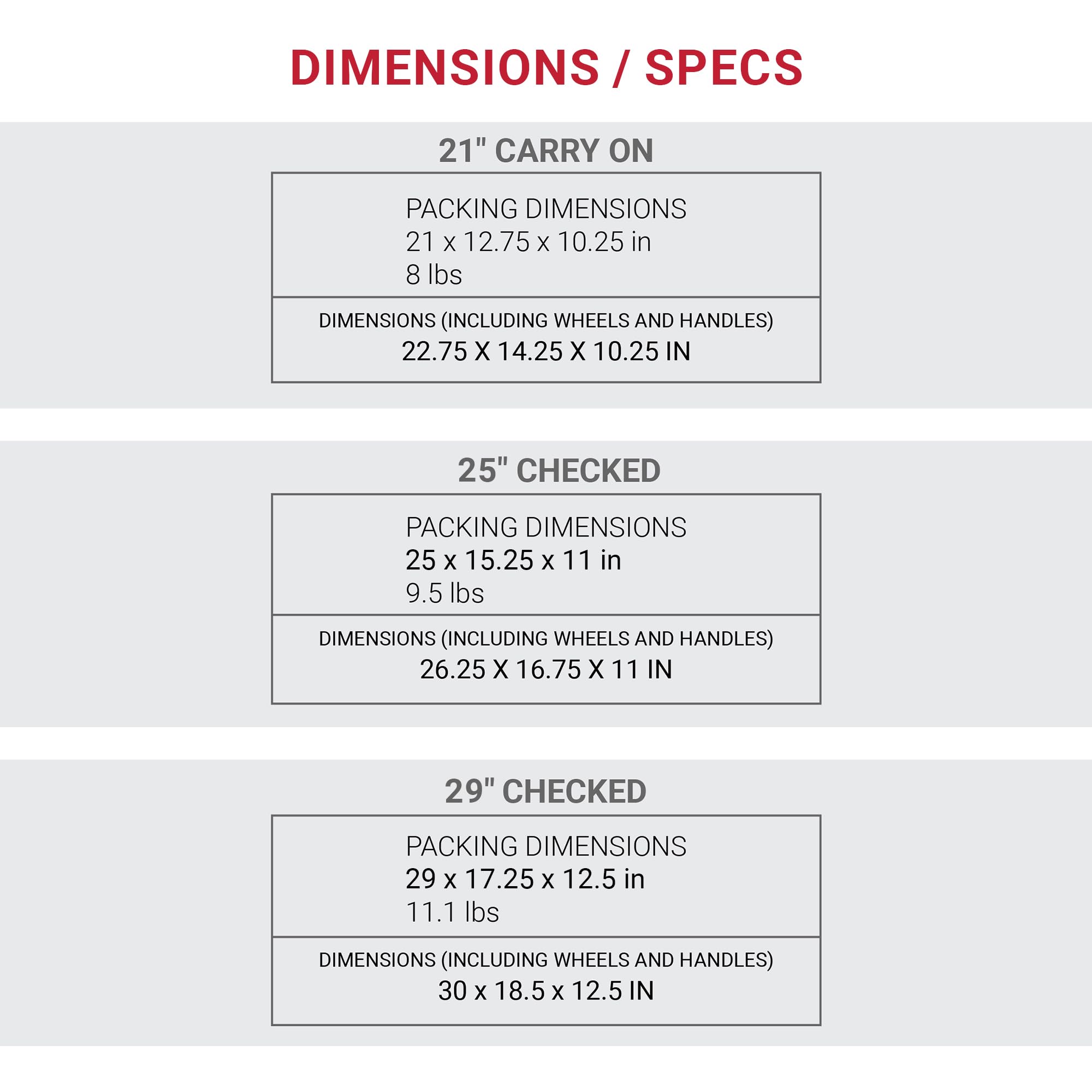 FULL SIZE RANGE & DIMENSIONS – Carry-On, Medium, and Large sizes with respective packing and product dimensions to accommodate any trip length