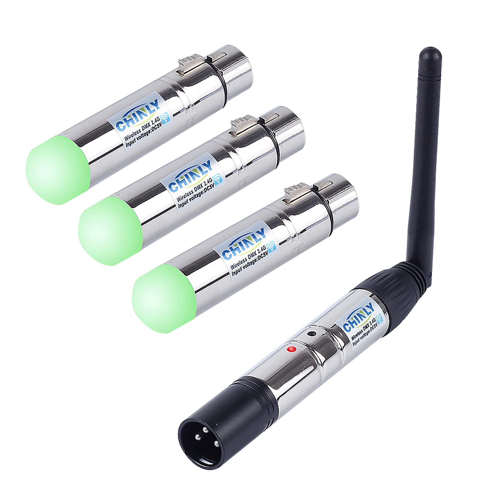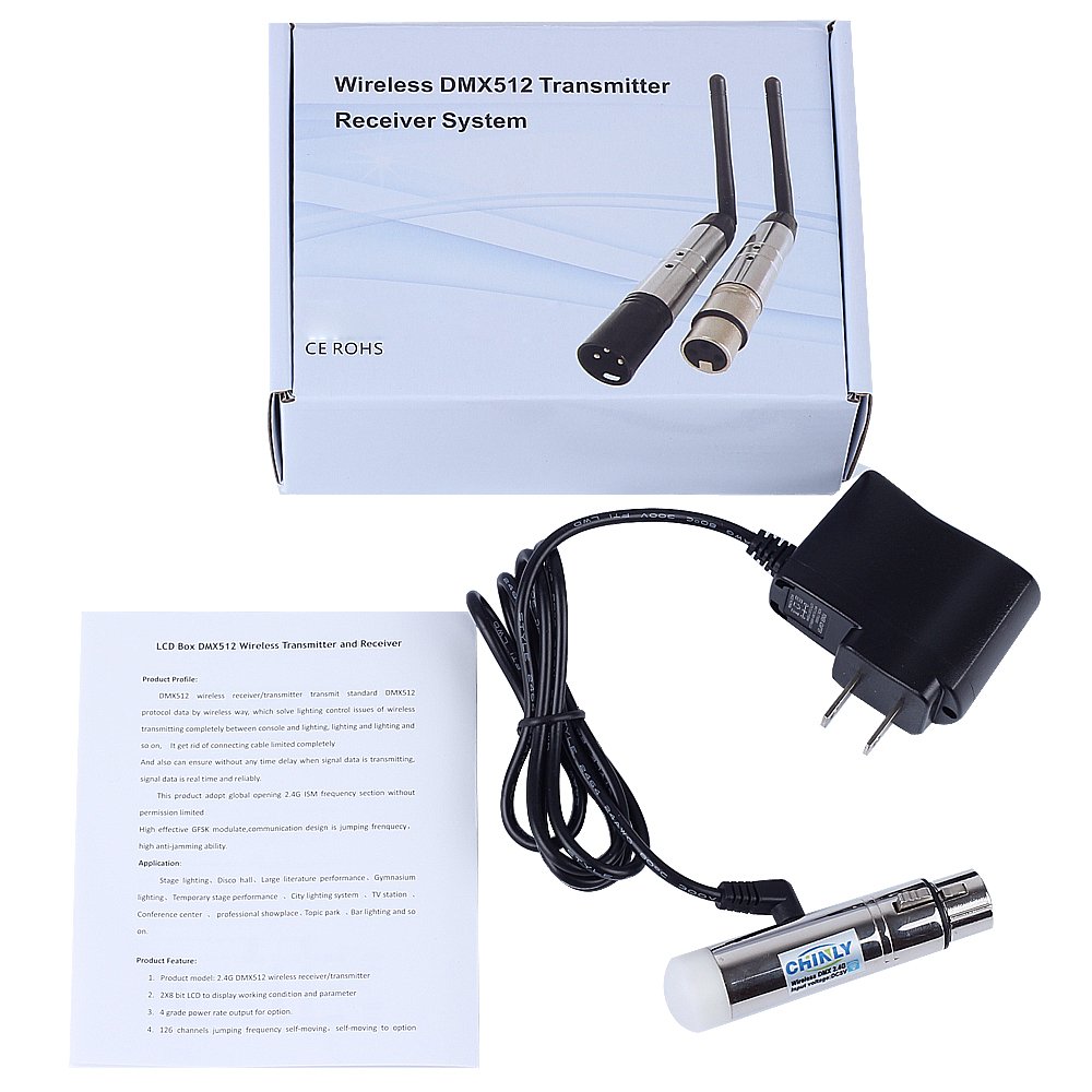 Specification: 1. 2.4G wireless DMX512 R / T 2.Work voltage: AC100-240V 3.Receive Sensitivity: -94dBm 4.Max transmitting power rate: 20dBm 5.DMX connector: 3pin male 6.Communication distance: 400M (visible distance) 7.Work frequency section: 2.4G ISM, 126 channels.frequency section 8.7 groups ID code settable,User can use 7 groups individual wireless net without any interfere. 9.Material: zinc alloy + plastic 10.Item size: L3.1 * W0.7 * H0.7in 11.Package weight: 6.3oz Establishing Communication: 1. Power on DMX512 wireless received board first and then following to power up the transmitted board. 2. Press “Key” button to set same ID value of transmitted board and received board. Please use different ID value if you need use more than 1 group wireless universals at same time in same place. 3. The red LED flashes when transmitter transmits DMX data by no interfered frequency section, then receiver changes communicated frequency section. Green LED flashes until received same ID value, the more DMX data, the faster the LED flashes. 4. Communication was established correctly. Package list: 1 x DMX wireless received 1 x Adapter 1 x Specification