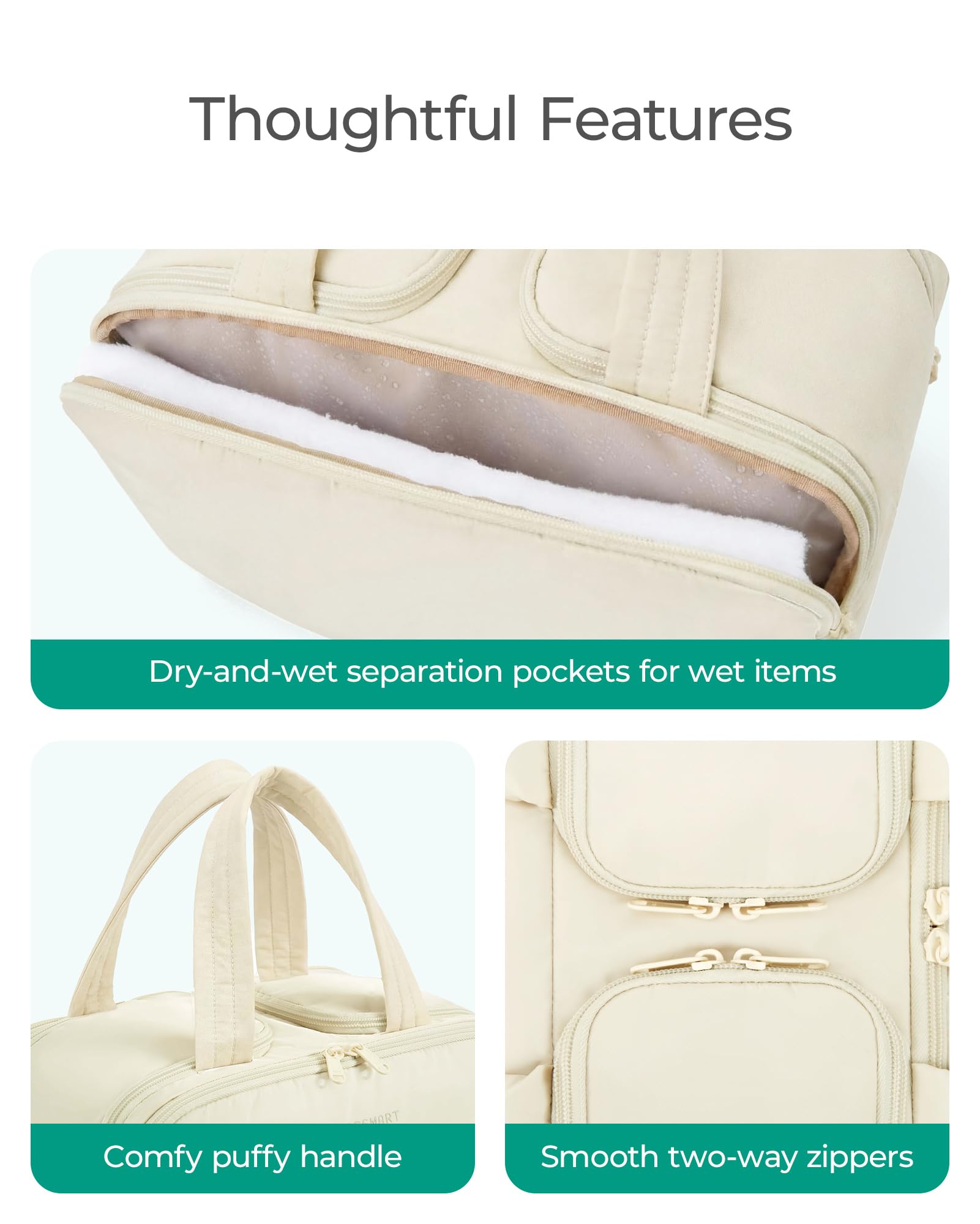 Dry-and-Wet Separation: The large toiletry bag with a waterproof PVC fabric and a front zipper pocket can help keep wet and dry items separate and make it easy to clean.