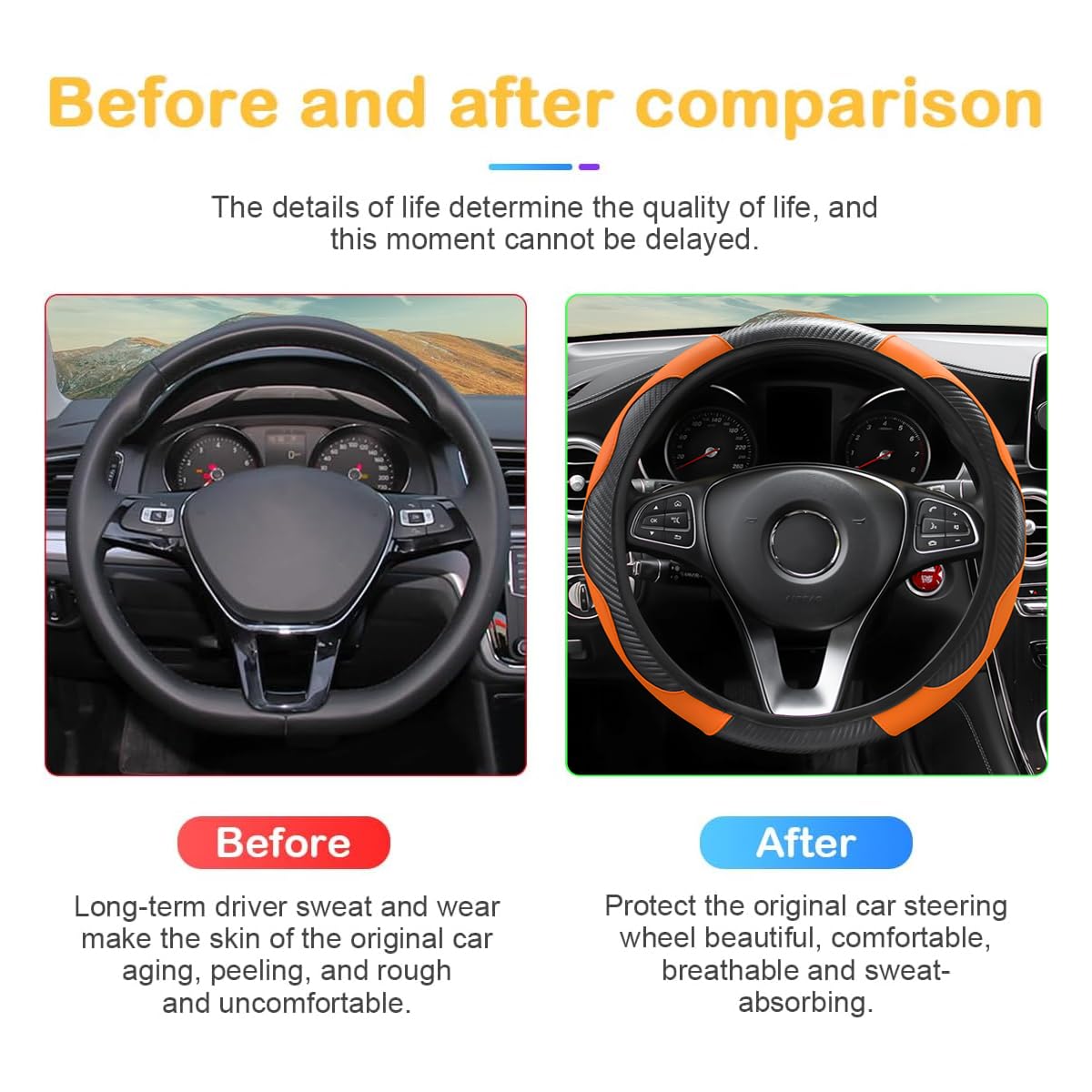 【Protection】: The full coverage design provides complete protection for your steering wheel, helping to protect the original steering wheel from scratches, aging, wear, fading, and dirt. It can be used for a long time, keeping your steering wheel with a refined look. With a new steering wheel, you will have a new mood and feeling every time you drive.