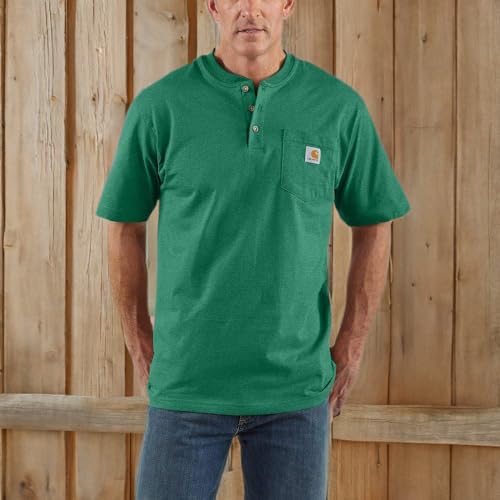 Description Carhartt's short sleeve workwear henley is an all-purpose work shirt that is perfect in warm weather or for layering when it gets cold it's made of 675-ounce 100-percent cotton jersey knit henley and features a rib-knit collar with a three-button closure and a left chest pocket it's also been designed with side-seamed construction to minimize twisting and maximize comfort