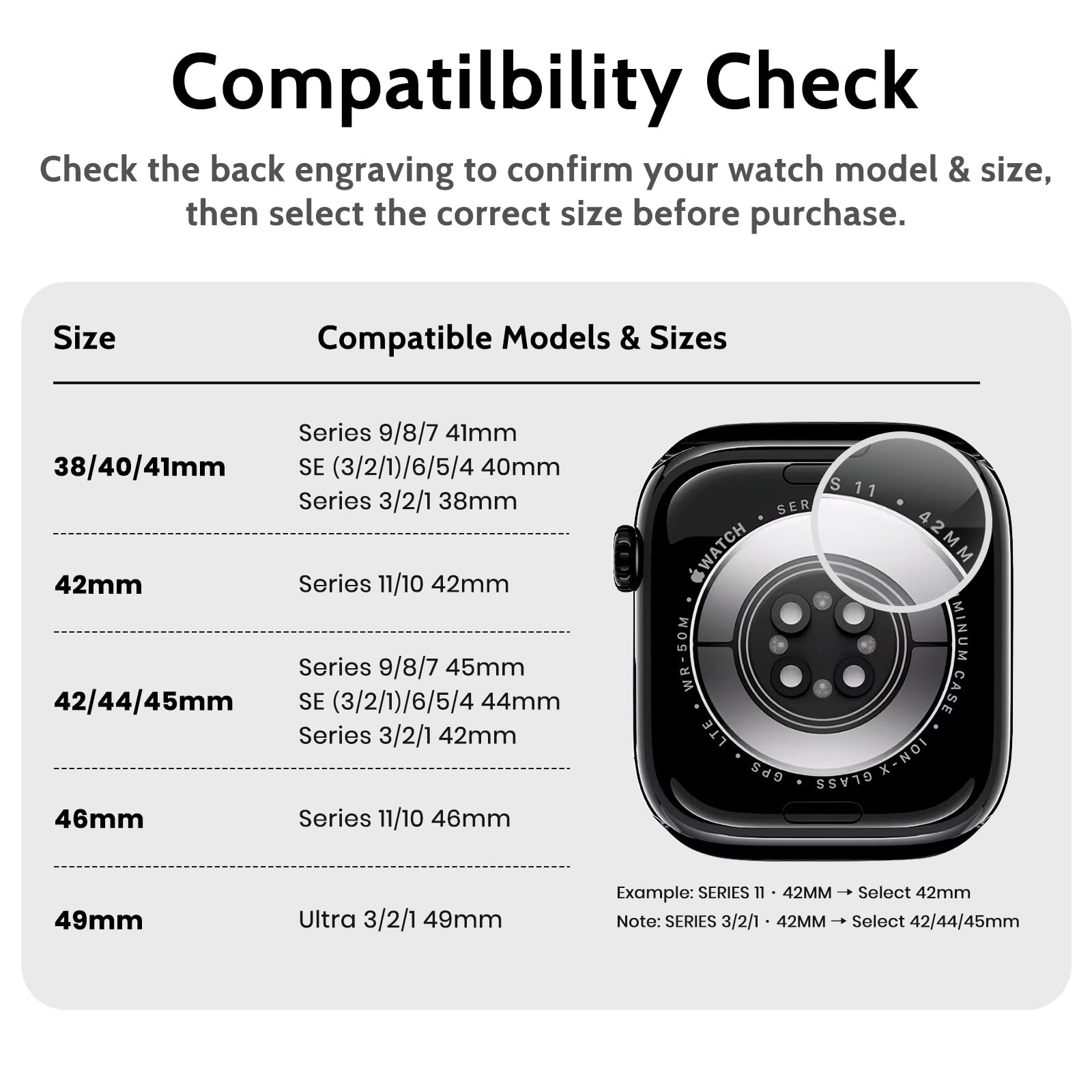 Compatibility & Fit: Compatible with Apple Watch series 11/10 (42mm). Adjustable strap fits most wrists 140-200mm (5.5" - 7.9").