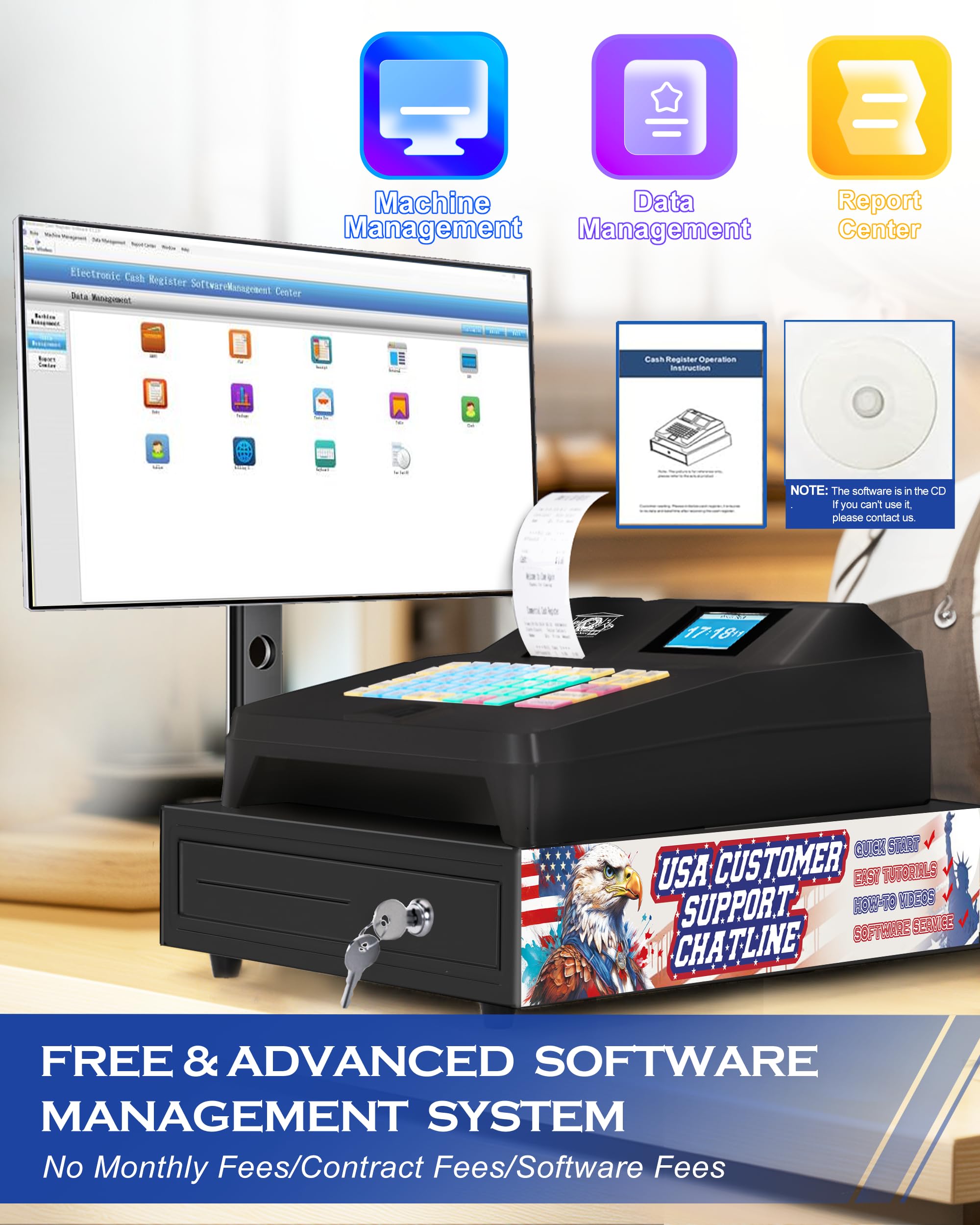 Comprehensive Report&Software Management System:In sales mode, it allows for one-click checkout after item recognition. It also provides sales data reports per hour, per cashier, per item, per department, refunds, cash drawer openings, and more(Print to get the report). HypeXtec cash register also has it's Self-developed Advanced Software Management System (without Monthly Fees/Contract Fees/Software Fees) which supports connected software to manage goods, receipts and other information entry.