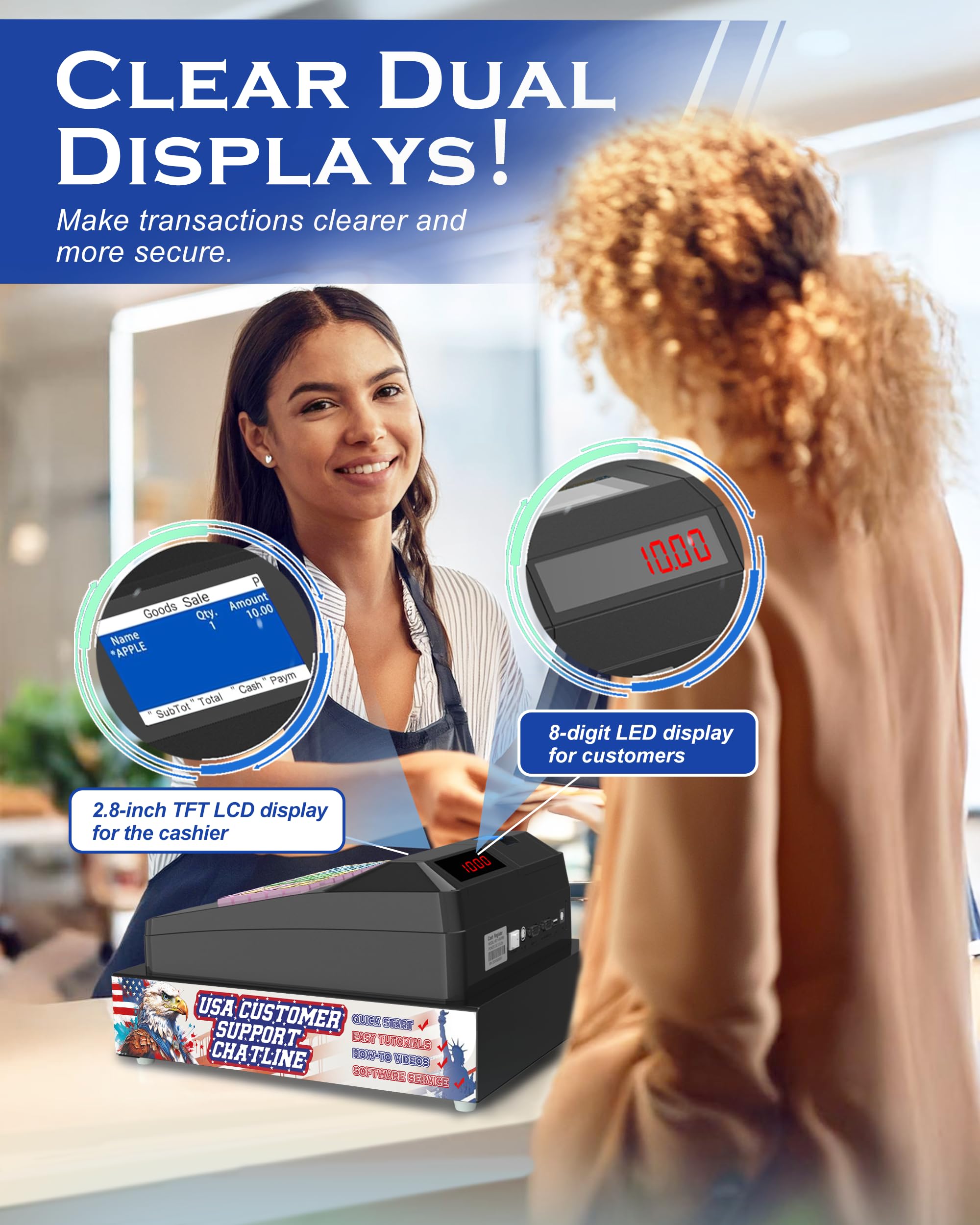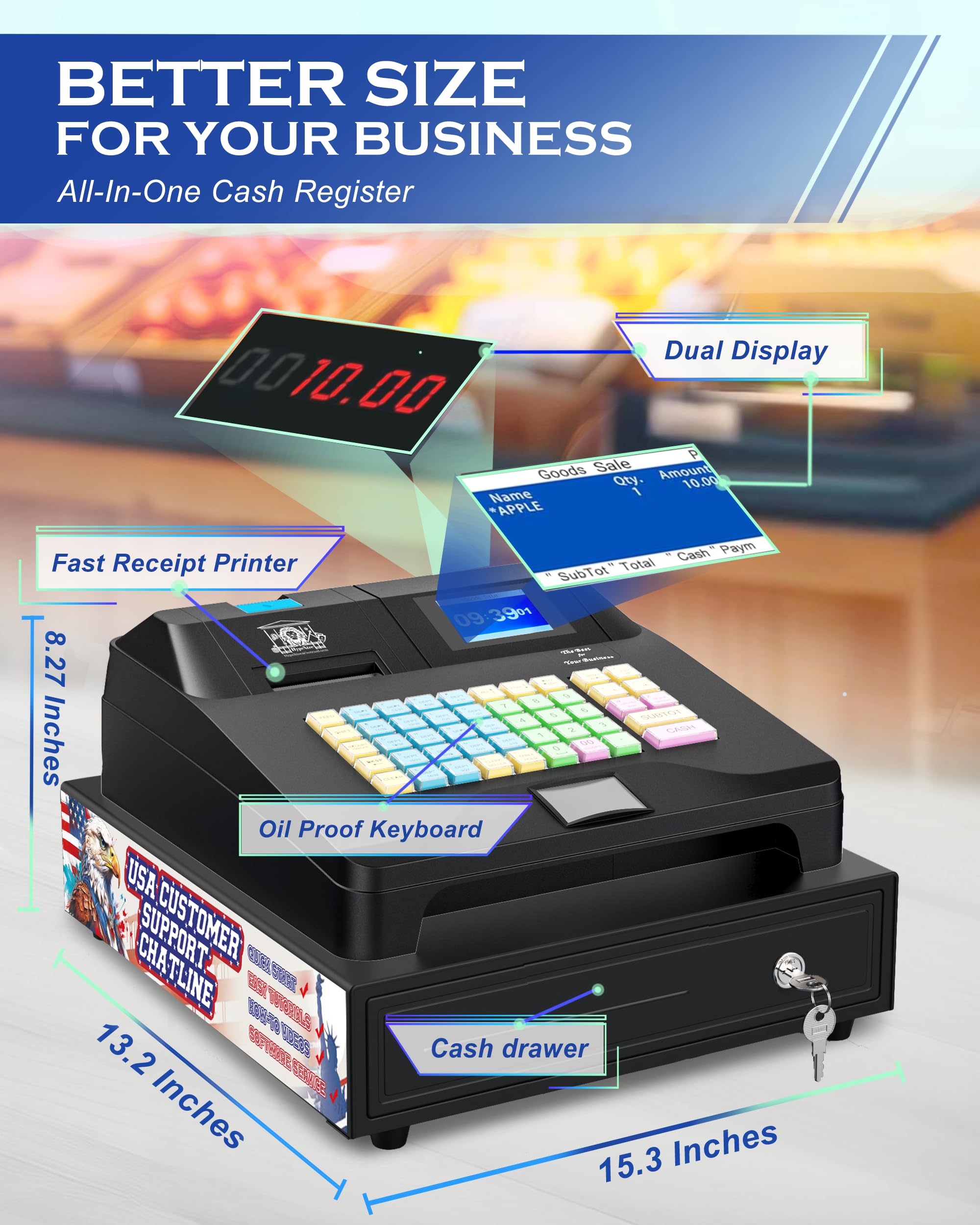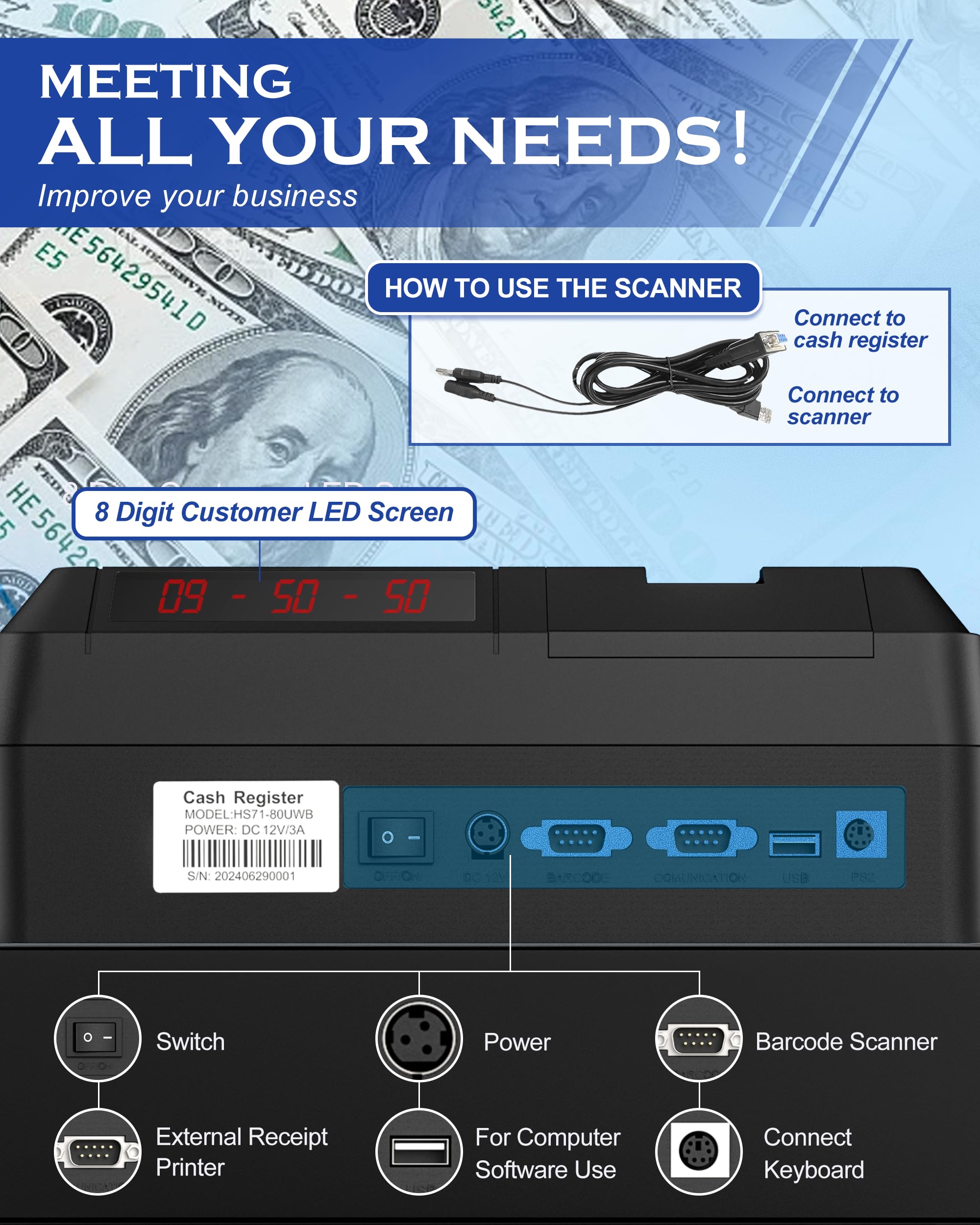 POWERFUL FUNCTIONS:The built-in thermal printer has a smoothly print speed of up to 90mm/s, reducing customer wait times. It features a 2.8-inch TFT LCD for the cashier and an 8-digit LED display for customers. The integrated cash drawer pops open during transactions. Also supports multiple device connections,it's equipped with 2 RS232 ports for connecting scanners, scales, and printers; a USB port for connecting to a computer; and a PS2 port for keyboard connection.
