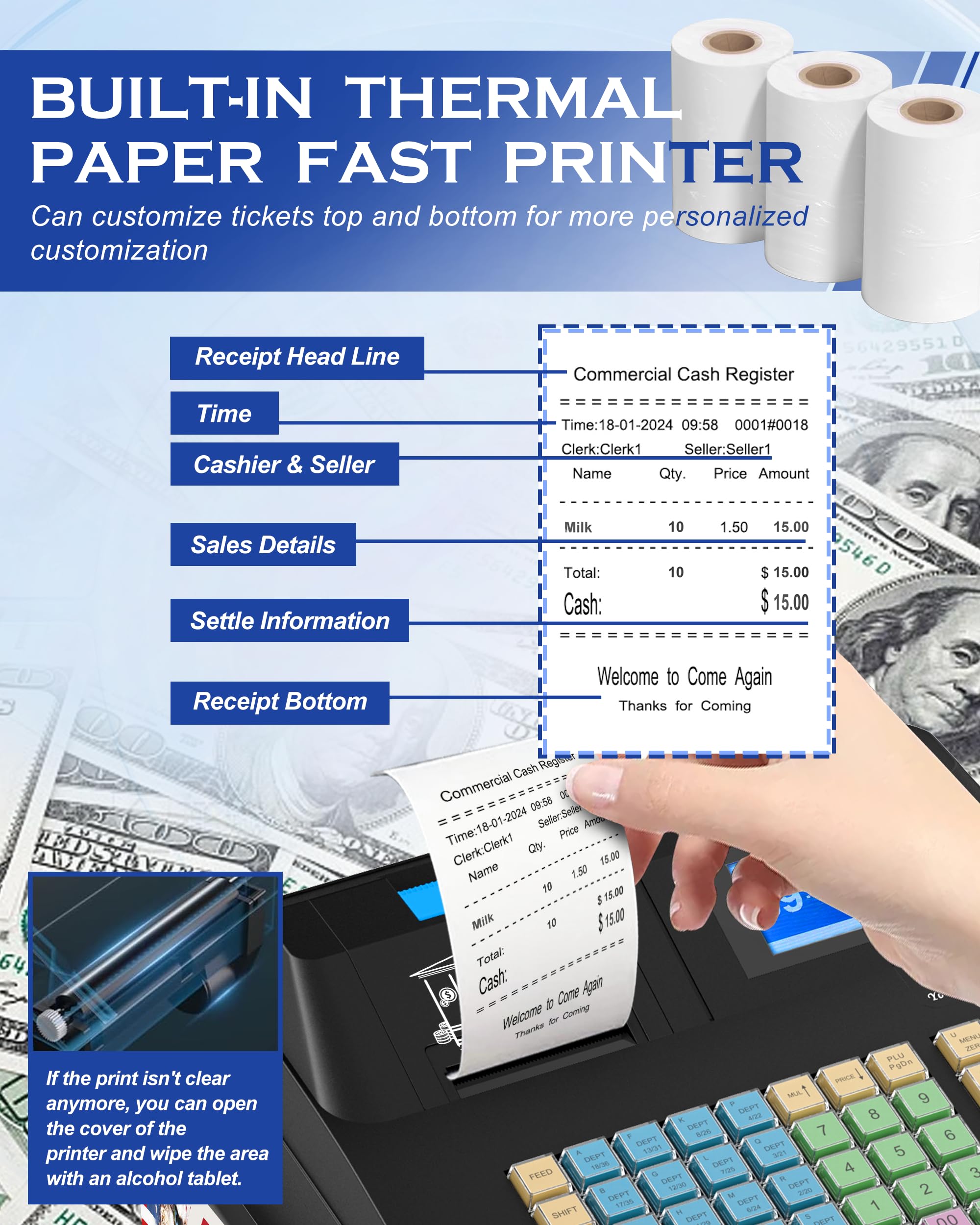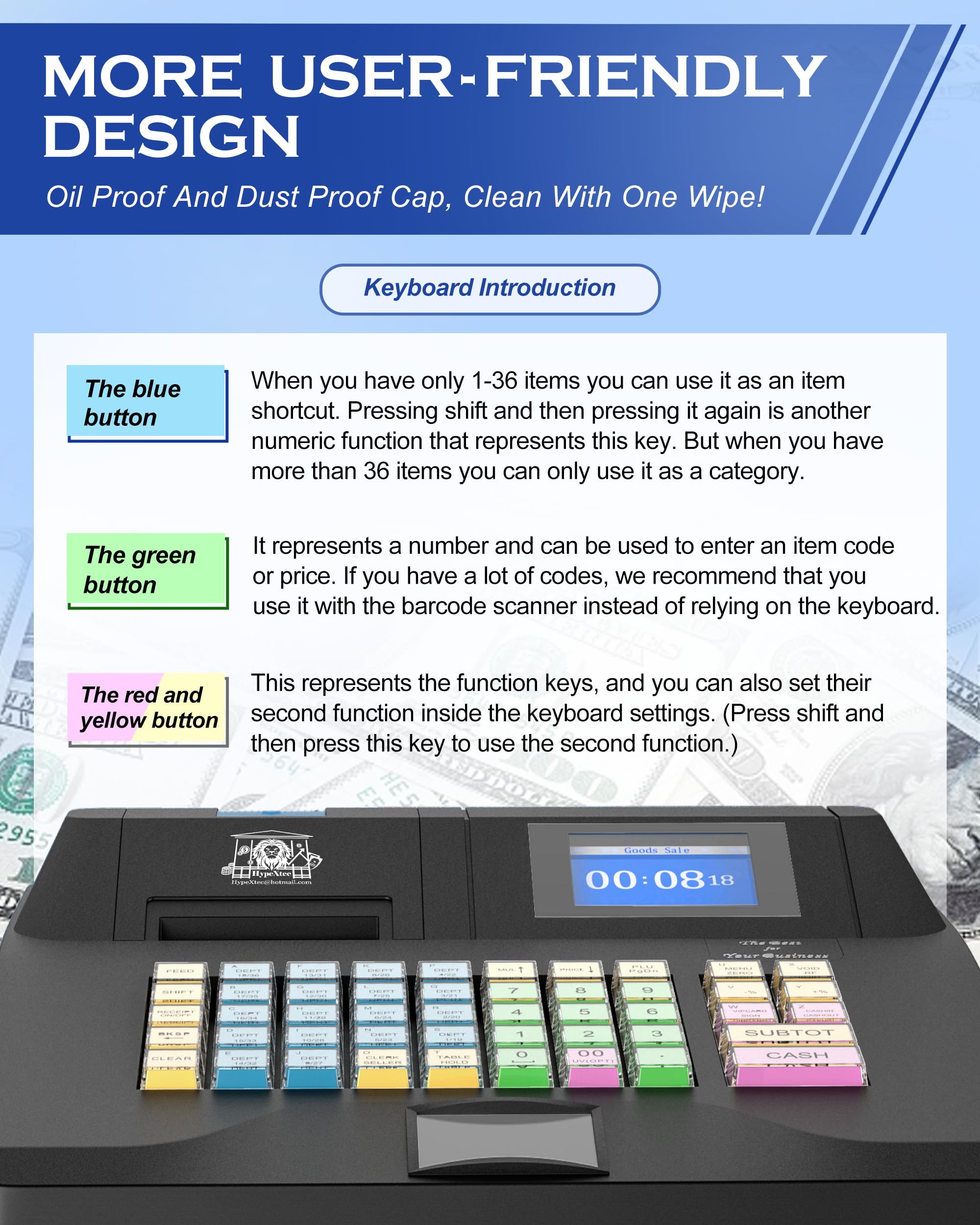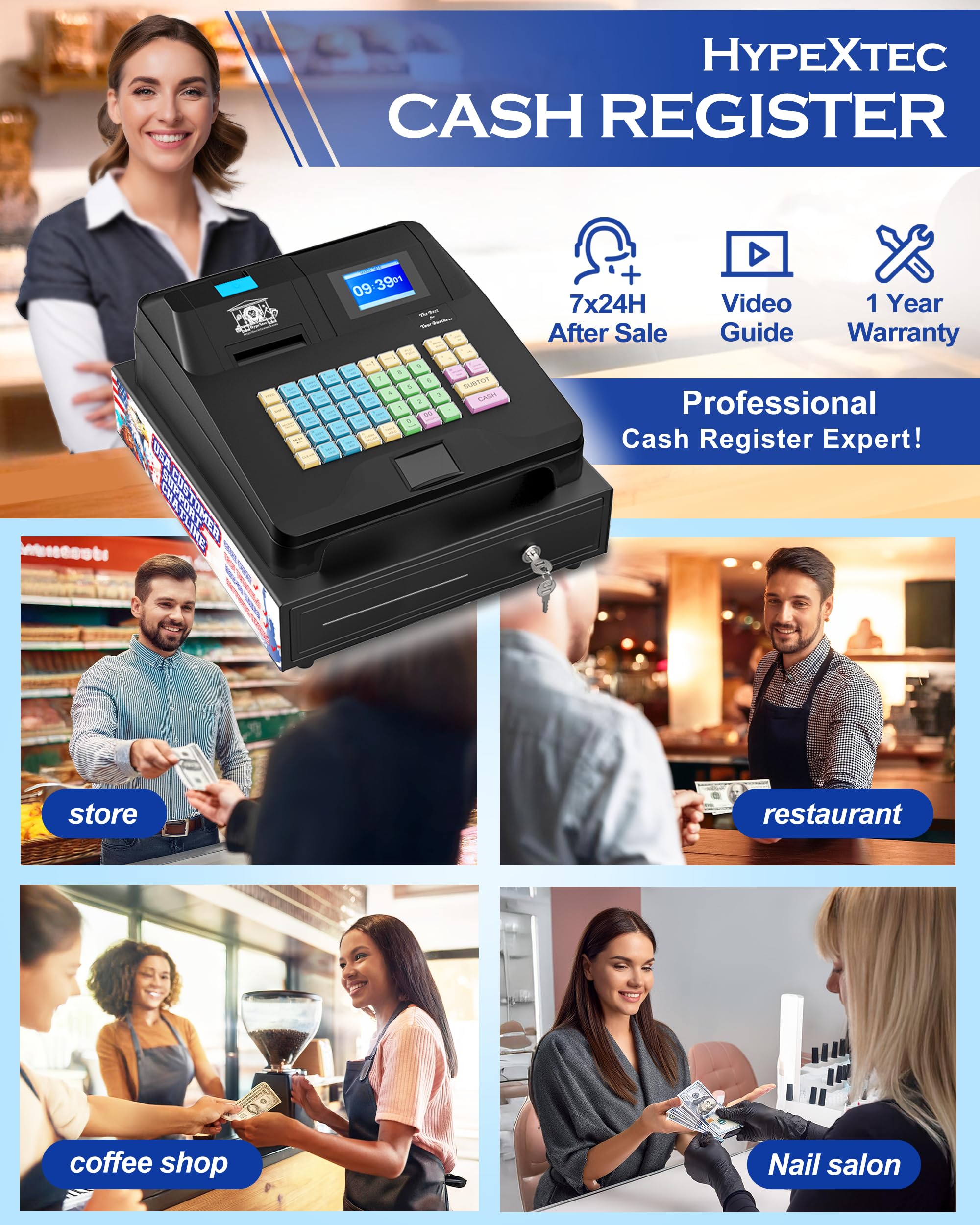WORRY-FREE SERVICE: HypeXtec cash register has passed both RoHS and FCC certifications. Package includes the cash register, 3 rolls thermal paper(2-1/4"Thermal Paper), USB cable, power cord, 2 cash drawer keys and user manual. Ideal for small supermarkets, convenience stores, and restaurants. We offer 24/7 professional one-on-one technical support(Email, phone or video). Please reach out to us if you encounter any issues.