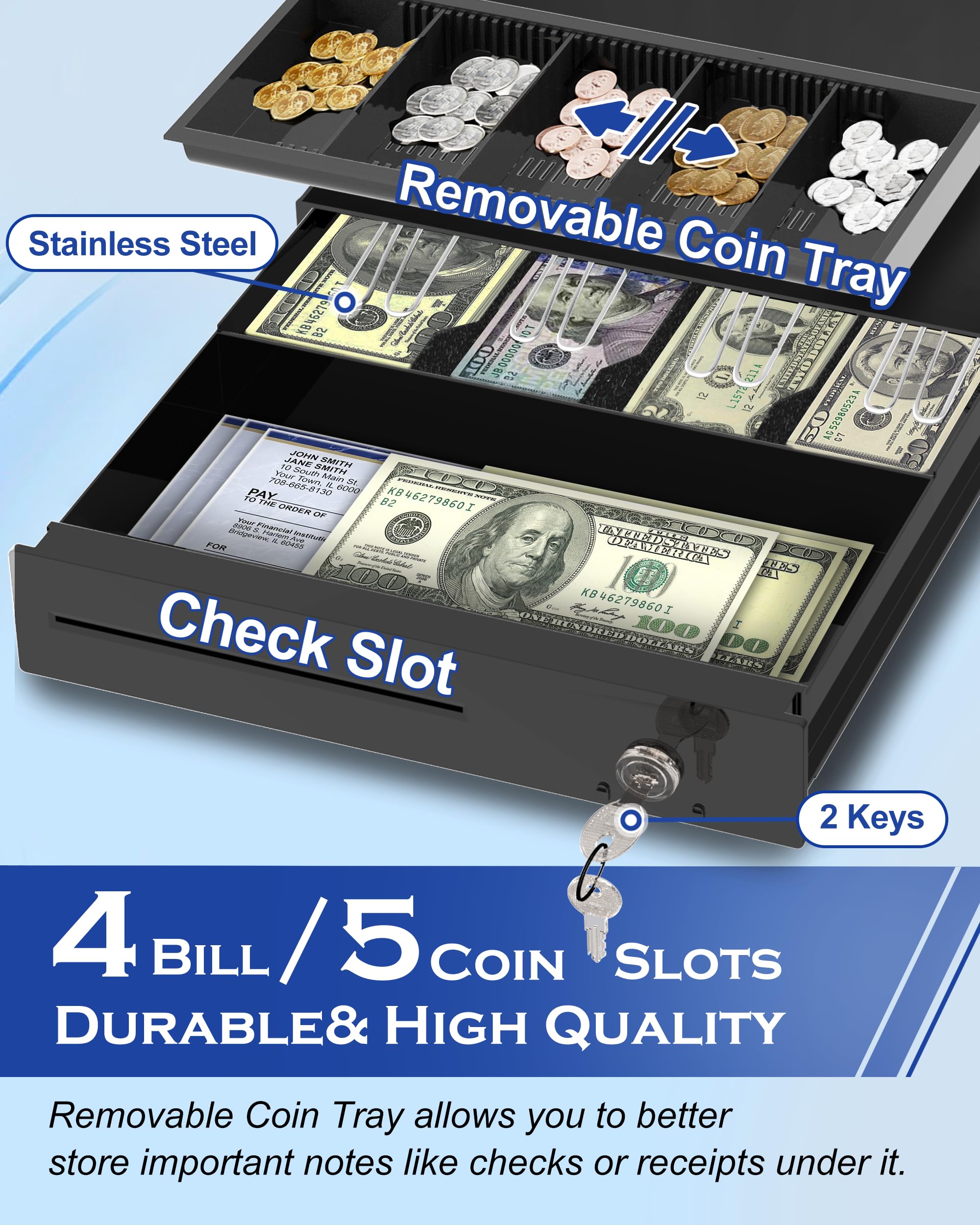 SECURE HUMANIZED DESIGN: Supports up to 50 cashiers with individual passwords and comes with 2 cash drawer keys for dual security. The cash drawer has 4 bill compartments and 5 removable coin compartments, Larger capacity to keeping everything organized. The ABS material casing is waterproof and oil-resistant, suitable for a variety of environments.