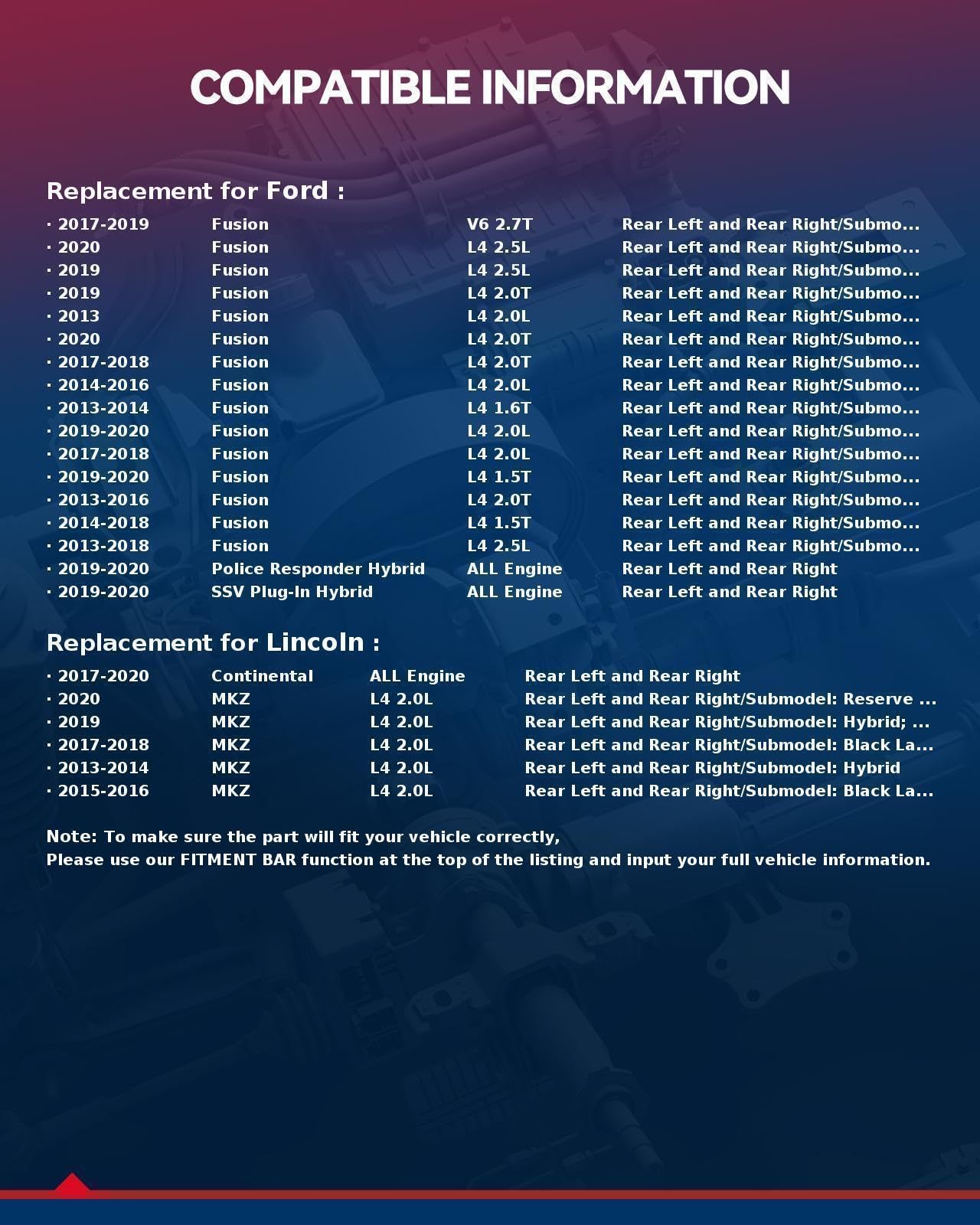 [Vehicle Fitment]: Compatible with Ford Fusion 2013-2020, Lincoln MKZ 2013-2020, Lincoln Continental 2017-2020, Ford Police Responder Hybrid 2019-2020, Ford SSV Plug-In Hybrid 2019-2020---Rear Left and Right Side
