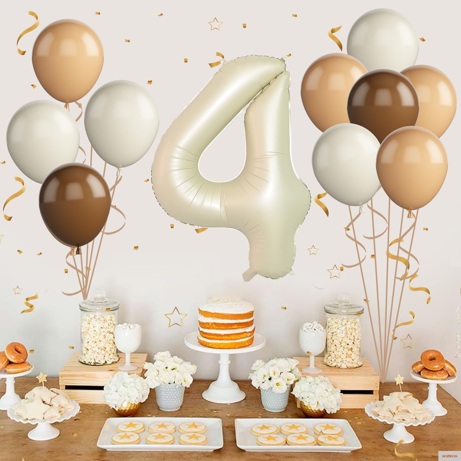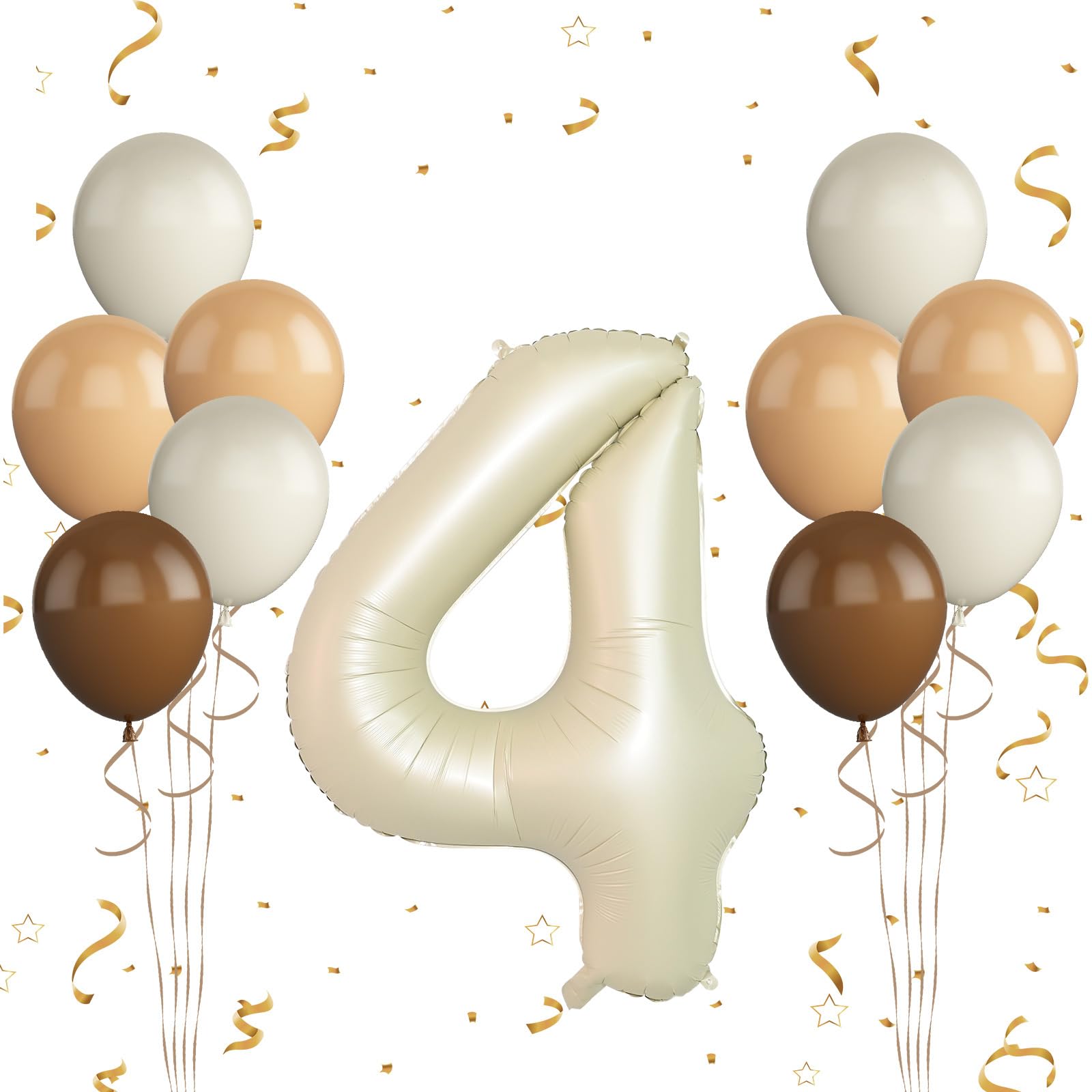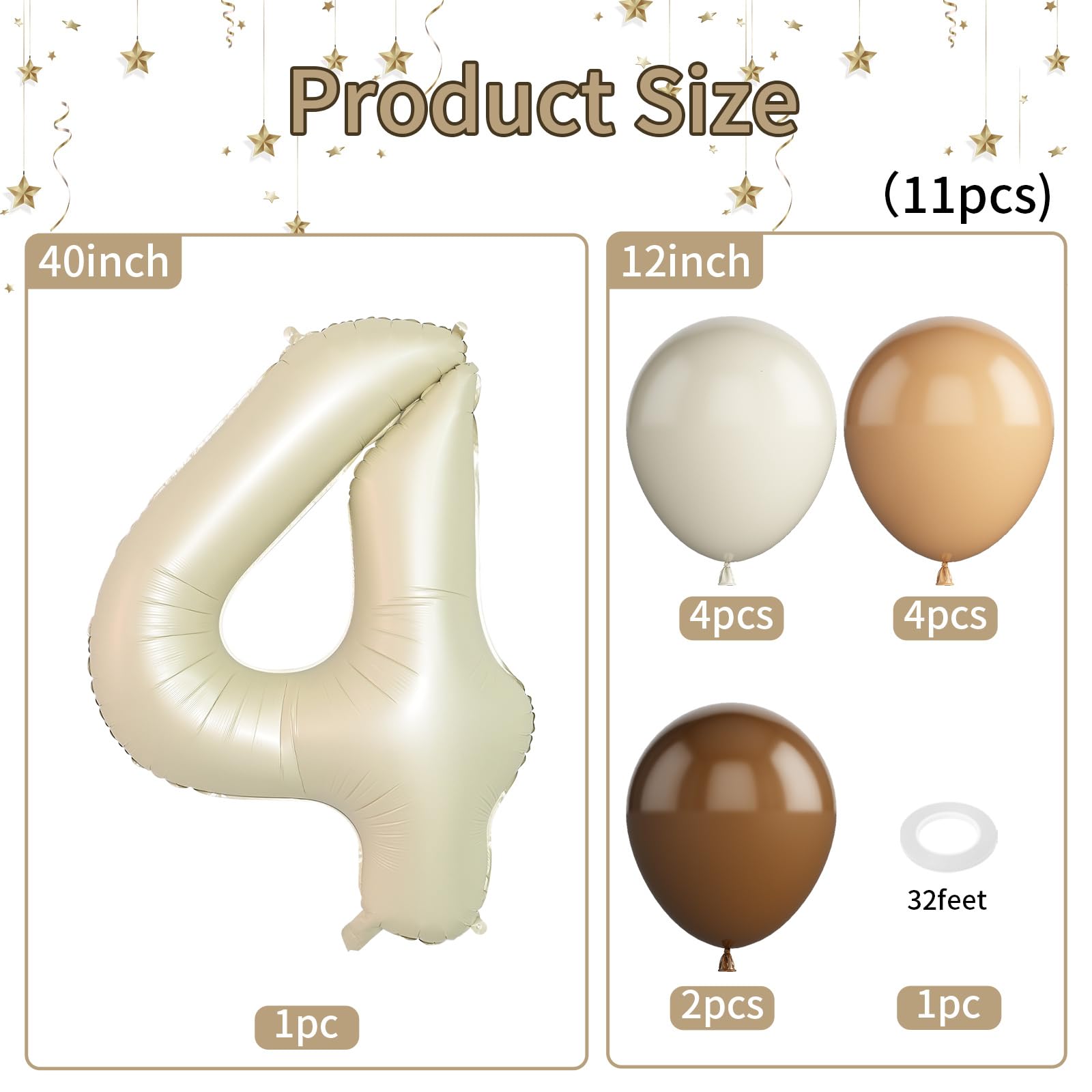 Product Contents: This 4th birthday balloons set includes a 40 inch cream white number balloon, 4 pcs 12 inch retro apricot balloons, 4 pcs 12 inch sand white balloons, 2 pcs 12 inch retro brown balloons, and 1 pc 32 feet of white ribbon