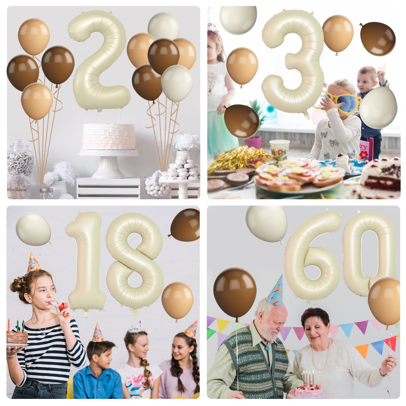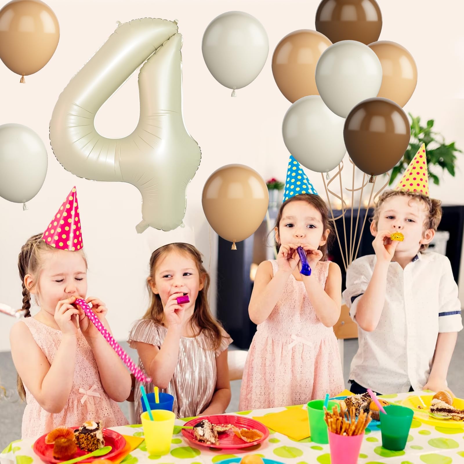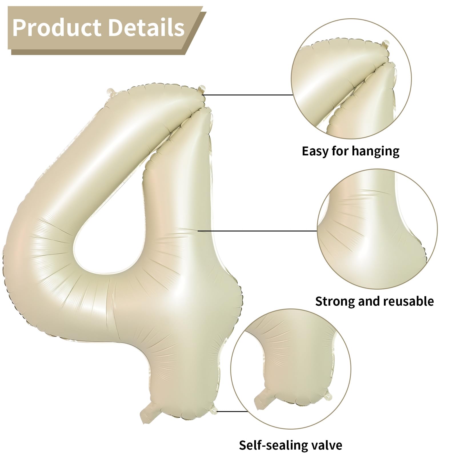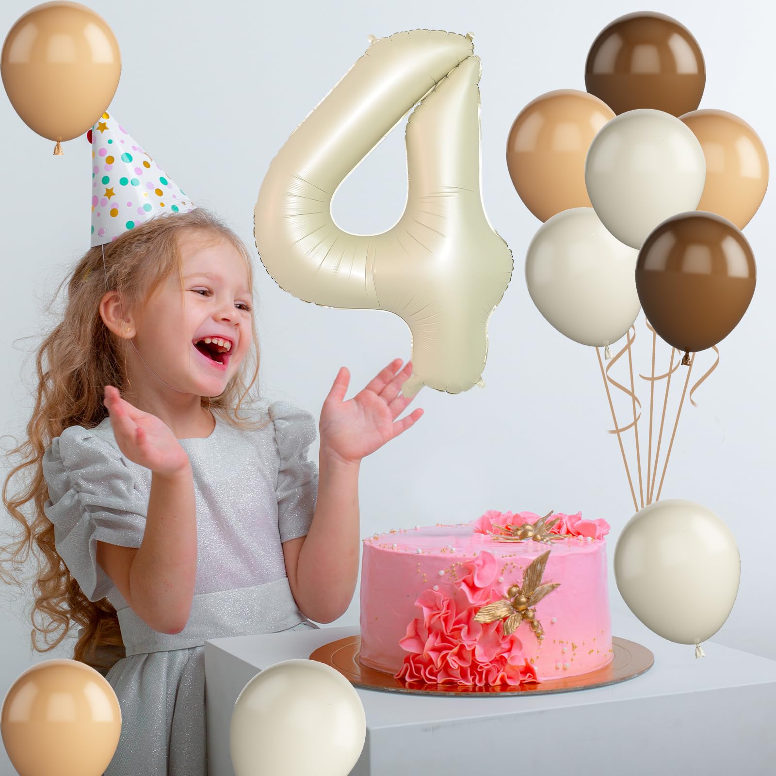 Product Contents: This 4th birthday balloons set includes a 40 inch cream white number balloon, 4 pcs 12 inch retro apricot balloons, 4 pcs 12 inch sand white balloons, 2 pcs 12 inch retro brown balloons, and 1 pc 32 feet of white ribbon