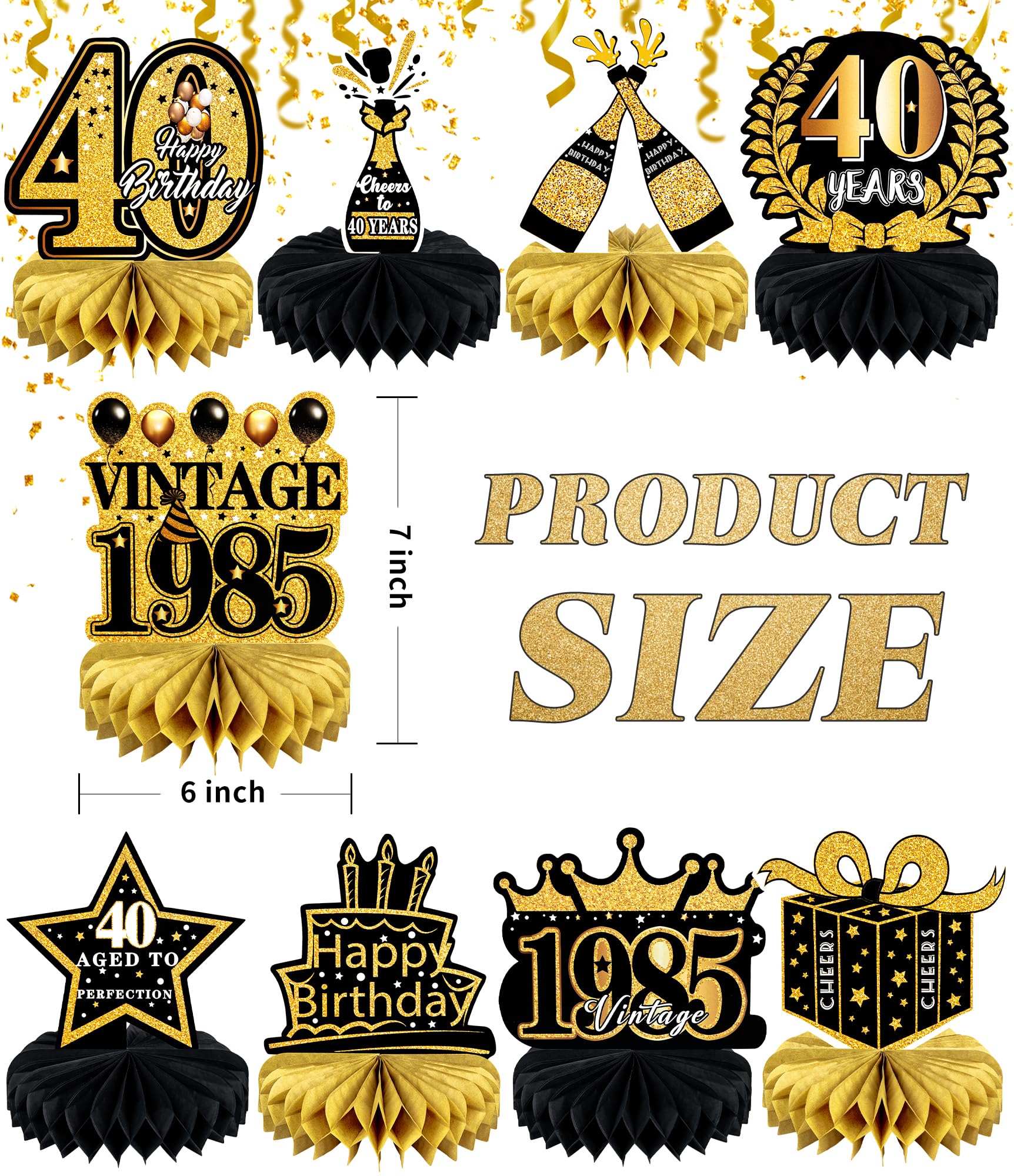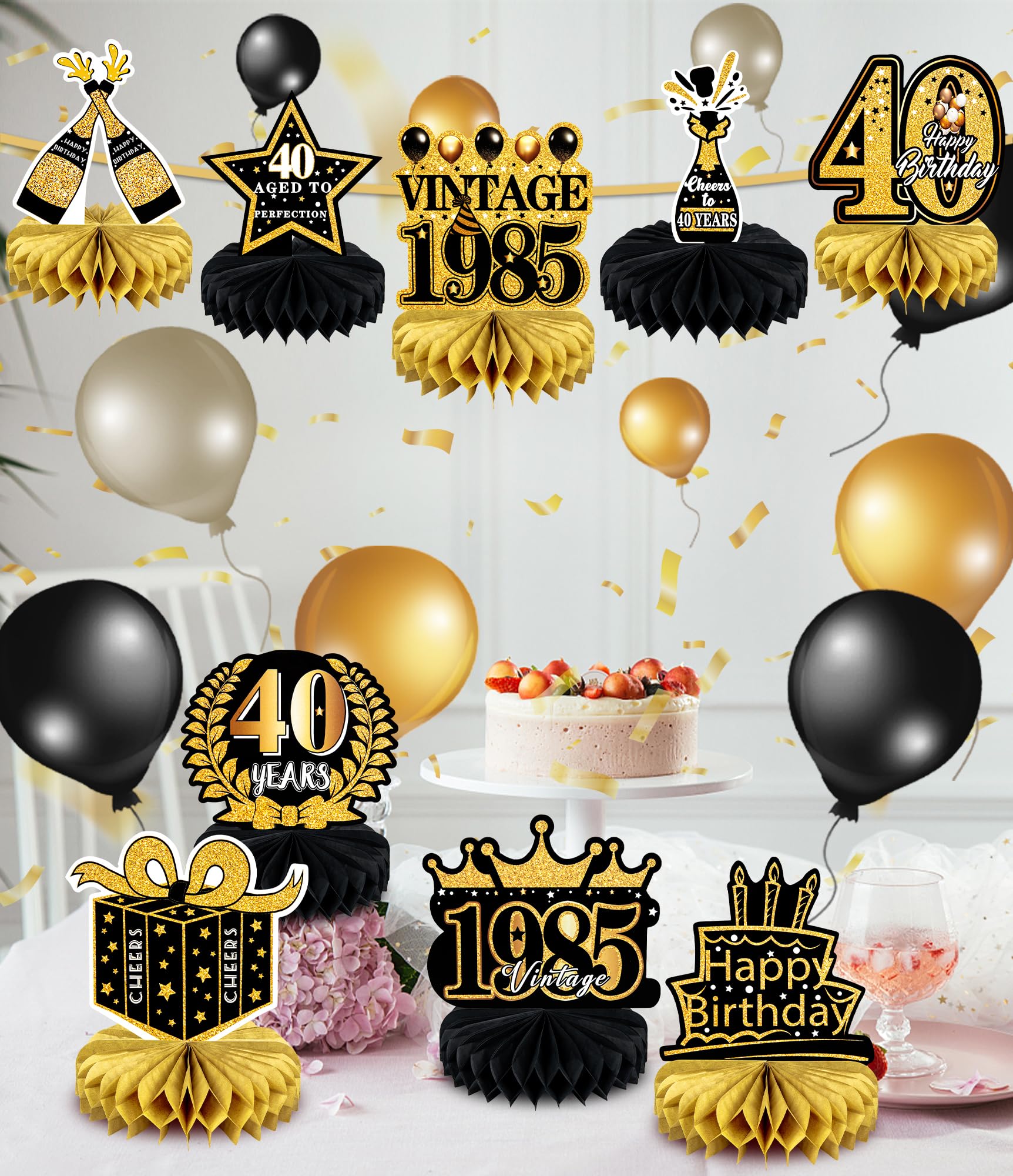 💖40th BIRTHDAY PACKAGE INCLUDES: Our 40th birthday decorations including 9 patterned cardboard and 9 paper honeycombs. These decorations exquisitely designed with interesting birthday elements. It is very suitable as a decoration for your 40th birthday party decorations, you can place it on the table or hang it with a clip