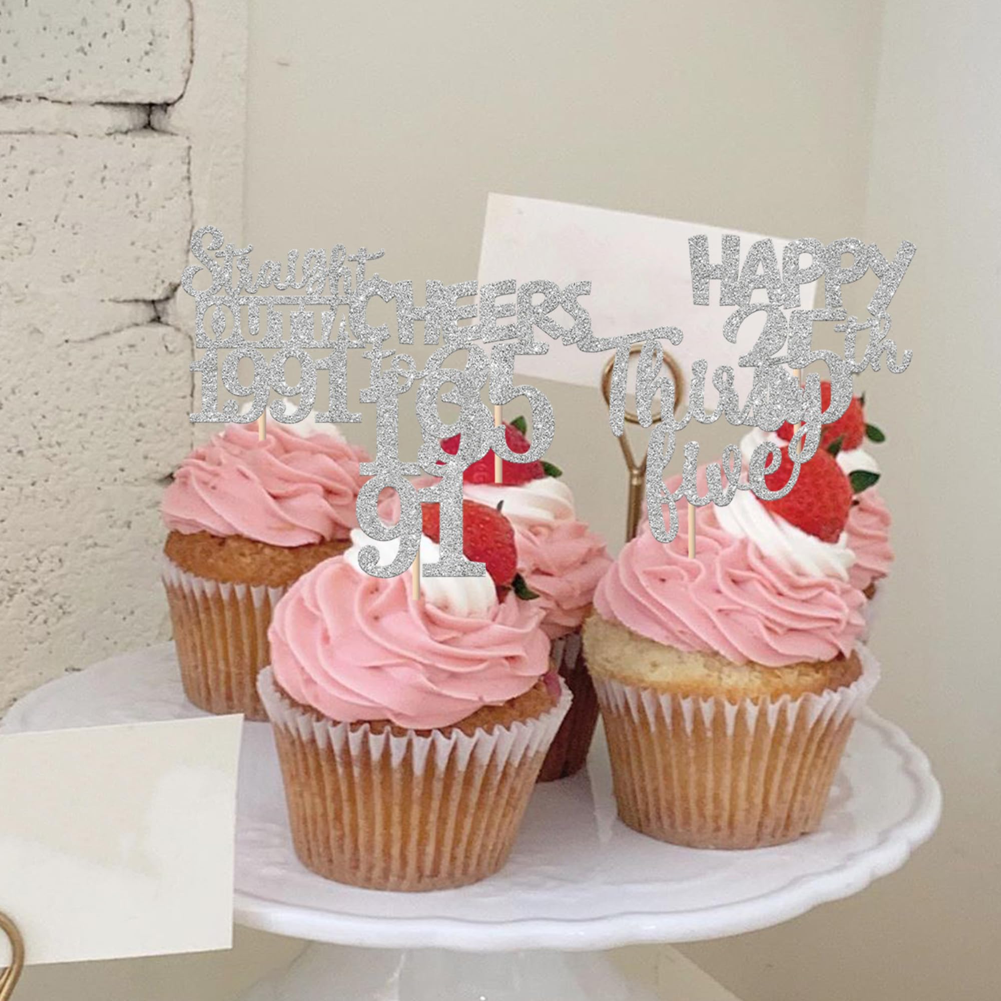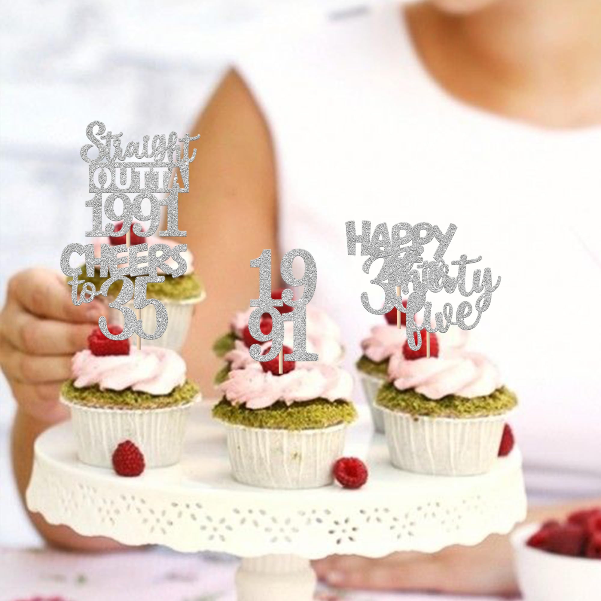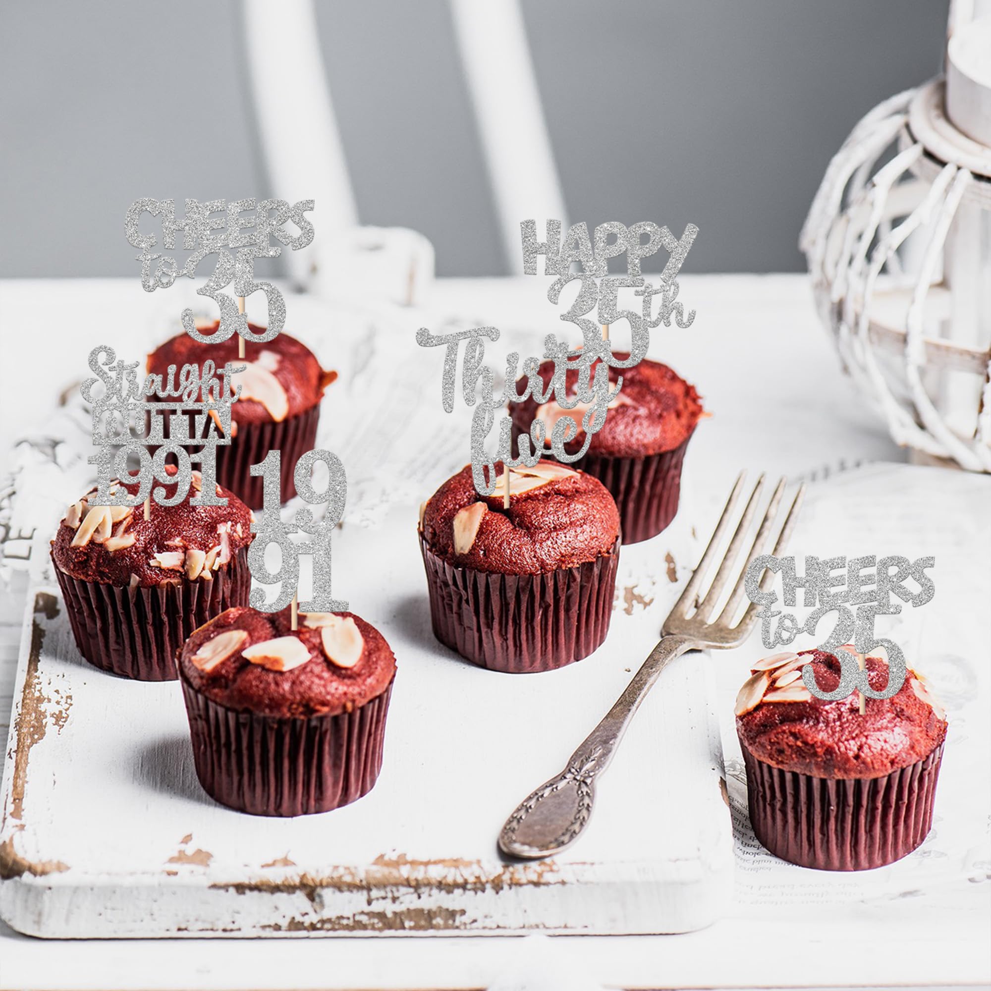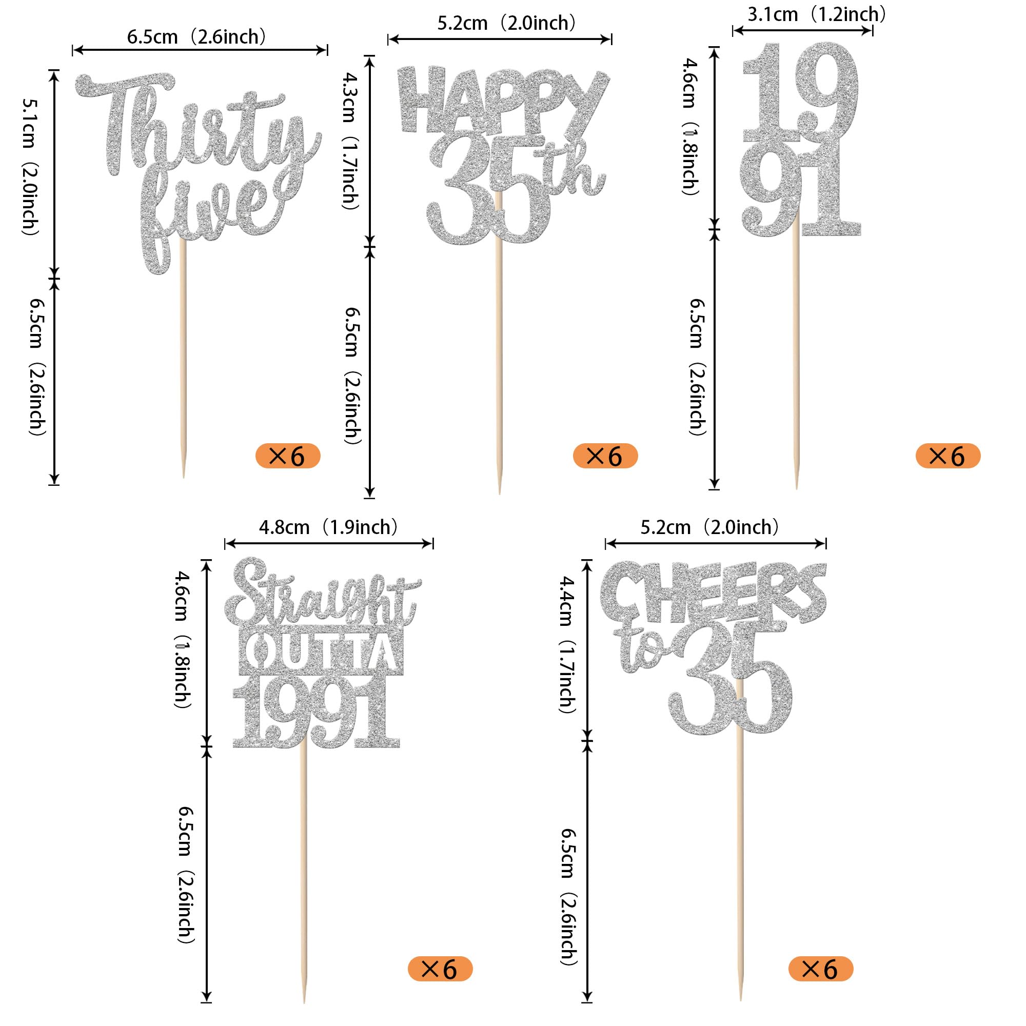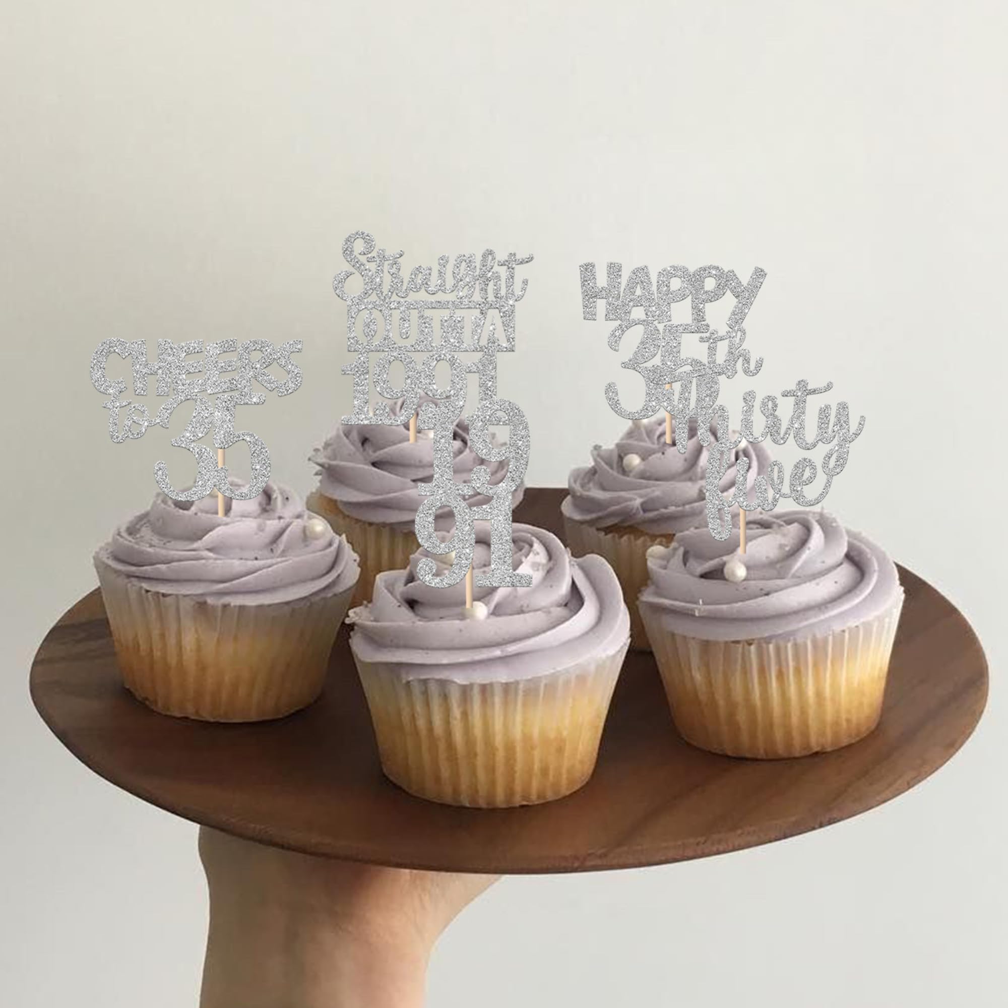 30 PCS 35th Birthday Cupcake Toppers Glitter Thirty Five Happy 35th Straight Outta 1991 Cupcake Picks for Cheers to 35 Fabulous 35th Birthday Anniversary Party Cake Decorations Supplier Silver Perfect for happy 35th bithday theme party, straight outta 1991 theme party, 35th wedding anniversary theme party,cheers to 35 years theme party cupcake decorations supplies. Pack of 30 pcs, 6 pcs of each design. The size is 2.5*4.6/ 2.2*4.6/ 1.9*4.6/ 2.1*3.9/ 1.2*4.6 inch ( with stick ) Made of high quality paper card stock,thick and sturdy. These straight outta 1990 cupcake toppers are one side glitter, another side is white, and they are intended for decoration only, please do not put them in oven or microwave. If the item you received has any defects, please contact us immediately. we will deal with it within 24 hours.