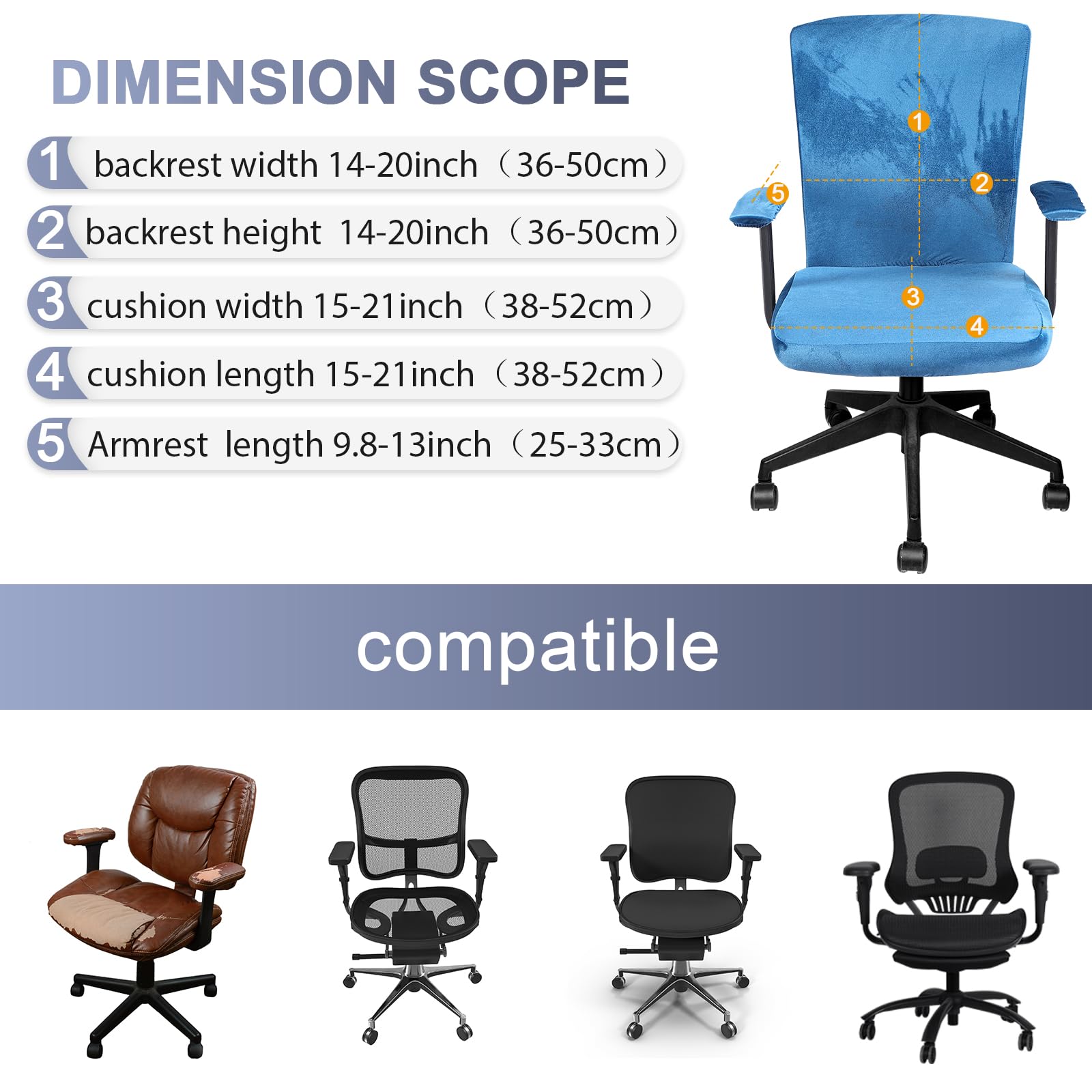 Size Information: this office chair seat cover is about 38 cm/ 14.96 inches to 48 cm/ 18.9 inches wide, and the length of it is also about 38 cm/ 14.96 inches to 48 cm/ 18.9 inches; And office chair back cover is about 38 cm/ 14.96 inches to 46 cm/ 18.11 inches wide, about 38 cm/ 14.96 inches to 48 cm/ 18.9 inches high; Please carefully check the detailed size information in the shown pictures, and also measure your seat before purchase