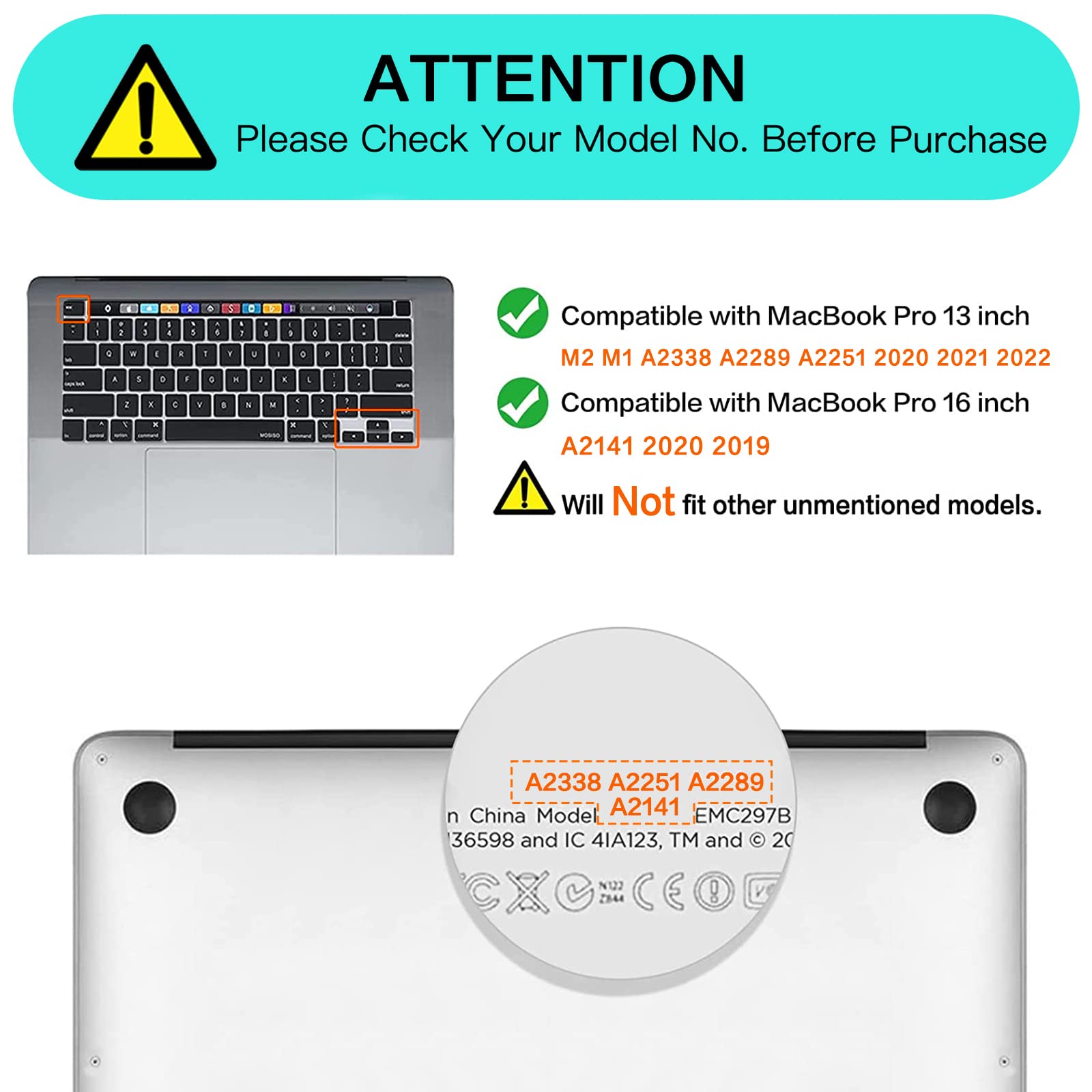 Designed to be compatible with MacBook Pro 13 inch Release in 2023 2022 2021 2020 (models: M2 M1 A2338 A2251 A2289 -- MNEP3LL/A, MNEQ3LL/A, MNEH3LL/A, MNEJ3LL/A, MYD92LL/A, MYDC2LL/A, MYD82LL/A, MYDA2LL/A, MXK32LL/A, MXK62LL/A, MXK52LL/A, MXK72LL/A, MWP42LL/A, MWP72LL/A, MWP52LL/A, MWP82LL/A); Compatible with MacBook Pro 16 inch with Touch Bar & Touch ID & Retina Display Release in 2020 2019 (model: A2141 -- MVVJ2LL/A, MVVL2LL/A, MVVK2LL/A, MVVM2LL/A).