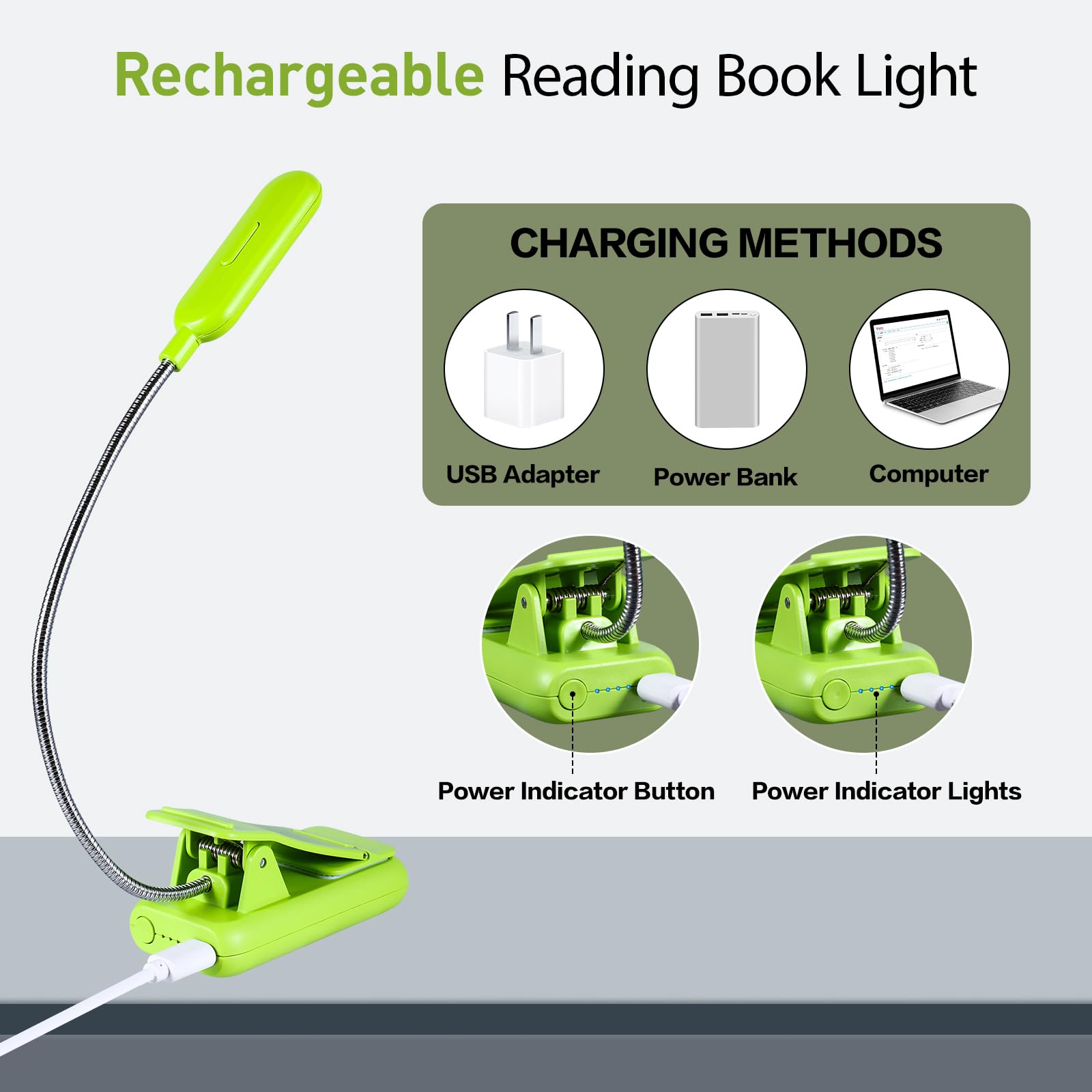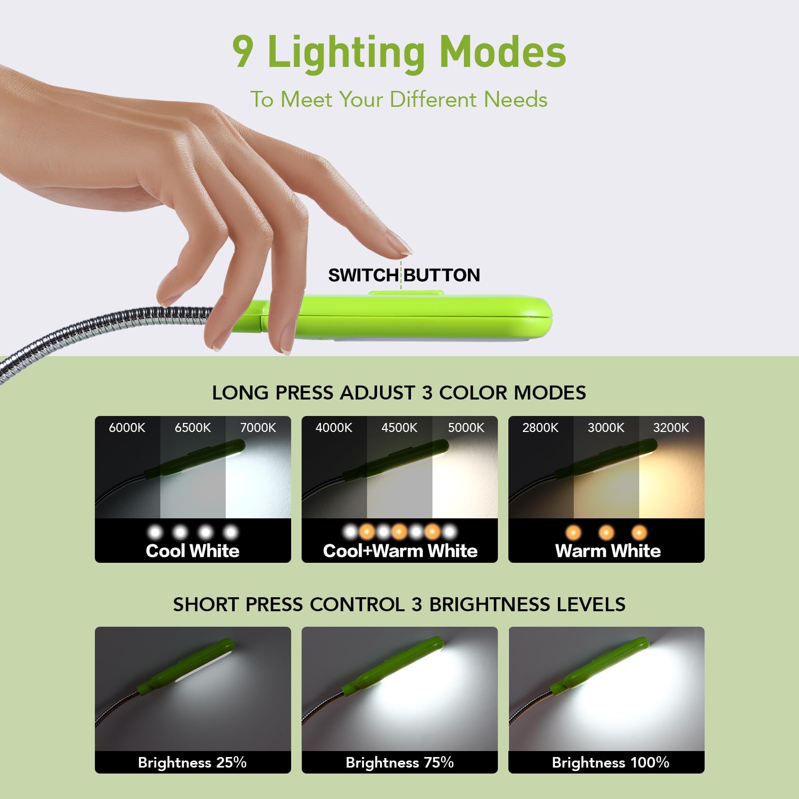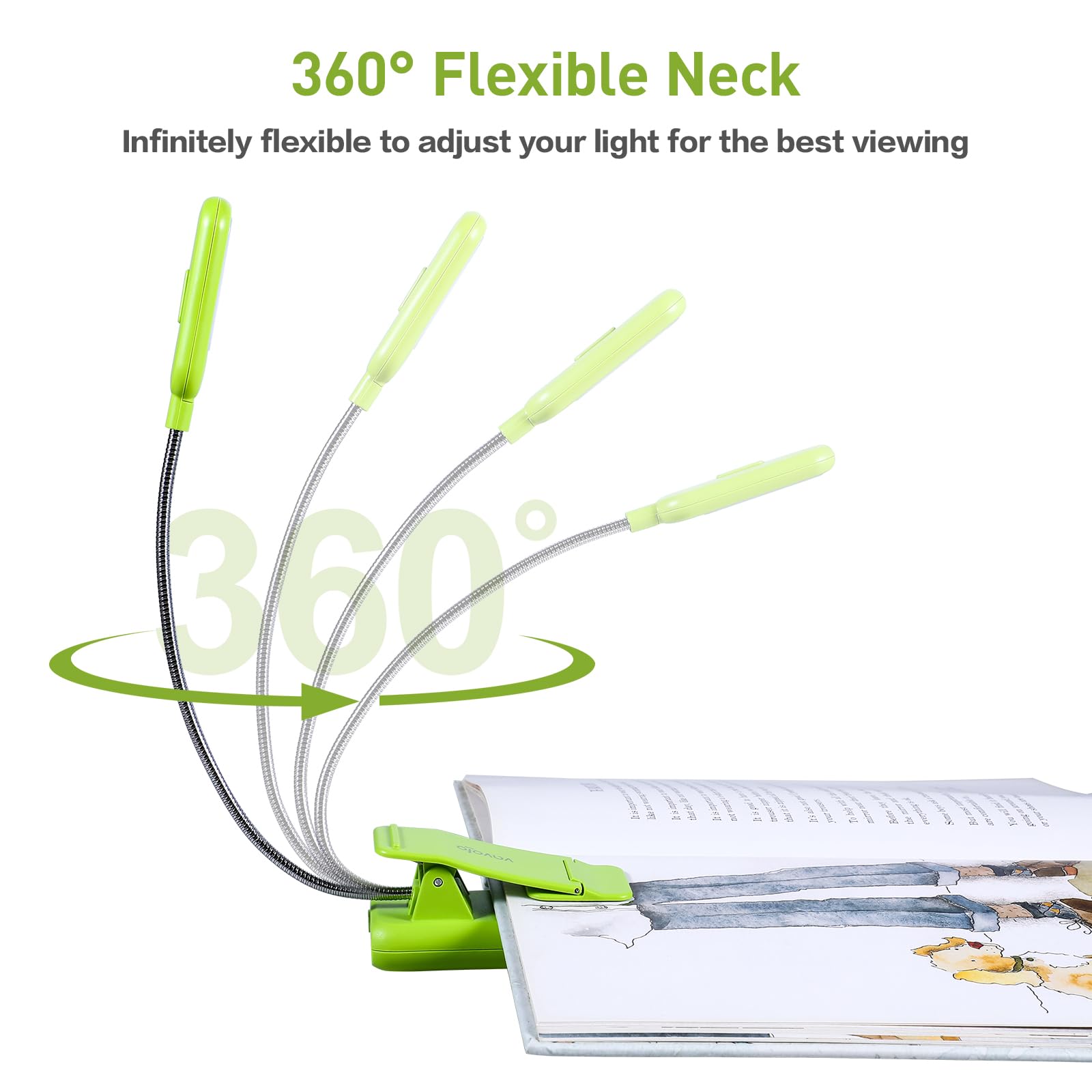 【7 Led & 9 Color Temperature】This new pretty neon green book light is perfect for everyone which can increase their reading enthusiasm. Meantime, parents will also love the book lights when working, reading or accompany their kids. The reading light is equipped with 7 upgraded smd leds, 9 different color temperature modes: warm white(2800k/3000k/3200k), warm cool white(4000k/4500k/5000k) and cool white(6000k/6500k/7000k)