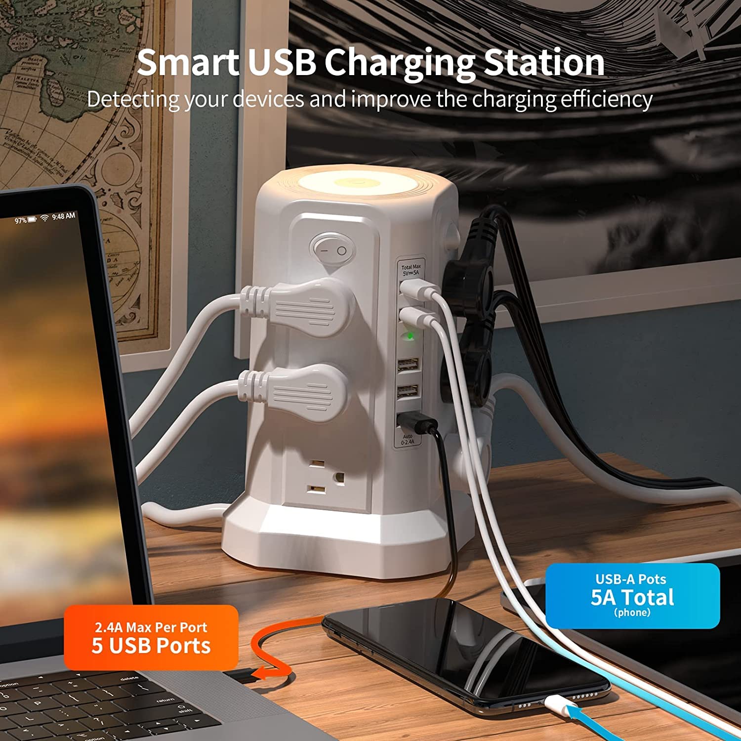 Smart Power Strip with Night Light: PASSUS multi-plug tower with a white light mode that features three brightness levels to let you choose the right amount of light for your own needs