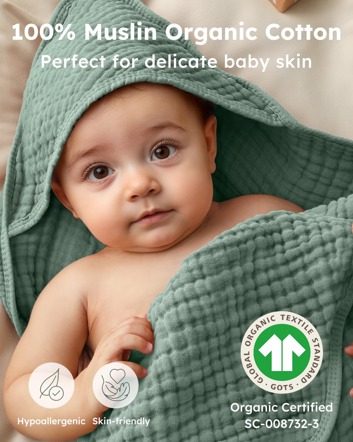 [Excellent Durability] - The 6 layers thickness muslin design is long-lasting enough for everyday use. Sized in 32 x 32 inches, the hooded baby towels are suitable for newborns, infants, toddlers, and small kids up to 3 years old.