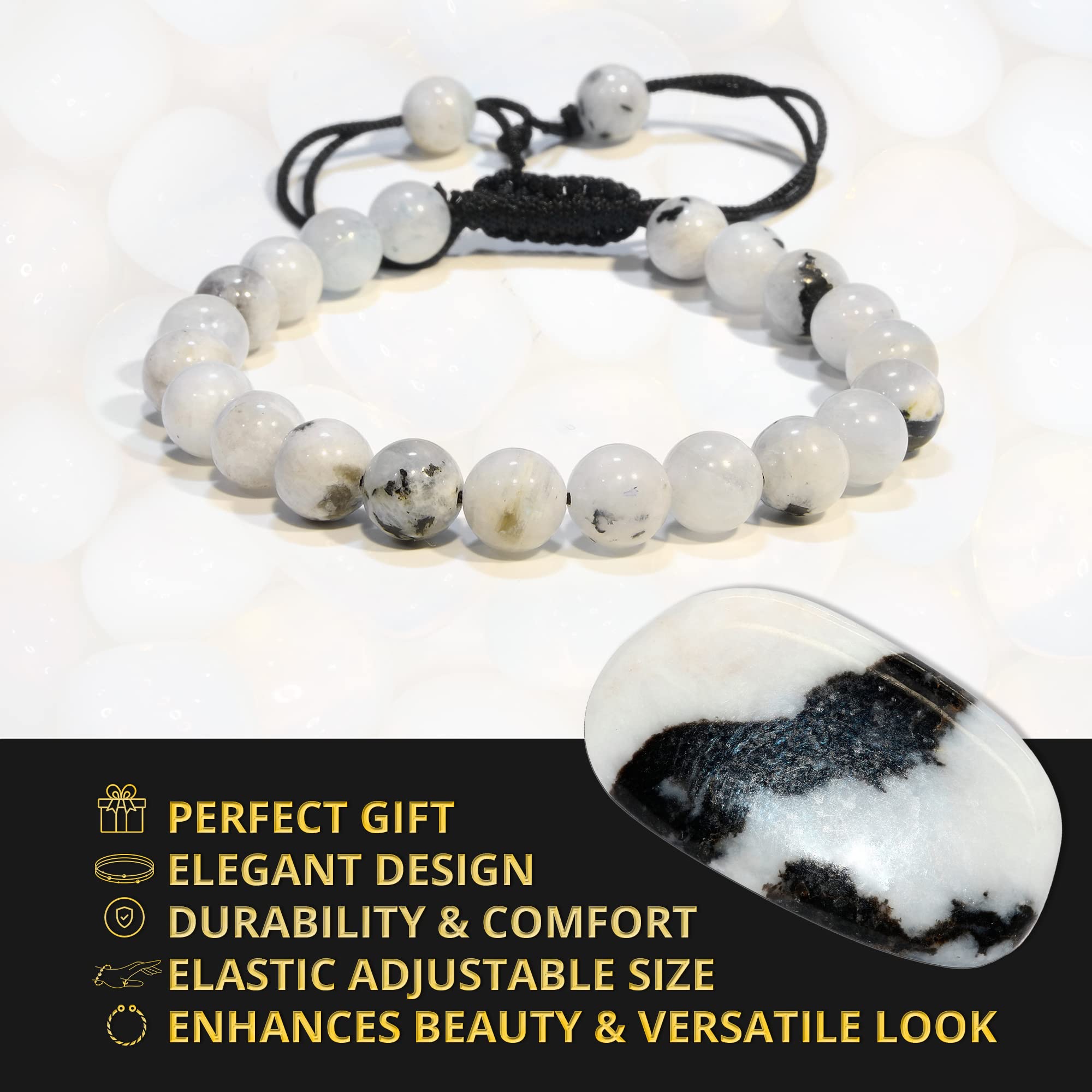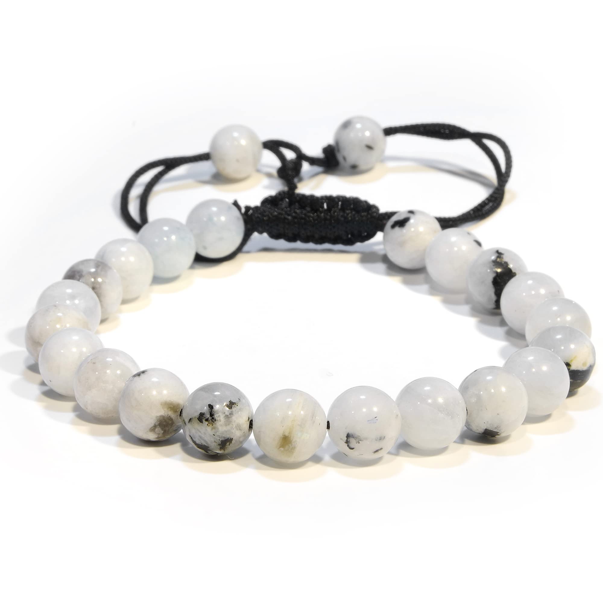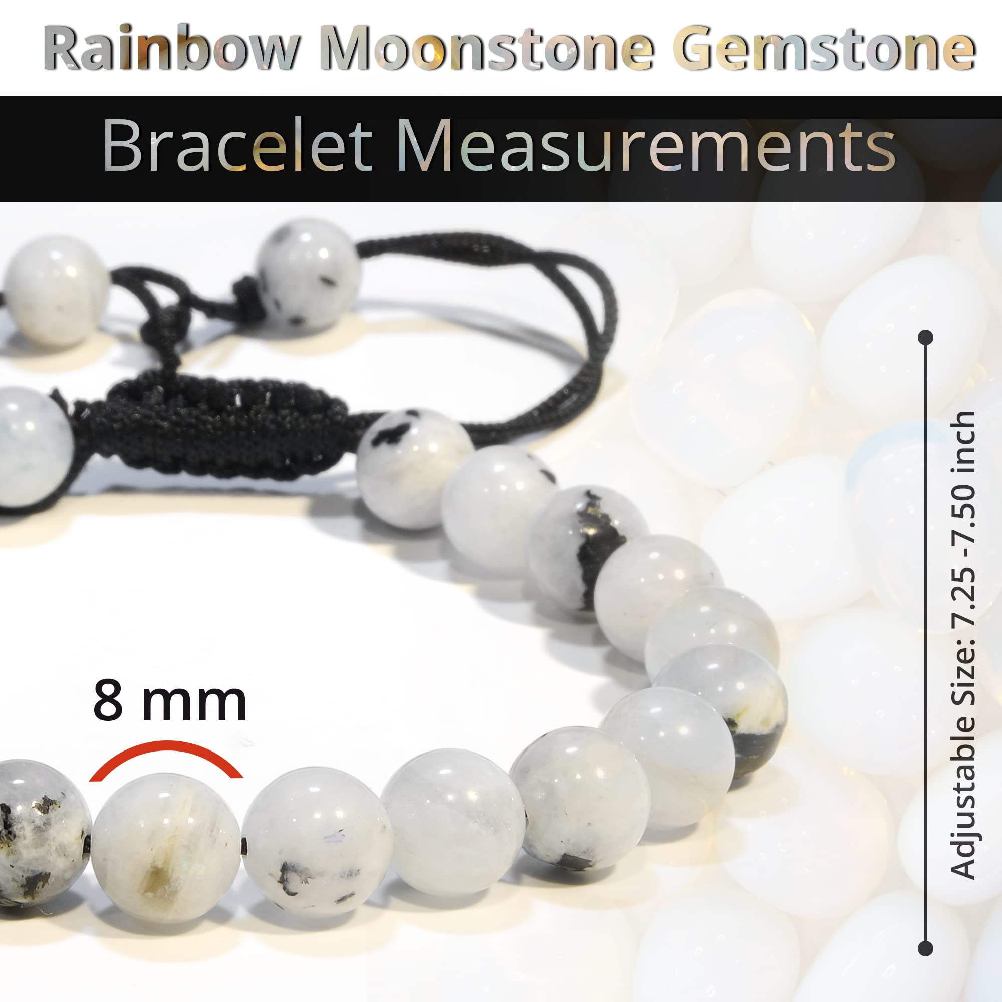 Rainbow Moonstone: Our healing bracelets for women and men are made with high-quality, carefully selected real gemstones, smoothly rounded to perfect 8mm beads and an elastic string with macrame closure for comfortable and long-lasting wear.