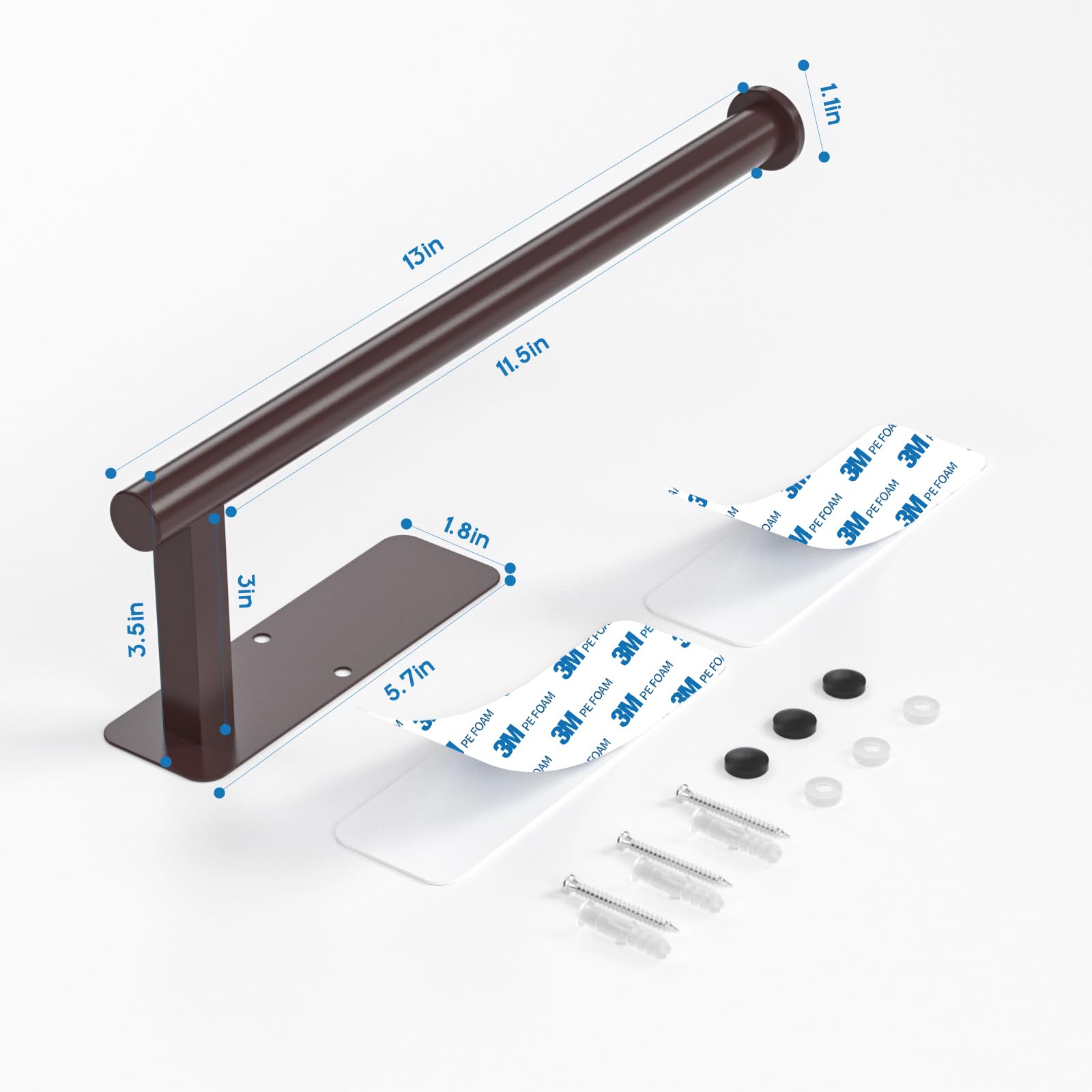 【Paper Towel Rack Material】: Under counter paper towel holder made of SUS304 stainless steel, wear-resistant, corrosion resistant, and waterproof. Self adhesive paper towel holder total bar length: 13 inches, perfectly fits the USA standard kitchen paper towel (11’ 6’ IN) and also fits different sizes of rolls. Feel free to choose this product