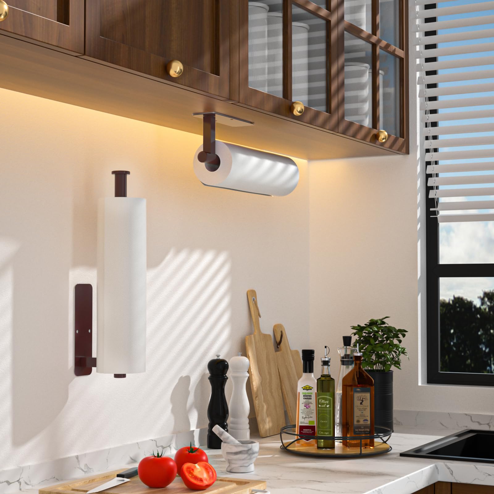 【Space Saving】: Wall mount paper Towel holder can attach horizontal or vertical, under cabinet paper towel holder can be used to organize your kitchen clutter or kitchen supplies, such as plastic wrap, aluminum foil, mugs, etc, sturdy and durable, perfect solution to save your space