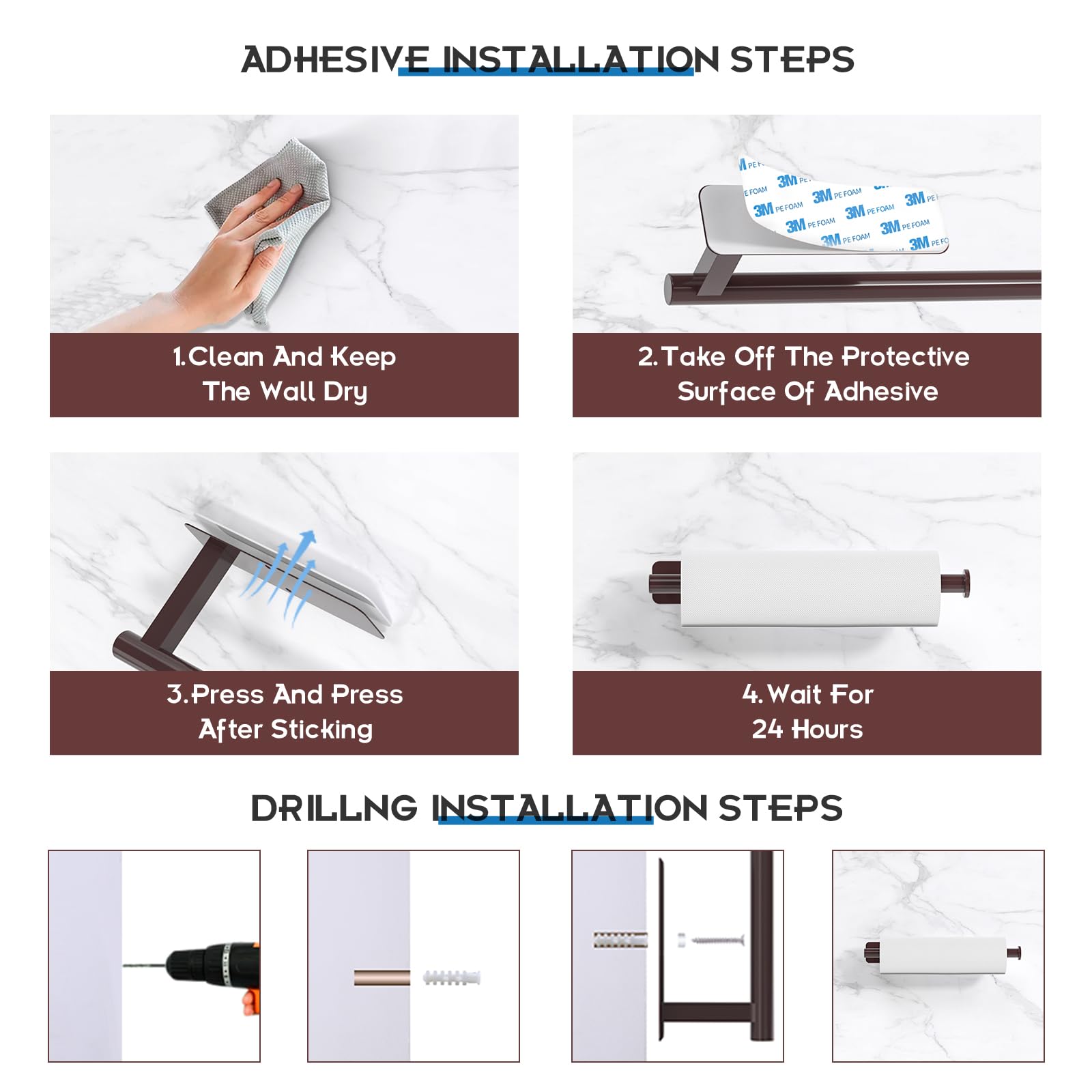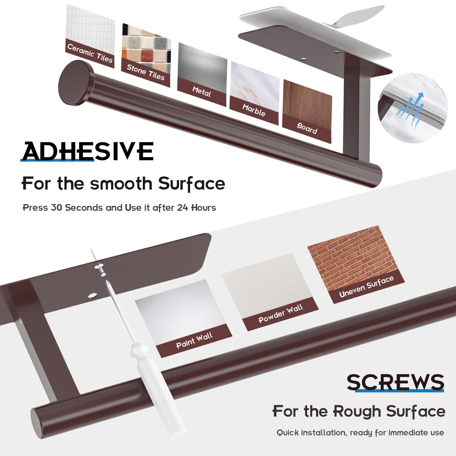 【Two Installation Options】: Applicable for both adhesive and screws. Adhesive design suits smooth surfaces. Stick on anywhere you want with strong adhesive, press it for about 20 seconds then wait for 24 hours. On rough surfaces, paper towel holder wall mount can be installed with screws