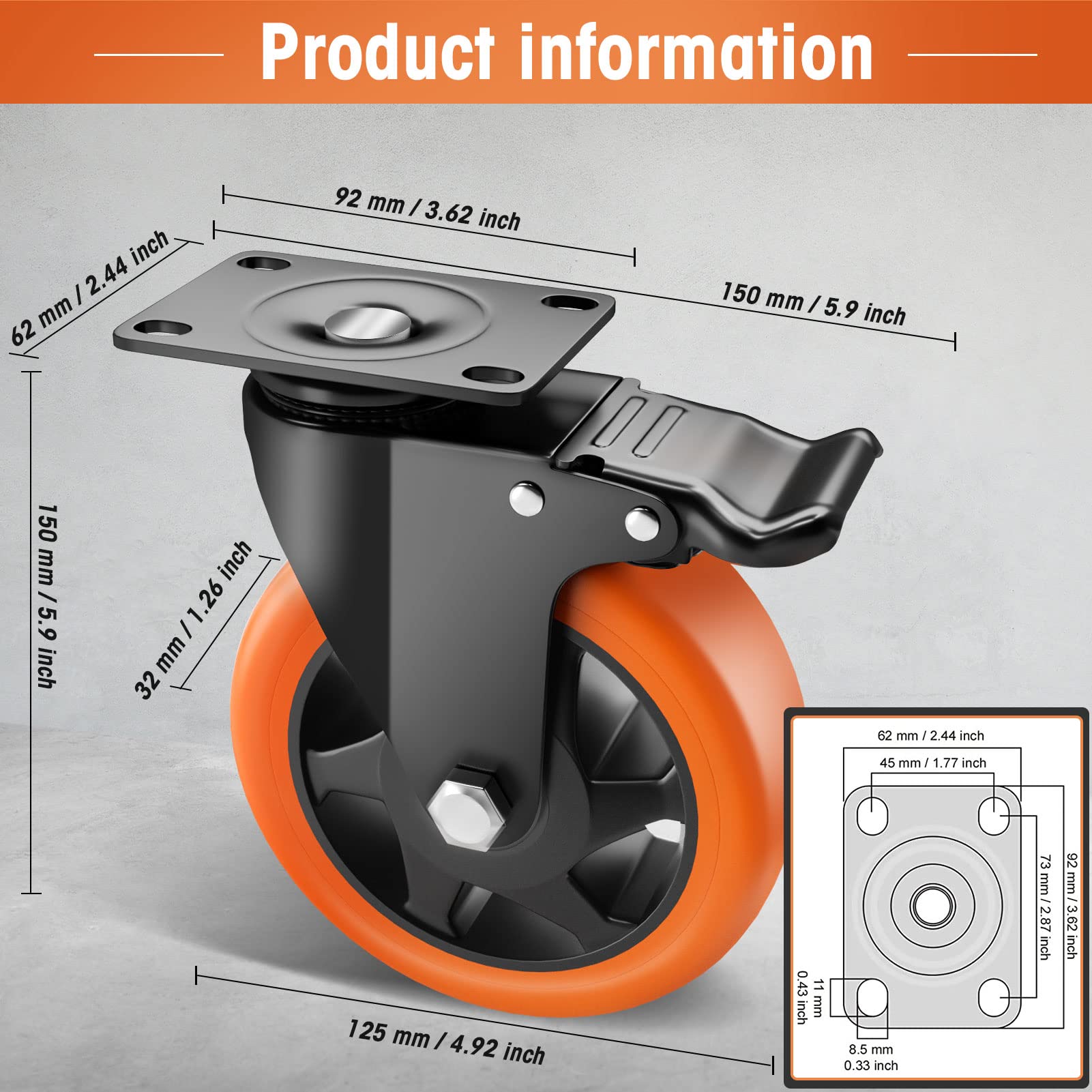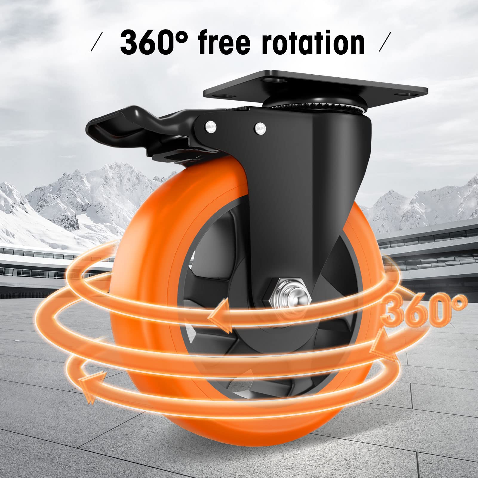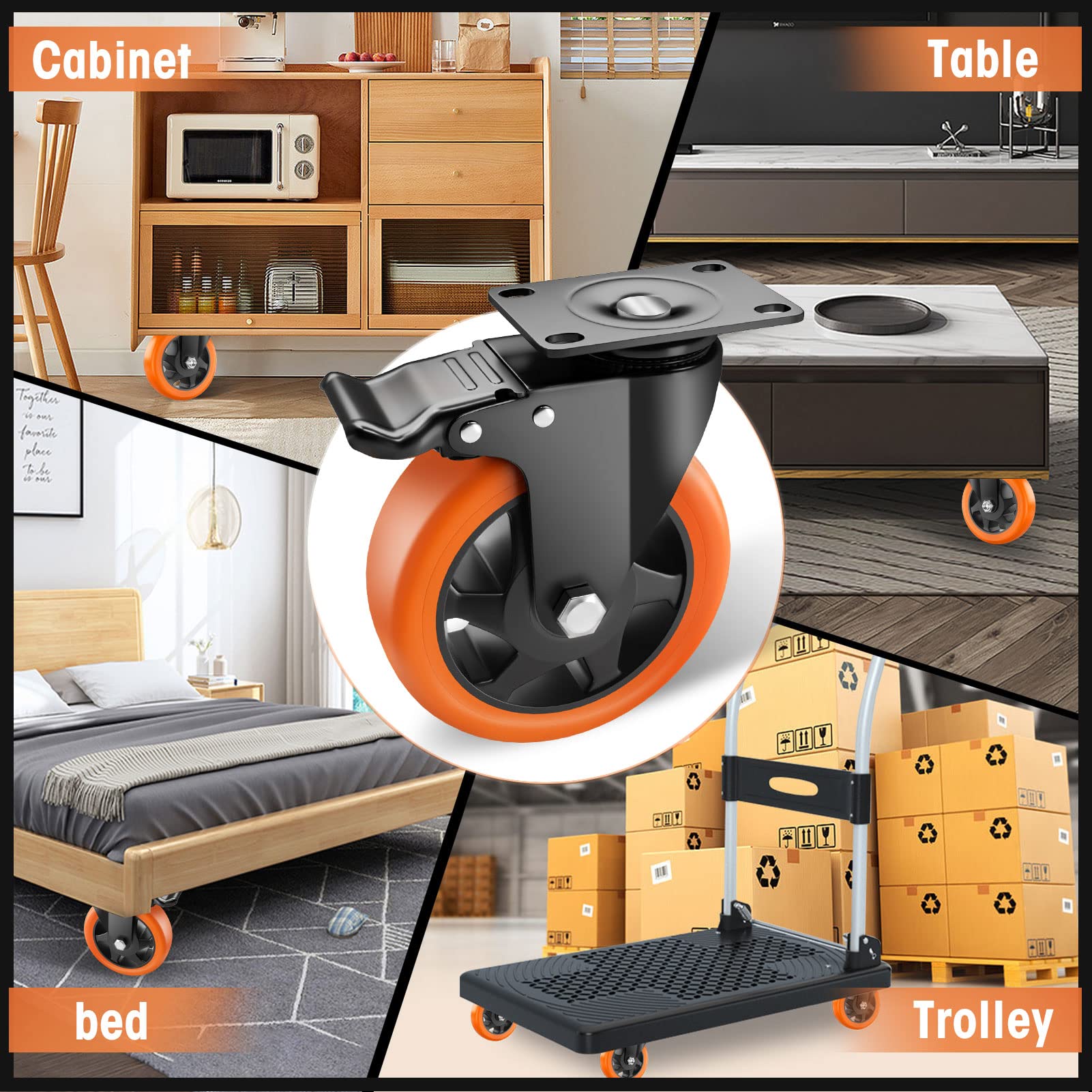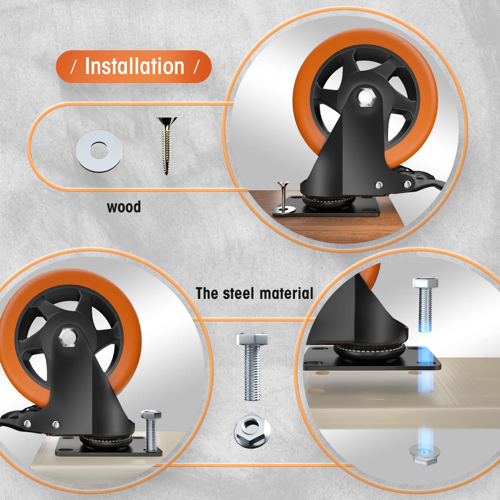Heavy Duty Casters: The load capacity is strong, each 5 inch caster can carry 475 pounds, 4 castors can carry 1425 pounds to 1900 pounds, using double bearings, polyurethane, silent, no trace, protect the ground