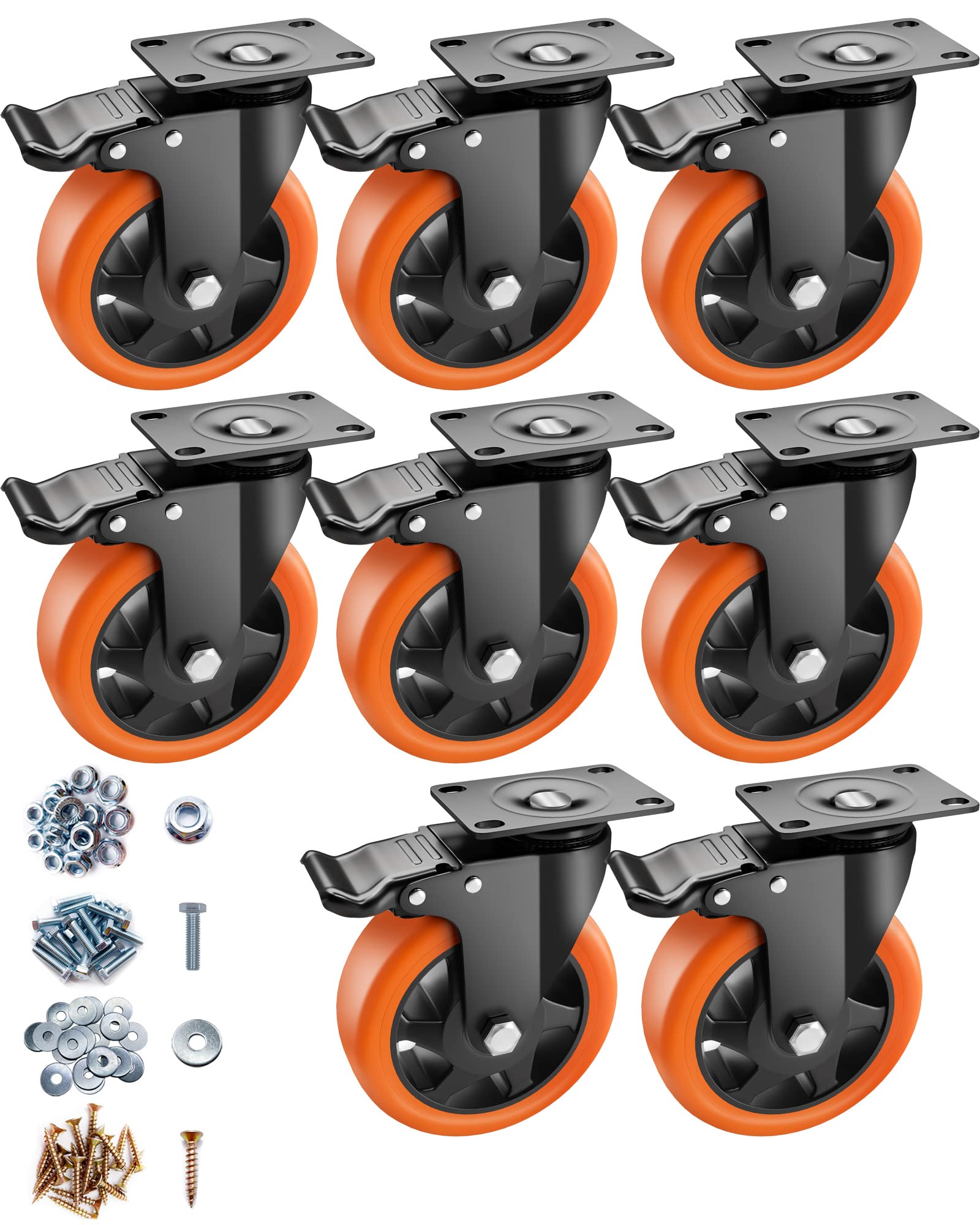 Casters Set of 8: Due to the convenience of customers, we have 8 casters in a set, which are delivered with pointed screws with washers, flat head screws with nuts. Each caster has a load of 475 pounds, and the quality is stable.