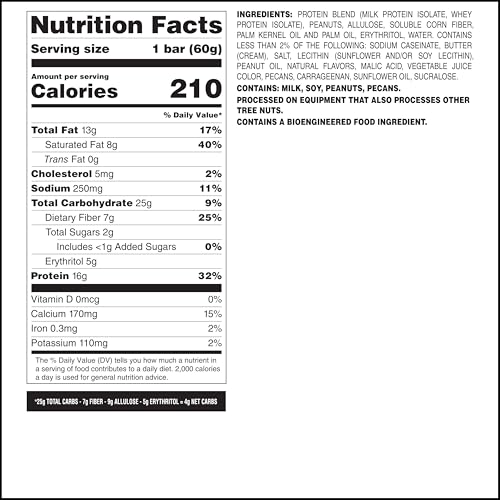 PROTEIN FORWARD. 16g of protein, 2g of sugar, and 4g of net carbs per serving. Support your ftness goals and enjoy a crunchy protein bar with the deliciously sweet & savory favor of PB&J.
