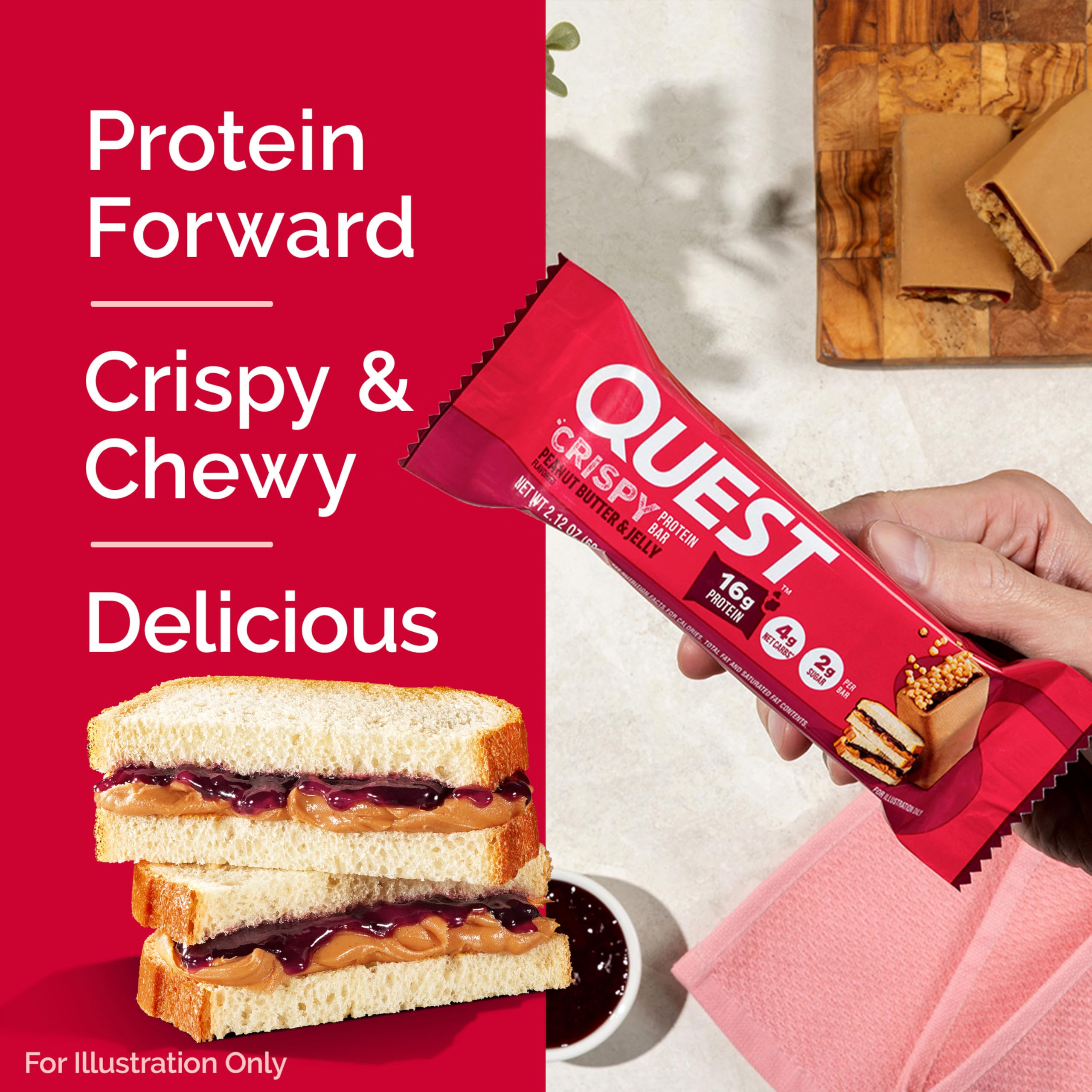 AT HOME OR ON-THE-GO. Quest Crispy Peanut Butter & Jelly Flavored Bars with 16g of grab & go protein are just right for your morning commute, as a tasty treat at your desk, or a delicious way to refuel after a workout.