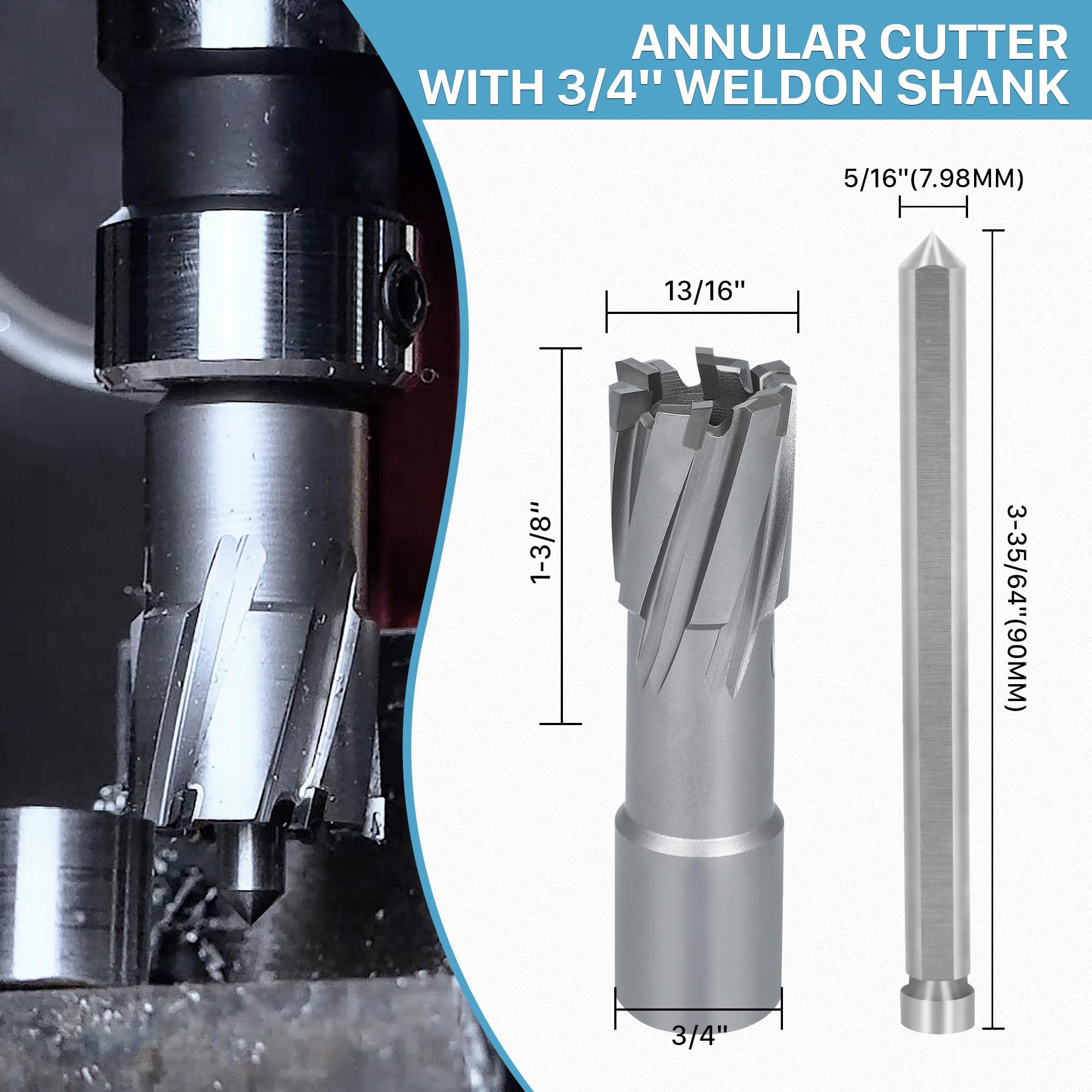 【Specifications】 - KEENTECH Annular Cutter features a premium carbide cutting edge for outstanding durability, making it ideal for drilling harder materials like stainless steel. It offers a 13/16" cutting diameter and a 1-3/8" cutting depth, and comes with a free pilot pin. The 3/4" weldon shank design is compatible with various magnetic drills, including but not limited to Alfra, Evolution, Dewalt, Vevor, Zelcan and Hougen.