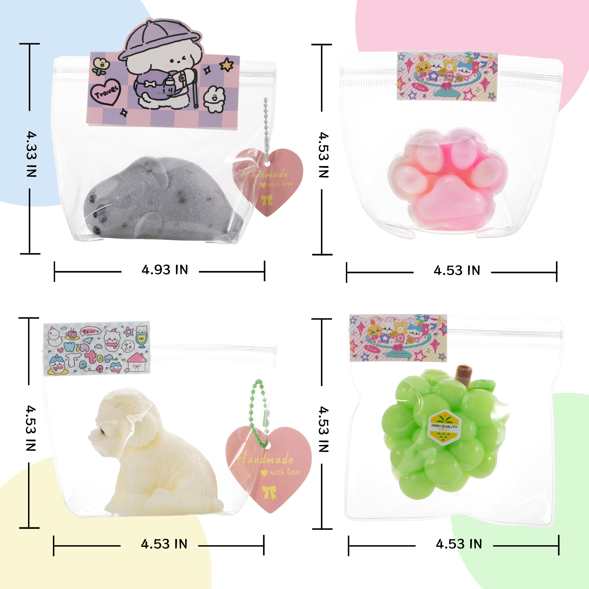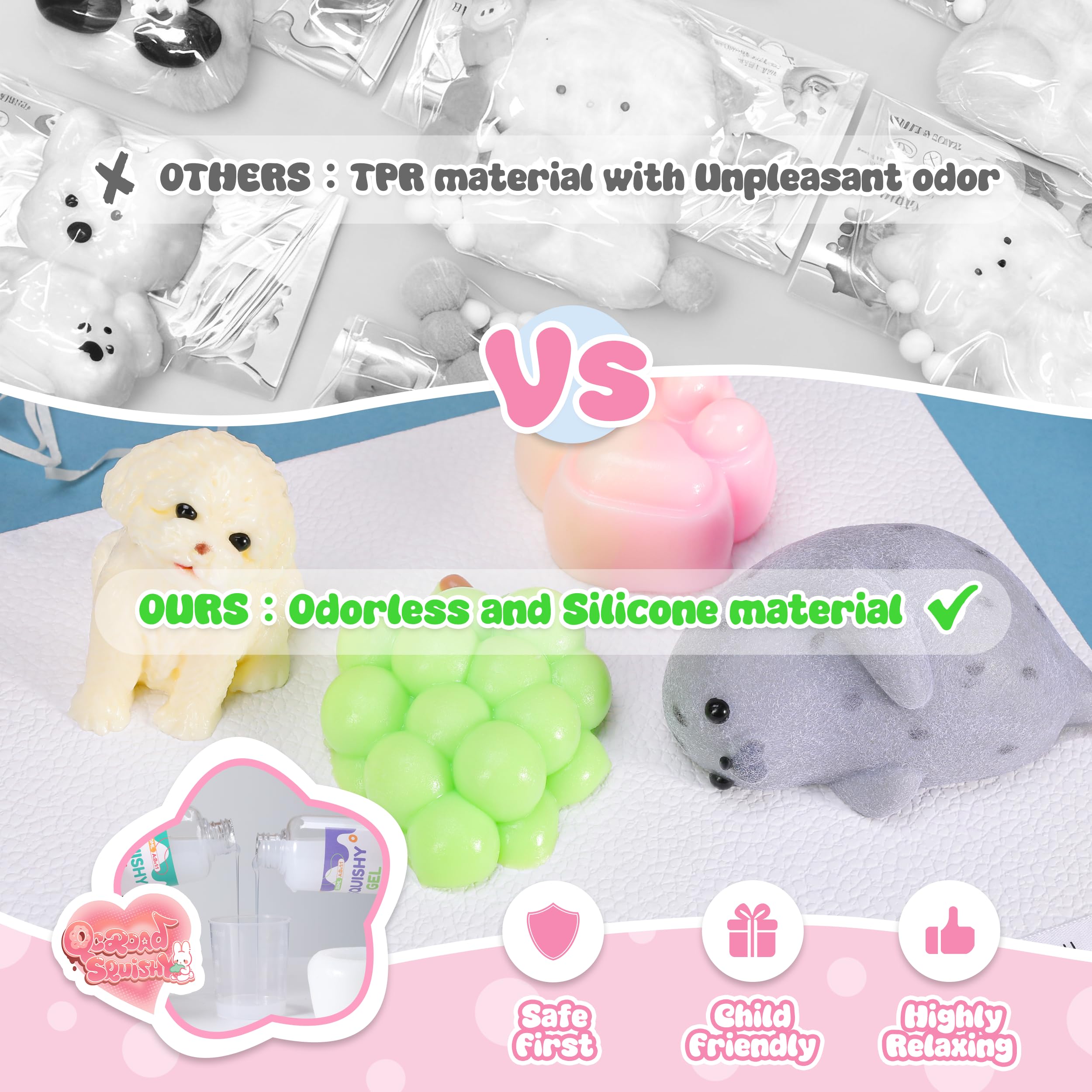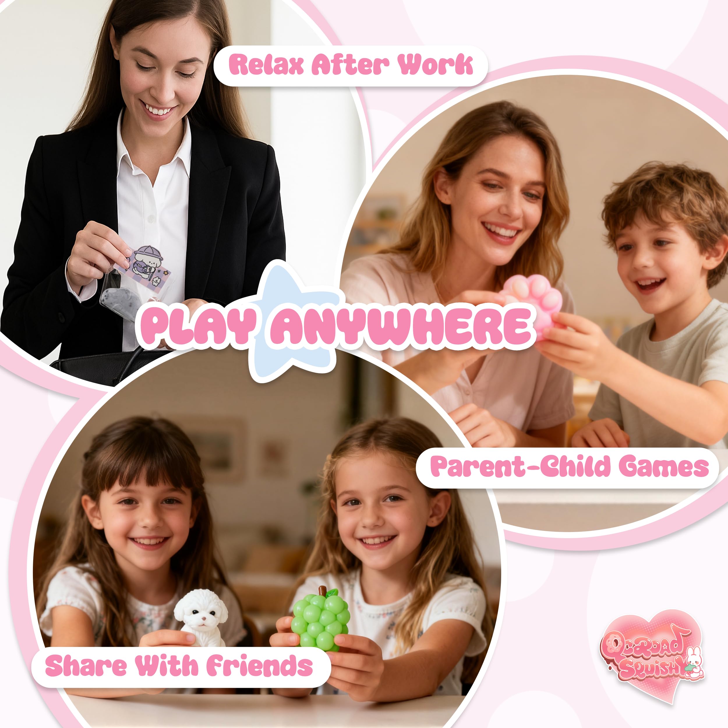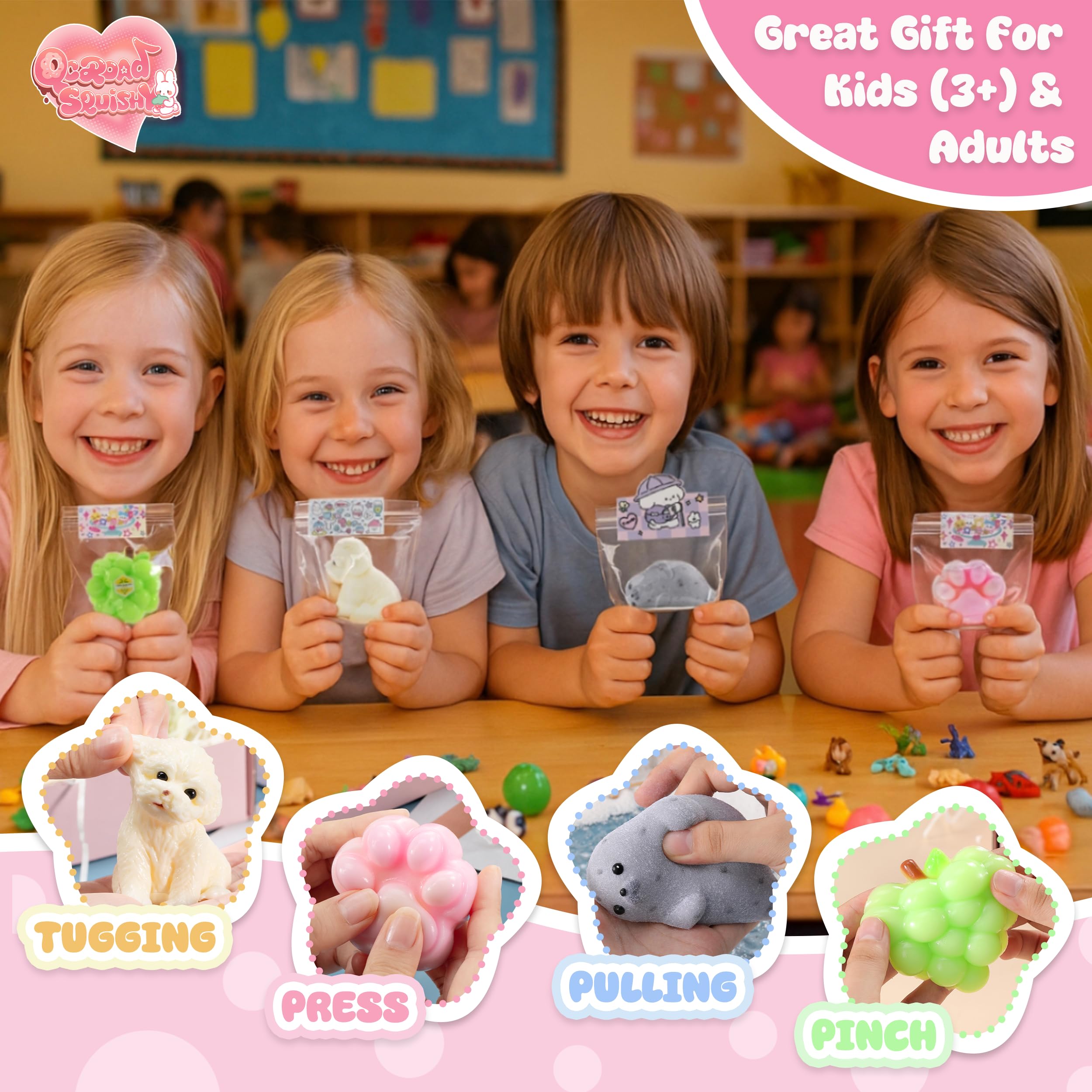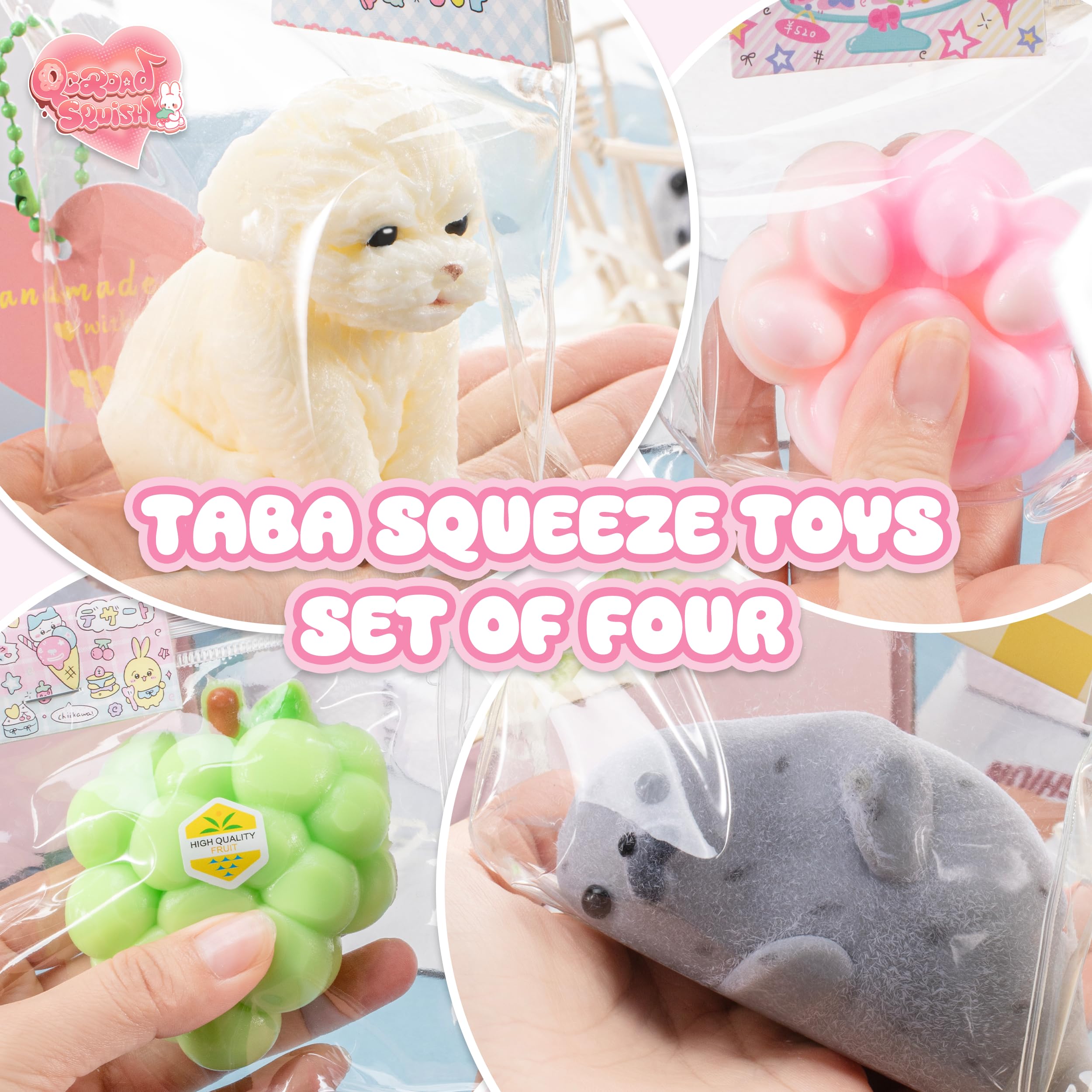 Colorful Handmade Squishy Set for Amazing Stress Relief This QCROAD SQUISHY 4-pack includes adorable puppy, seal, cat paw, and grape designs, all crafted from high-quality, skin friendly silicone. Great as fidget toys for kids and adults, these squishies are incredibly soft and sticky, reusable, and provide a satisfying squeeze. Excellent for birthday goodie bags, Christmas gifts for grandkids, or everyday stress relief.