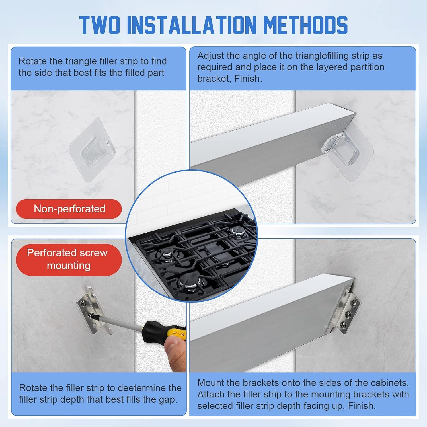 What Will You Get: This silver stove back gap covers for backsplash behind stove includes 1 Triangular fill strip, 4 installation accessories, 6 screws, and 1 Installation instructions. And the trim kit for slide in range are great addition to your kitchen, and great gifts to prevent sludge, debris, spills and other things from falling in between the seams of your stove, stove gap guard, gas, stove top, cooktop, countertop, oven, home kitchen counter, desks and other impossible to clean places