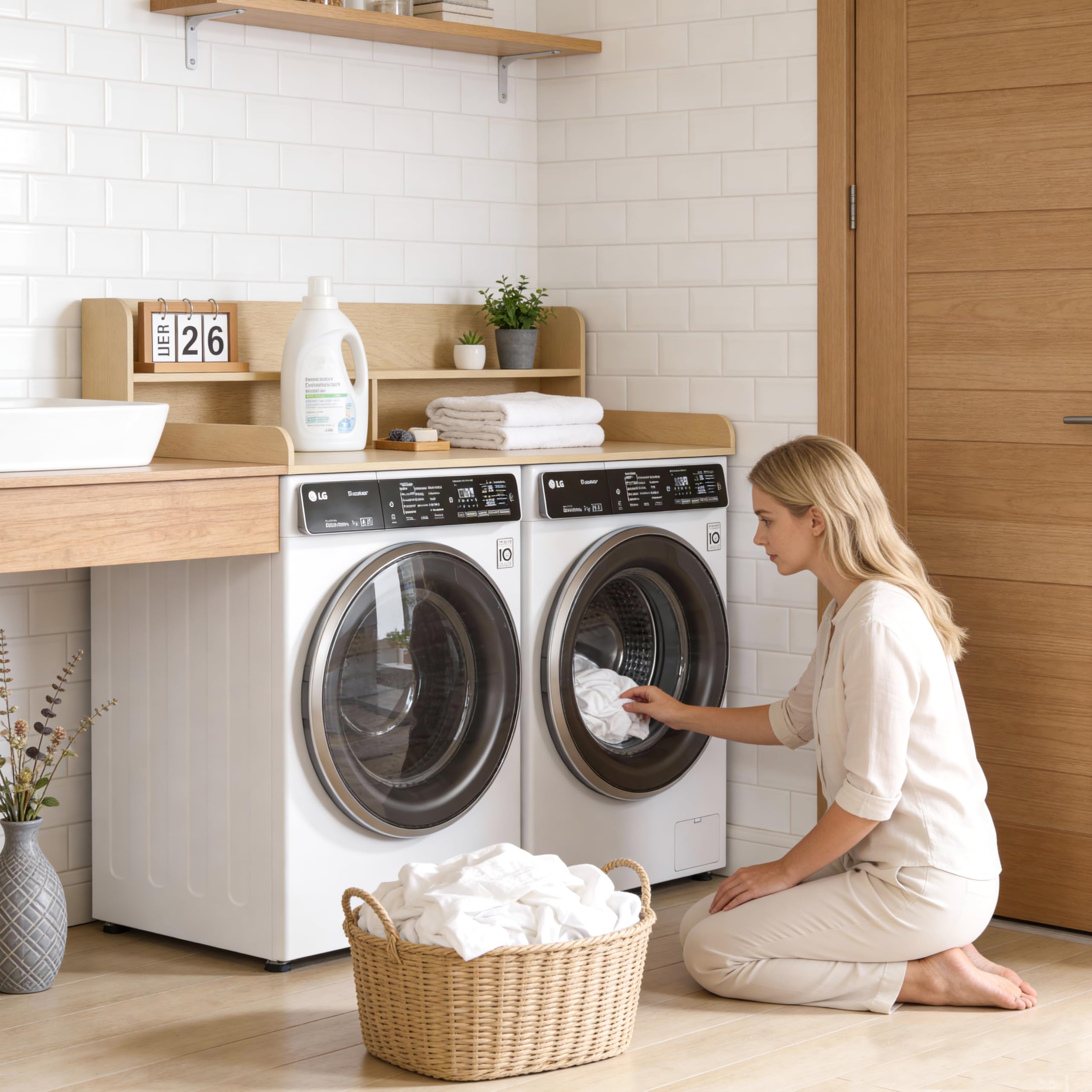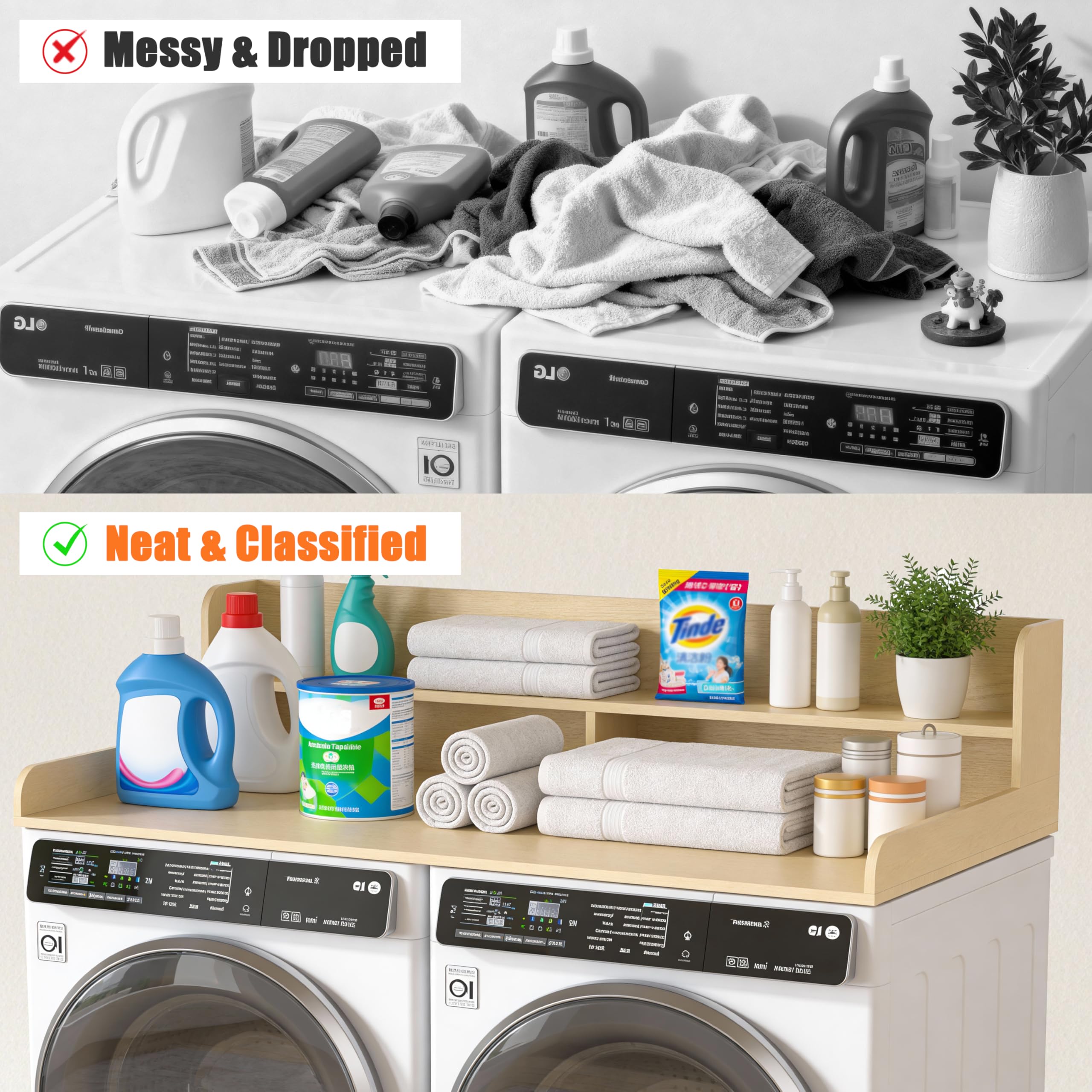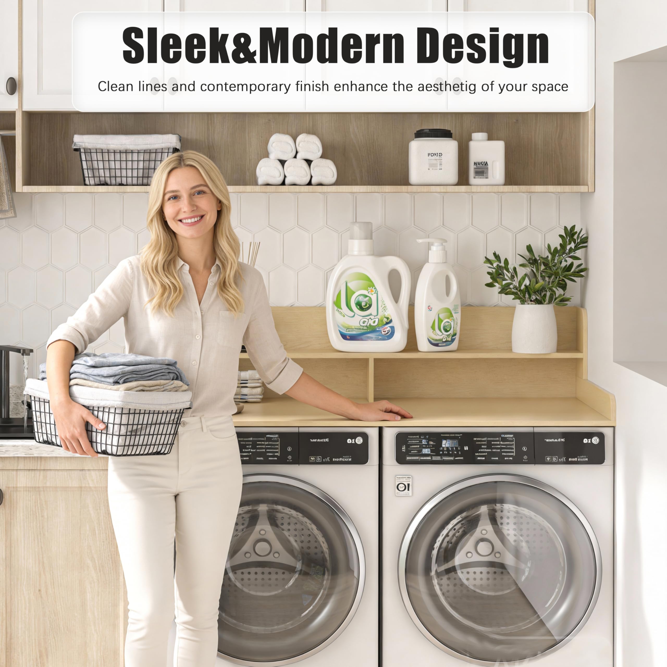 【Space Optimization】The Washer Dryer Countertop design fully considers the convenience of use and provides reasonable operation space and storage area. You can easily place washing supplies, clothes drying racks and other items, reduce bending and moving when taking them, and improve the efficiency of washing and drying.