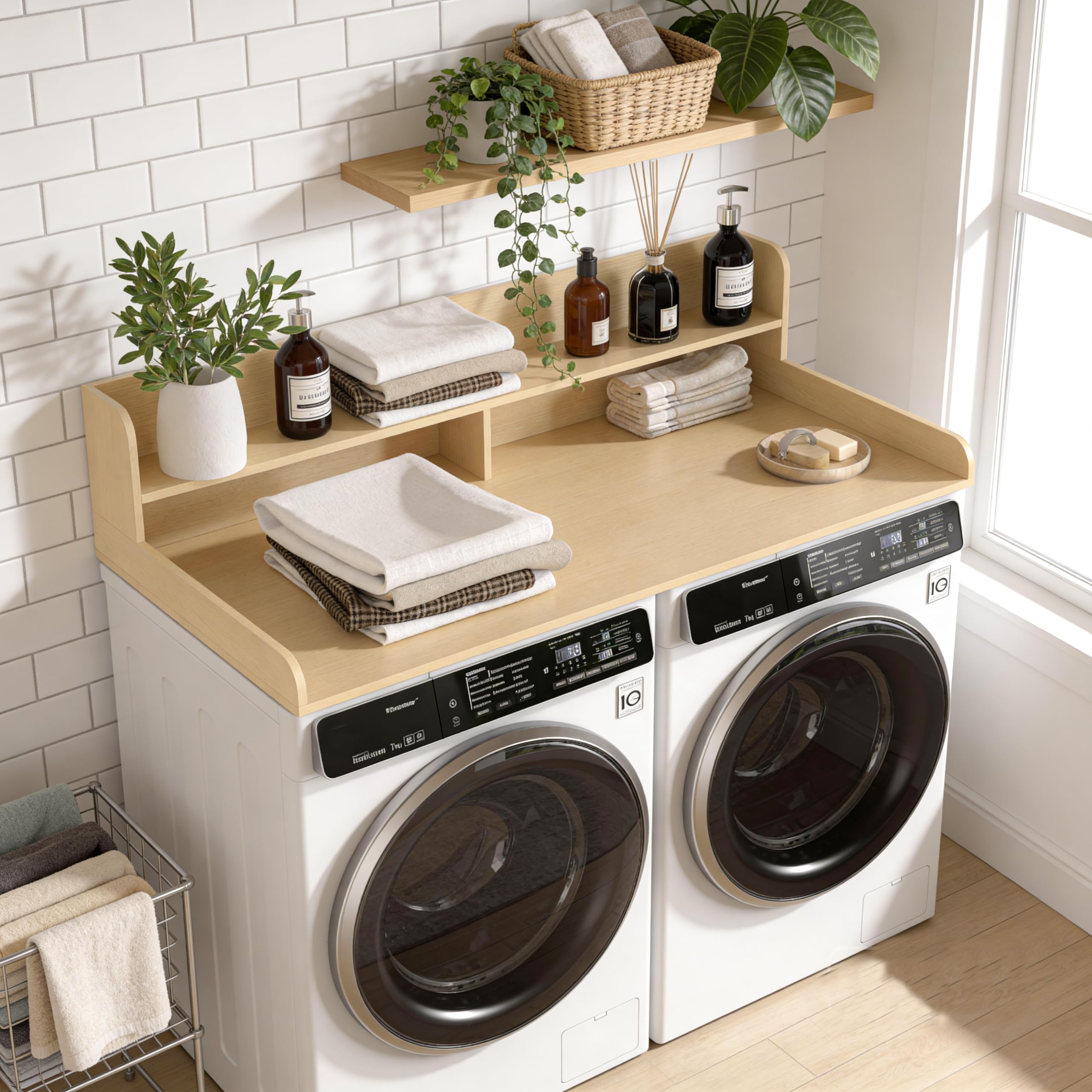 【Perfect modern style】The wood countertop for washer and dryer, with its natural and warm texture, can easily be integrated into the modern minimalist style home environment. Washer dryer countertop is an indispensable professional equipment in the laundry room. It not only provides a stable support platform, but also can meet personalized storage needs through customized design, making laundry work more efficient and convenient.