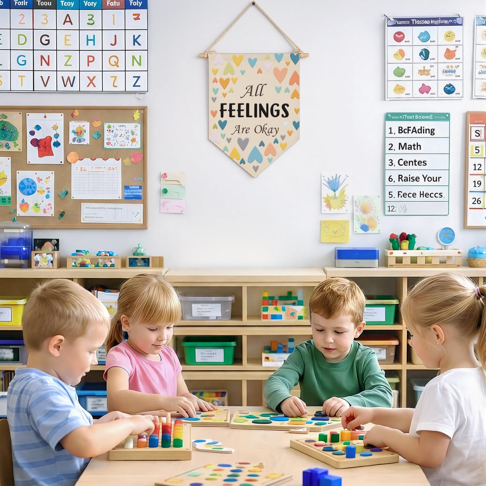 Promote emotional intelligence with our "All Feelings Are Okay" Canvas Hanging Flag. Measuring 15.4 x 11 inches, this artisan-crafted wall art is a heartfelt gift for educators and counselors who create safe spaces for children to express themselves. The colorful heart-filled design paired with its vital message makes it a staple for Social Emotional Learning (SEL) in classrooms and therapy offices alike. Made from premium, heavy-duty cotton canvas and supported by a natural wooden rod, this high-quality banner is a durable and compassionate addition to any learning environment.