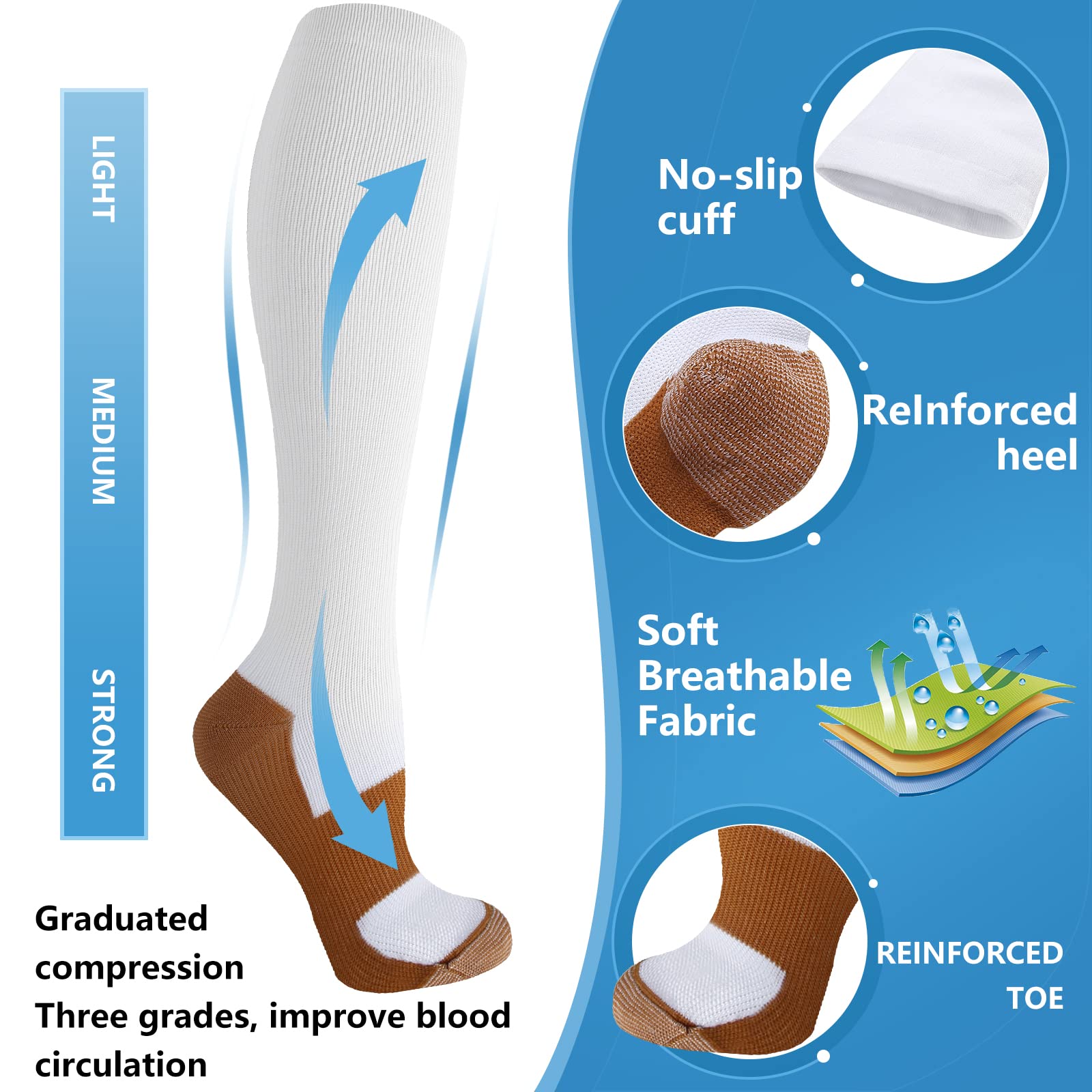 ✅COMPRESSION SOCKS FOR WOMEN & MEN - Copper fiber fabric is very light and Compression socks feels smooth to the skin,So We added Copper fiber to socks to Promote blood circulation in the legs. For Copper compression socks Women on the leg pressure, the doctor's best advice is 20-30 mmhg, through segmented compression support increased blood flow, Socks keep feet and legs fresh all day. It offers the most perfect settlement scheme for those who sit for long period during travel or at work.