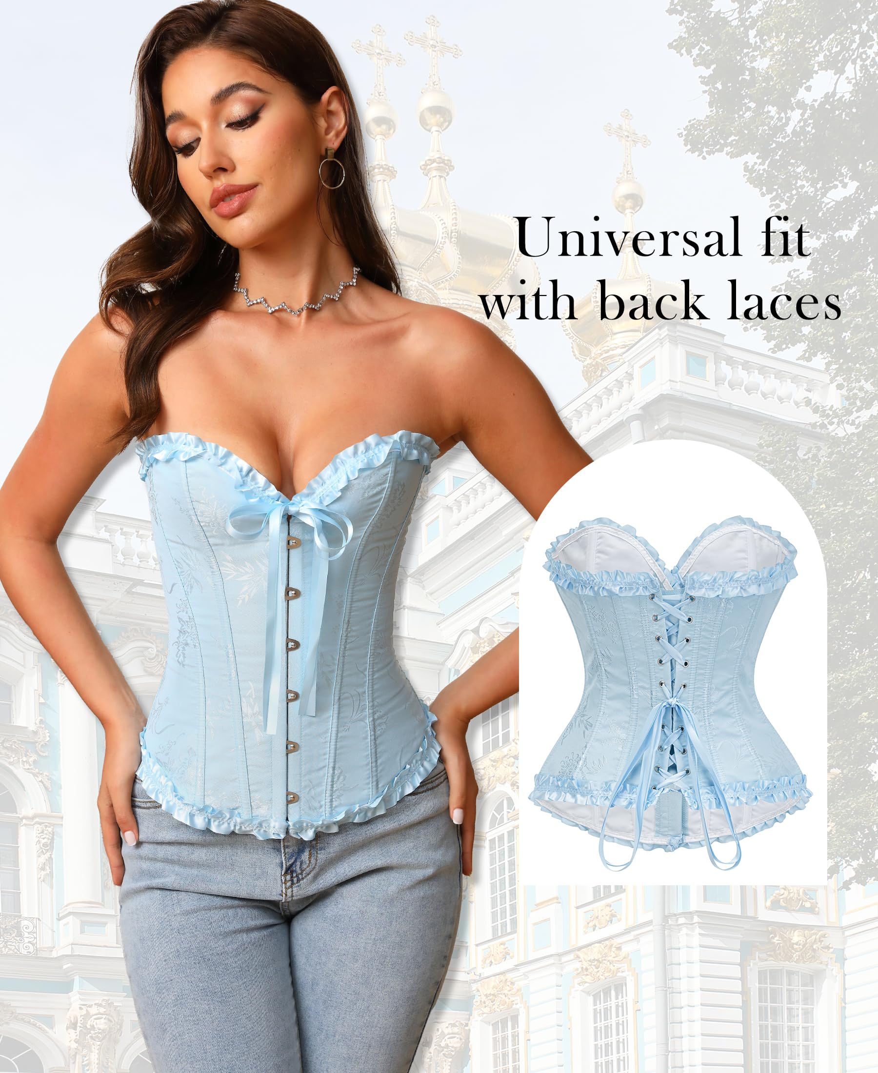 ALL DAY COMFORT: Our overbust corset top is a harmonious blend of comfort and elegance, made with materials that caress your form while ensuring freedom of movement. The waist corset unique 12 plastic bone structure is engineered to support an upright posture, reducing back strain. Designed for wearability from dawn until dusk, the waist cincher corset is the ideal everyday companion. Our lace corset top aligns with your body's needs and your heart's desires.