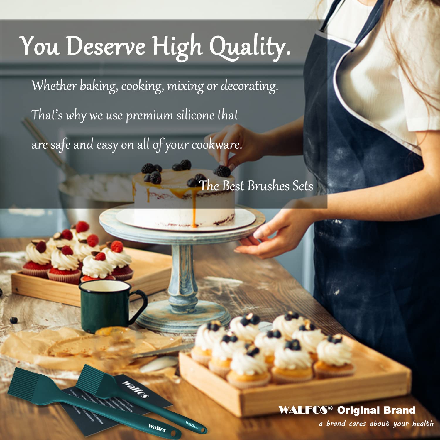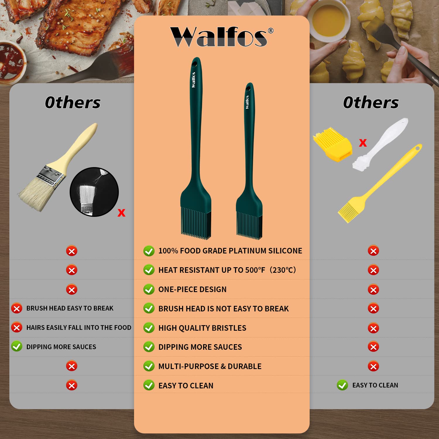 ★Upgraded ONE-PIECE DESIGN & STAINLESS STEEL CORE TECHNOLOGY - Walfos basting brush,Owing to ONE-PIECE design, the silicone bristles will not break or shed in your food, unlike other bristle brushes. No bacteria will be stuck in the silicone basting brush and keep your food safe. The handle built with internal steel core results in a solid durability to our basting oil brush, it is also long enough to get a firm grip, never break and rust.