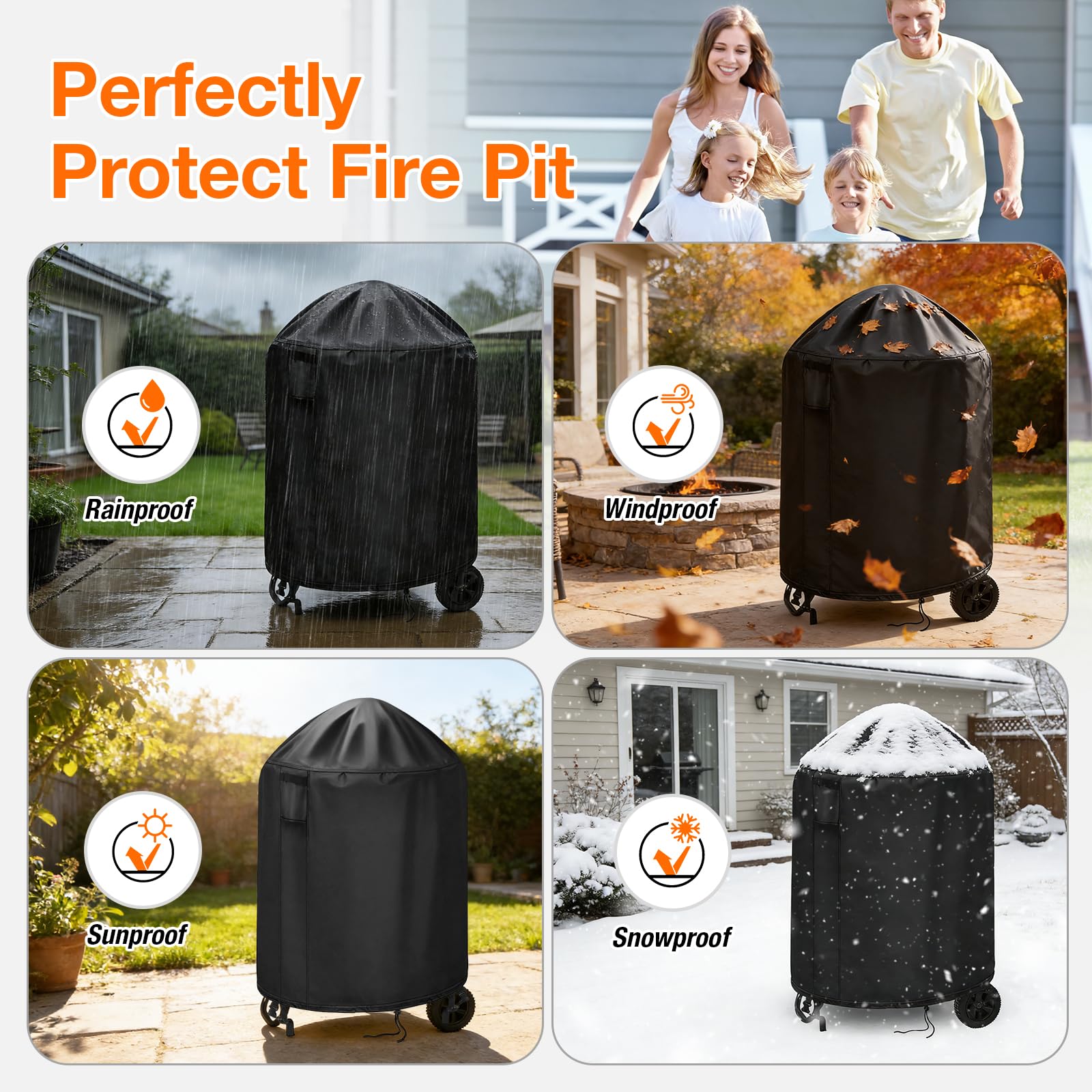 High-density Material- Our firepit cover is made of premium high-density polyester fabric with silver plated coating, the fire pit cover is durable,anti-hook and waterproof and weatherproof, protects your fire pit against rain, wind, snow, dust and sunlight.