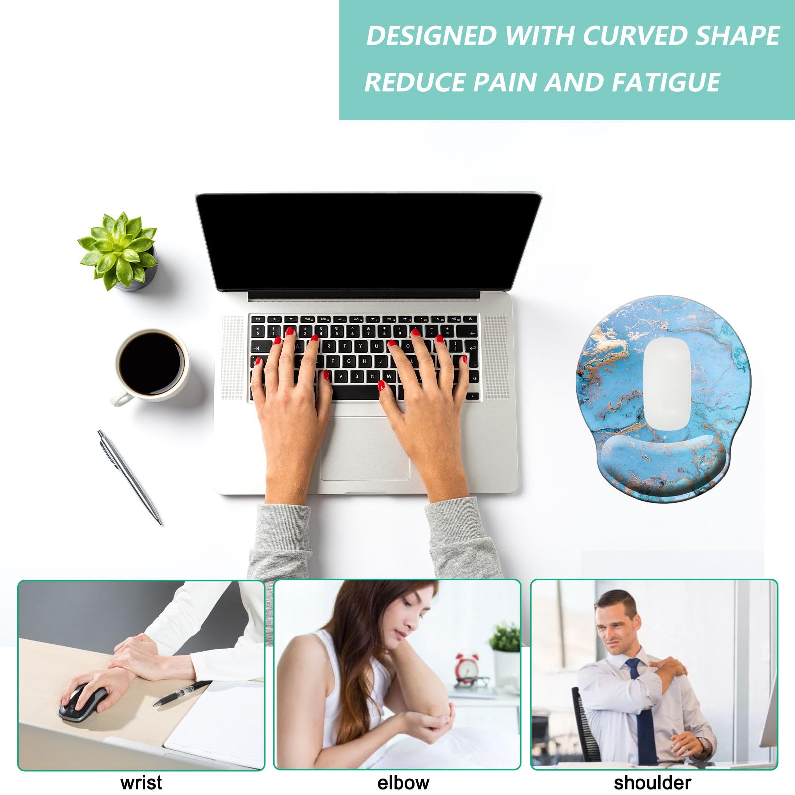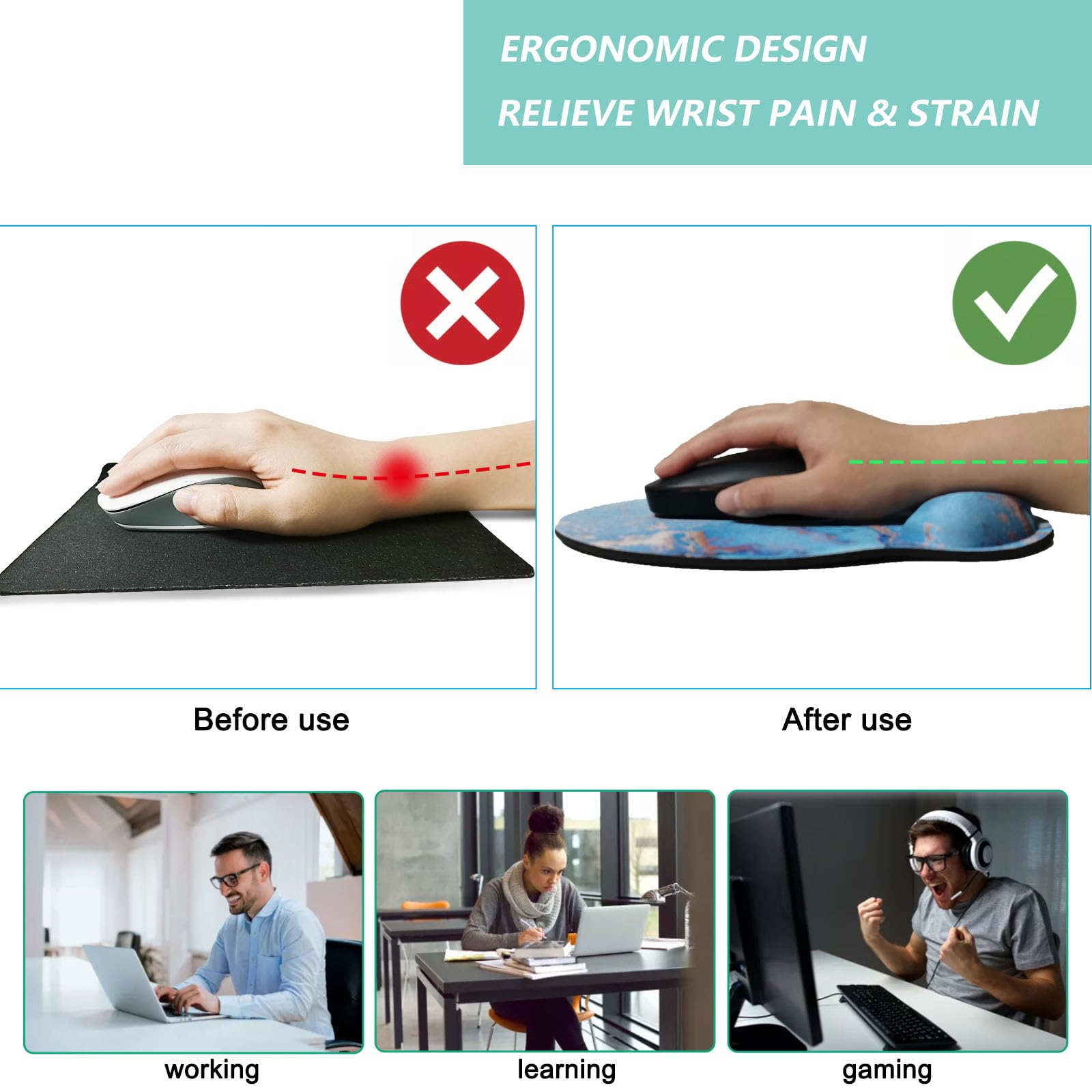 PROTECTION - Protect your wrist, shoulder by using our mousepad with wrist support. It can reduce fatigue, relieve pressure on your hand, wrist, elbow and shoulder, avoid carpel tunnel syndrome, and avoid excessive friction between wrist and desk.