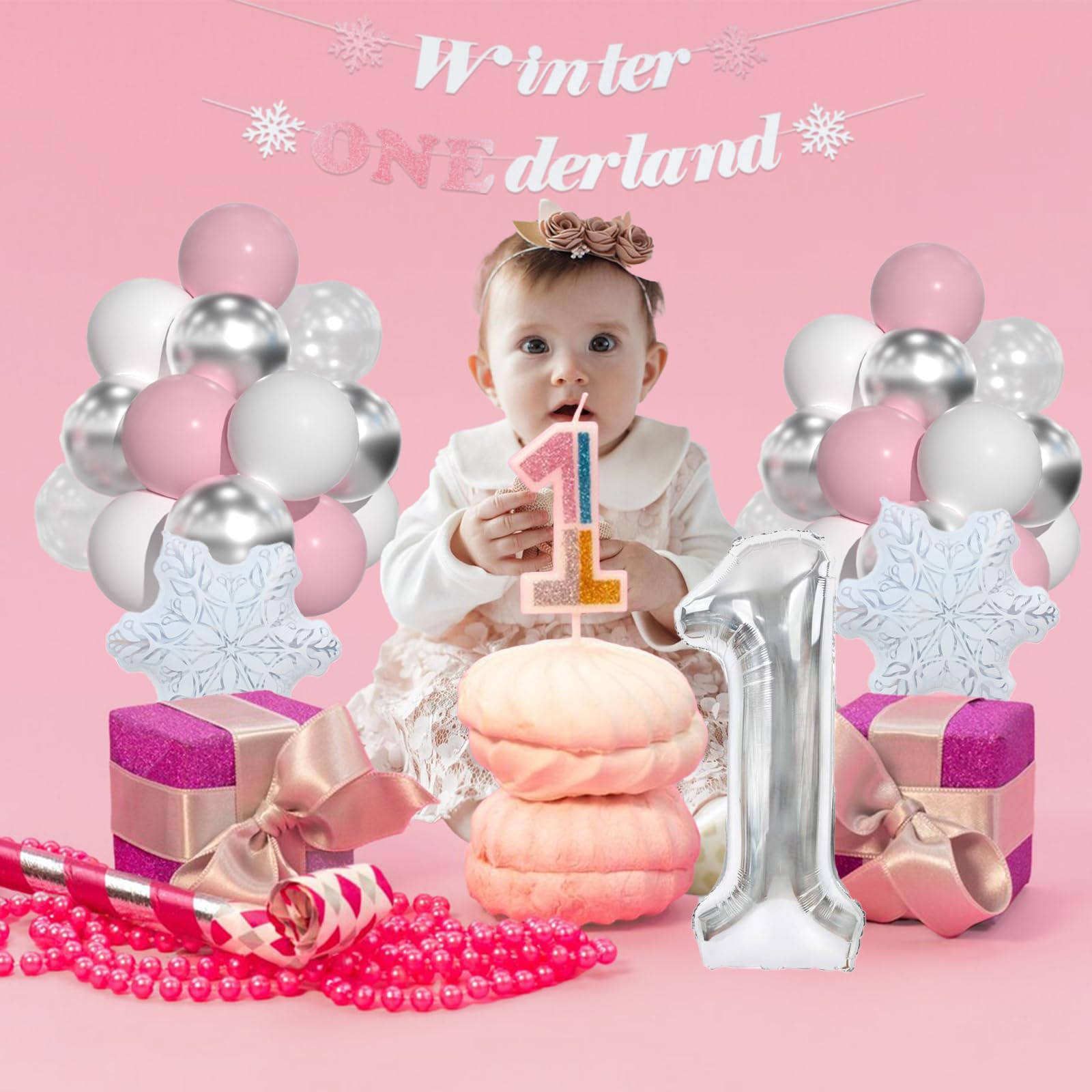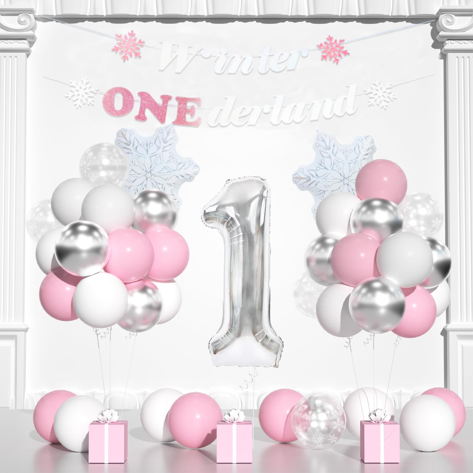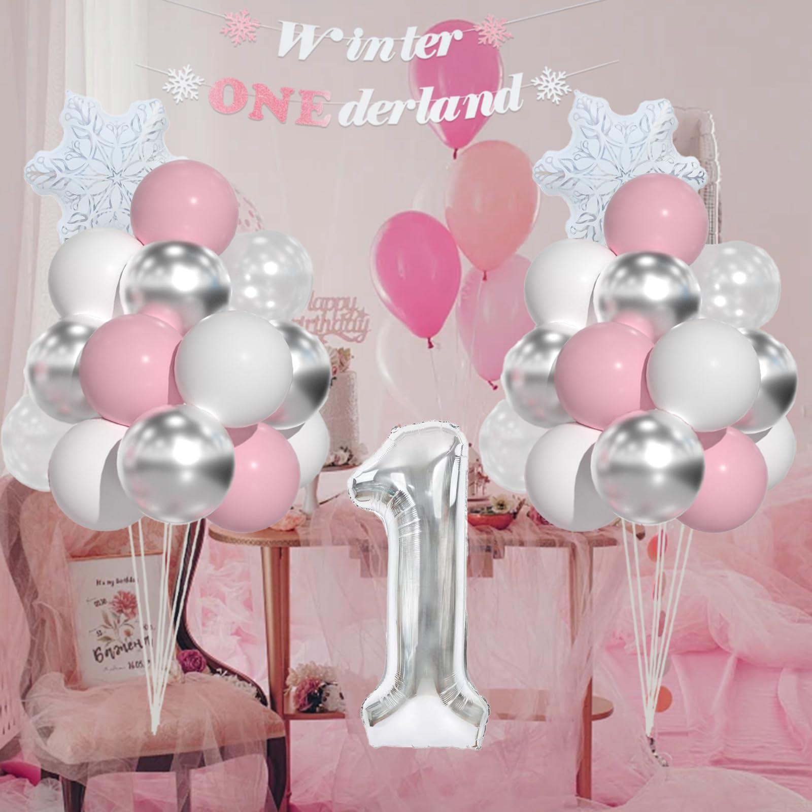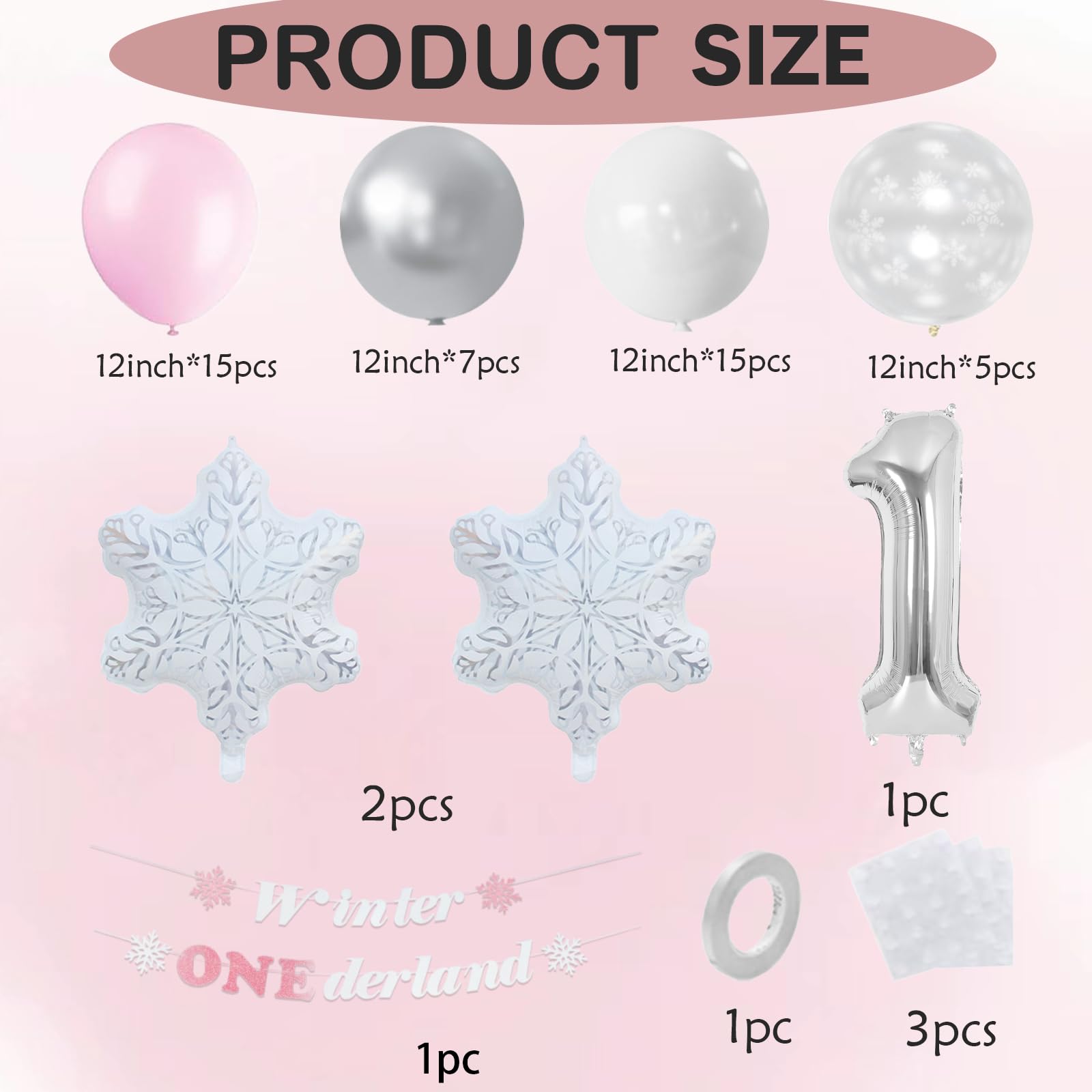 Winter ONEderland 1st Birthday Include: 40inch silver 1 balloon, pink "Winter Onederland" banner, 15pcs 12inch pastel pink balloons, 15pcs 12inch white balloons, 7pcs silver balloons, 5pcs snow clear balloons,2pcs snowflake foil balloons and 60pcs balloon glues and 1 roll ribbon.
