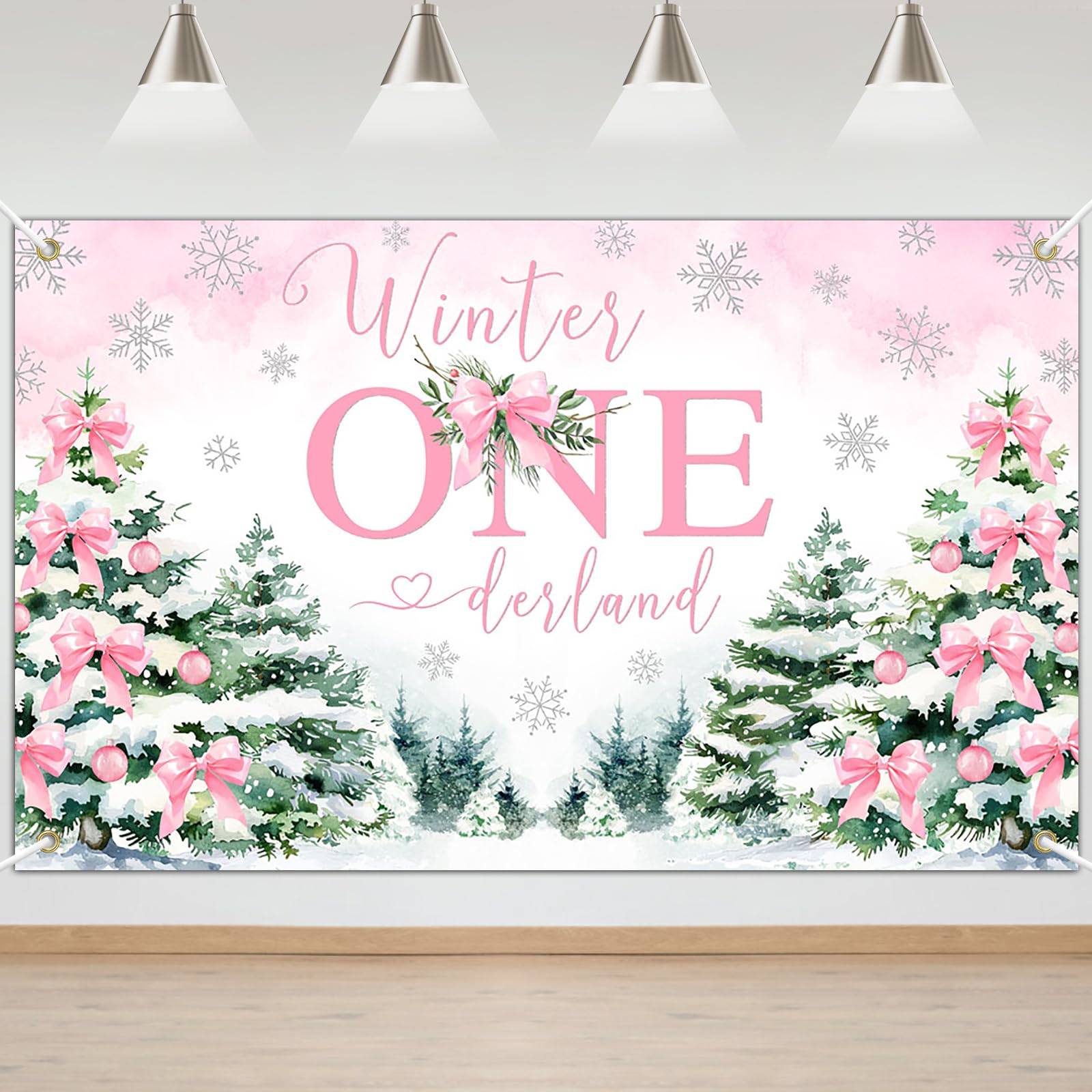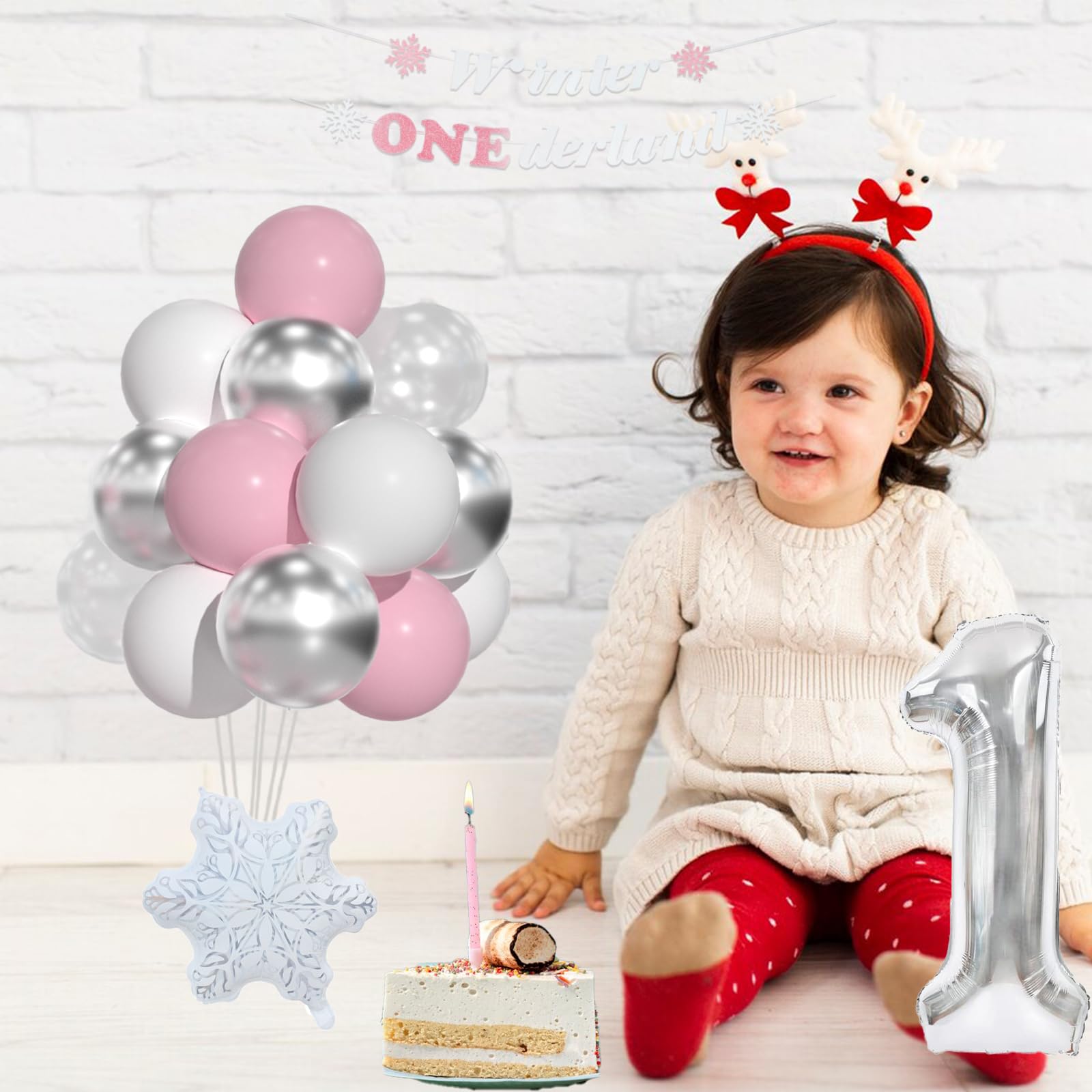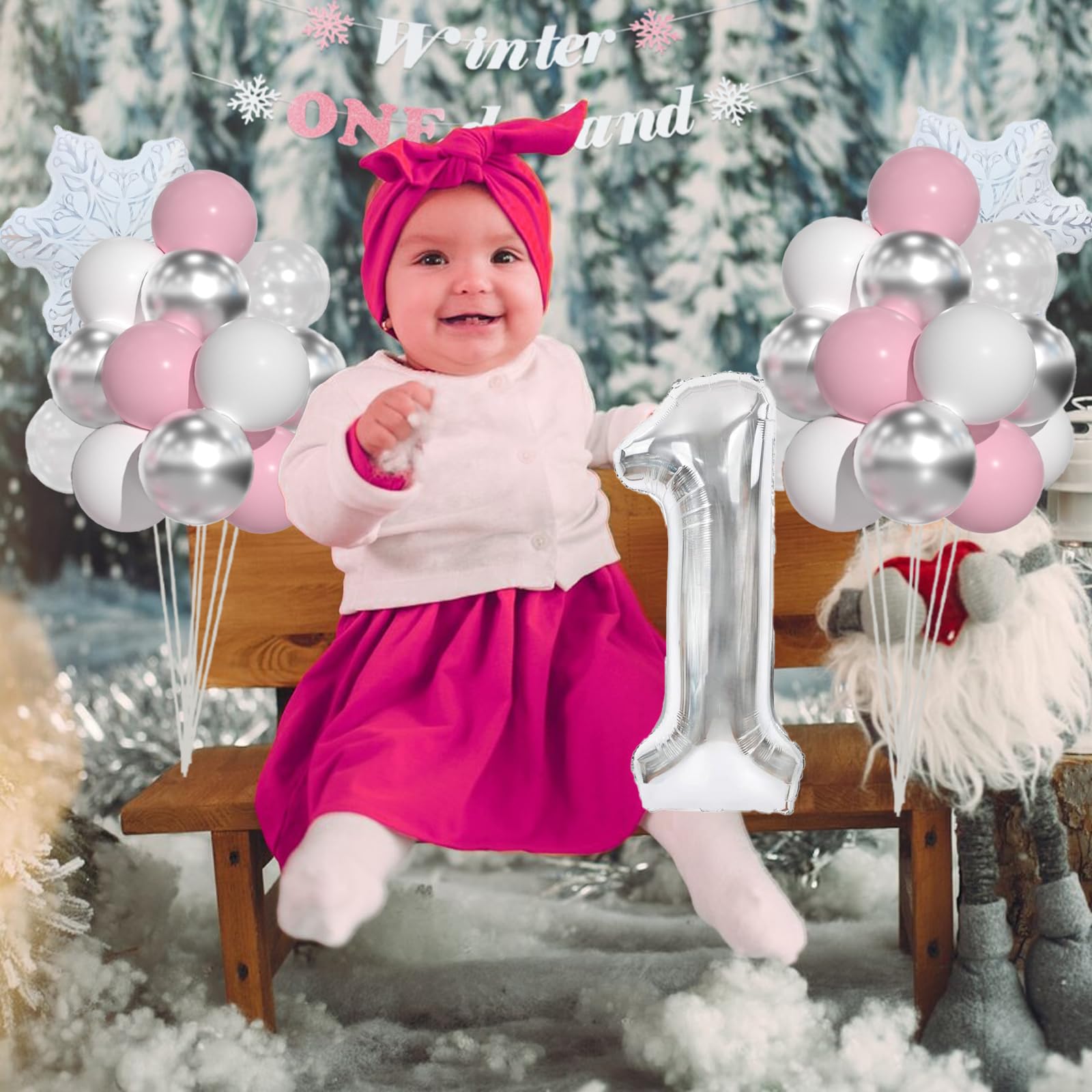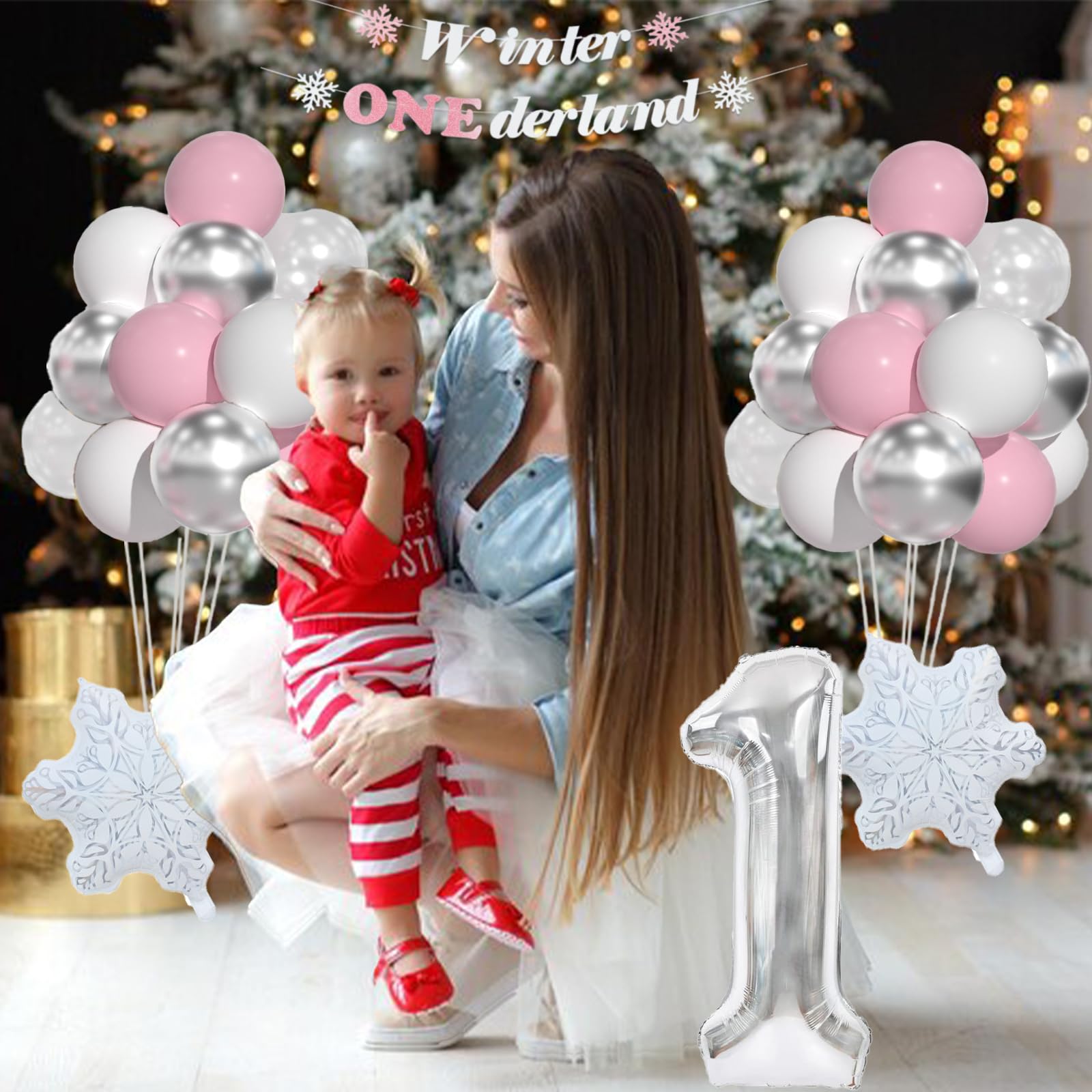 Winter ONEderland 1st Birthday Include: 40inch silver 1 balloon, pink "Winter Onederland" banner, 15pcs 12inch pastel pink balloons, 15pcs 12inch white balloons, 7pcs silver balloons, 5pcs snow clear balloons,2pcs snowflake foil balloons and 60pcs balloon glues and 1 roll ribbon.