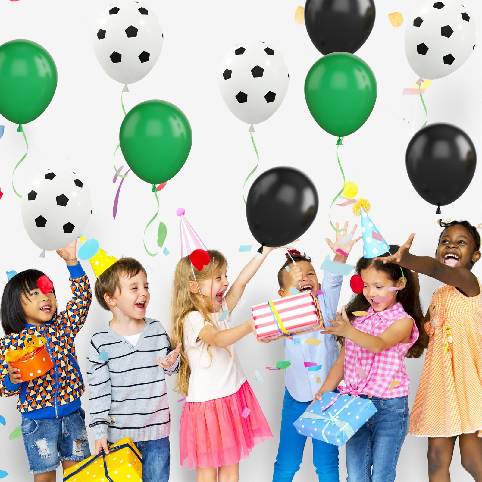 12 Inch football balloons: Package content includes 10pcs black balloons, 10pcs soccer print balloons, 10pcs green balloons, a balloon ribbon.The color combination meets all your party imagination.