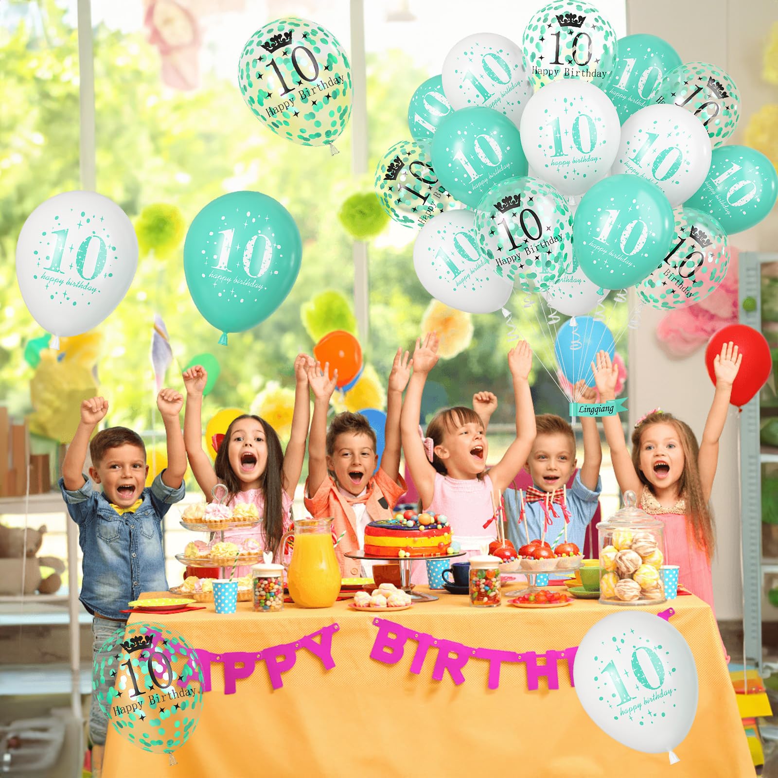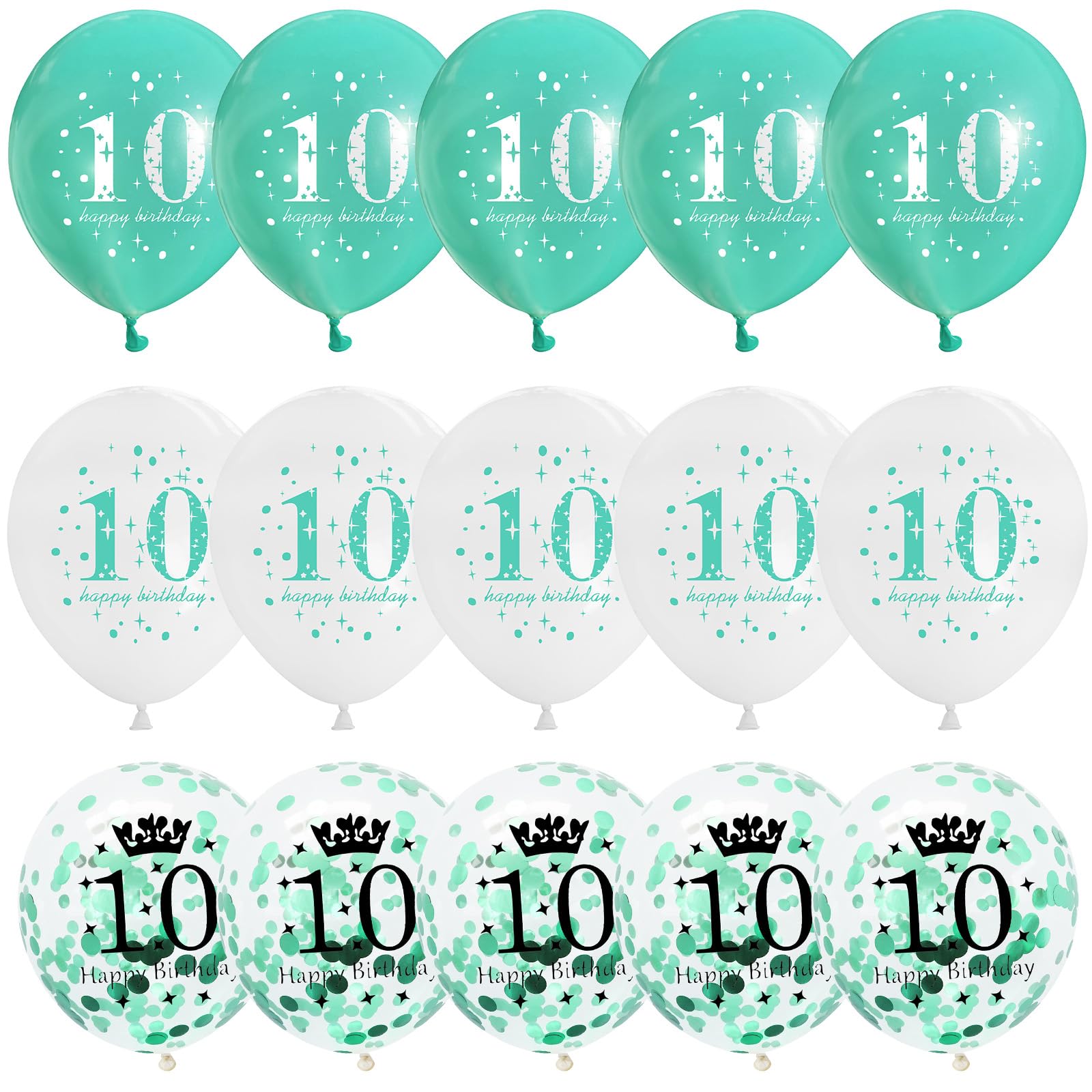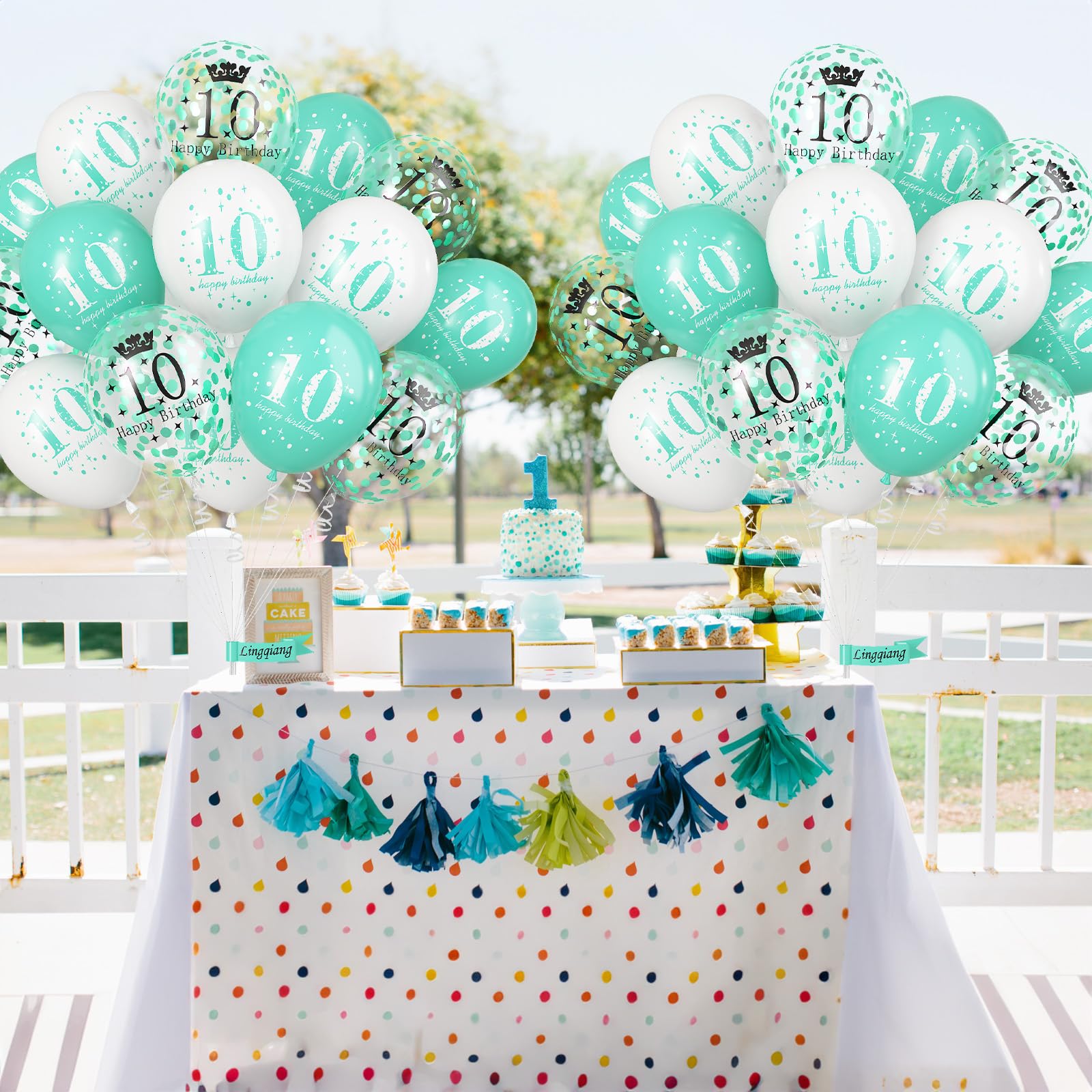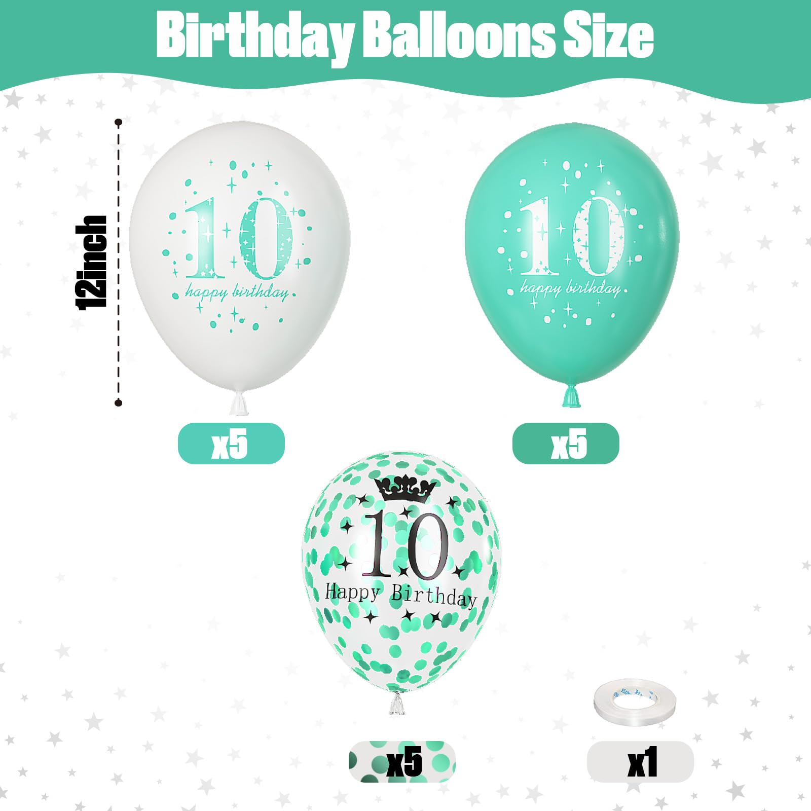 🎂 10th Birthday Balloons - You will get total 15 pieces 12 inch teal white happy 10th birthday latex balloons, inclulde 5 pcs turquoise print balloons, 5 pcs white print balloons, 5 pcs teal confetti print balloons, come with a balloon ribbon. Perfect for girls boys 10th birthday party decorations supplies.