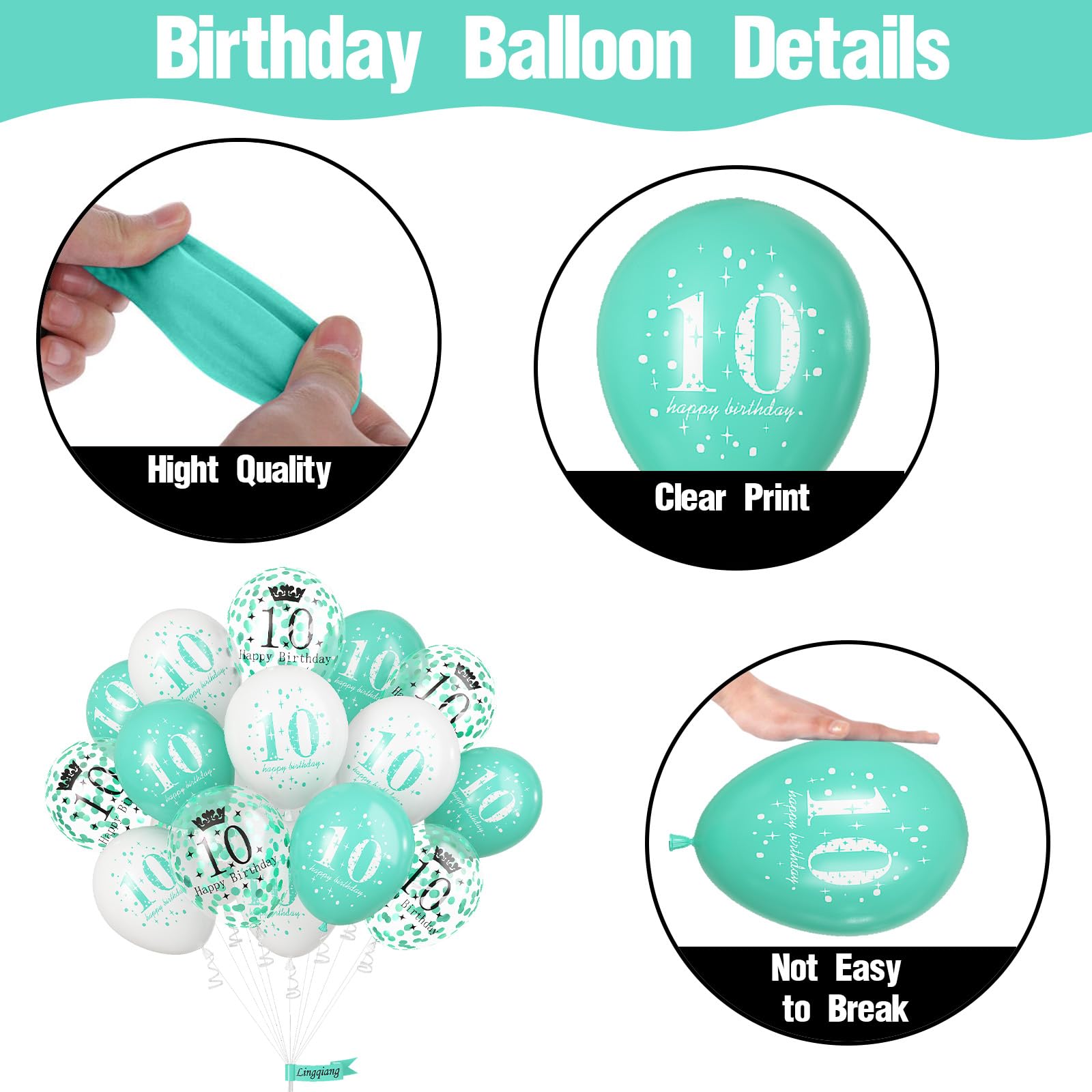 🎂 Premium Material - The teal white 10th birthday party balloons is made of high quality natural latex, non-toxic and durable, thick and long-lasting, not easy to burst. They can be filled with air or helium, as a wonderful decorations for boys girls 10th birthday party or family party.