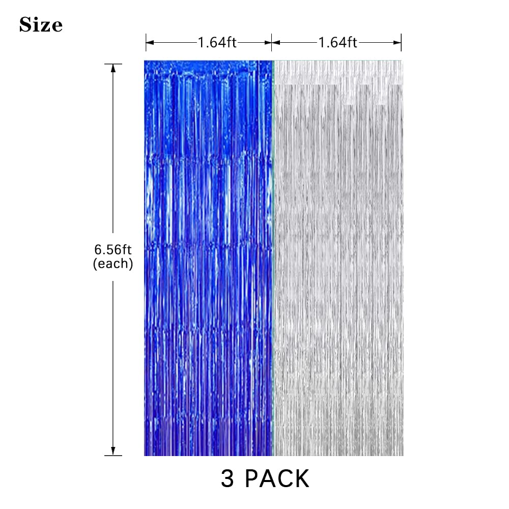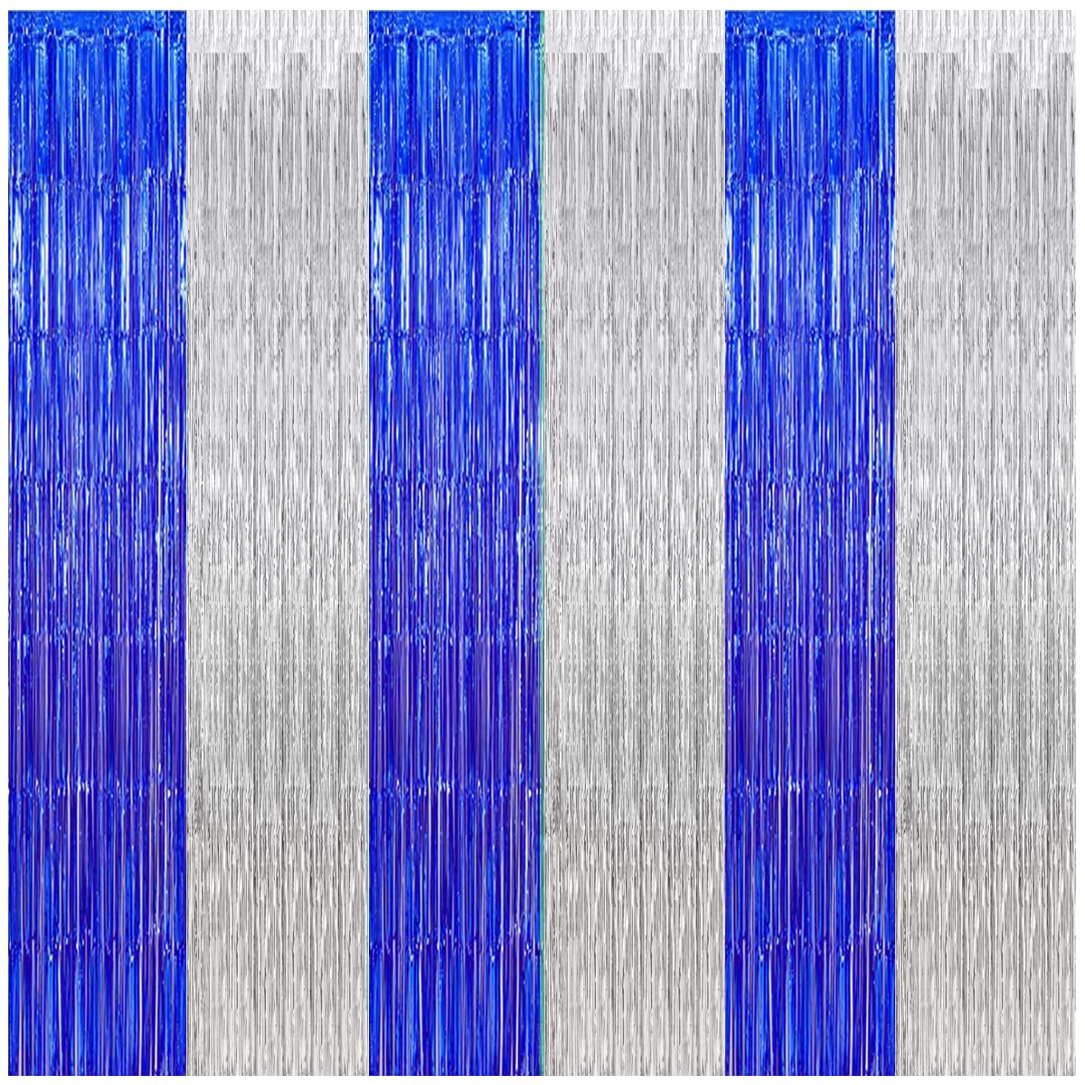 Blue and White Decorations Backdrop Curtain - Blue and white 2 colors, 3 Pack foil curtains, Size: 3.28 x 6.56 feet. May need to order double if you want to cover more space or simply give them a more “tight” look to your decor.