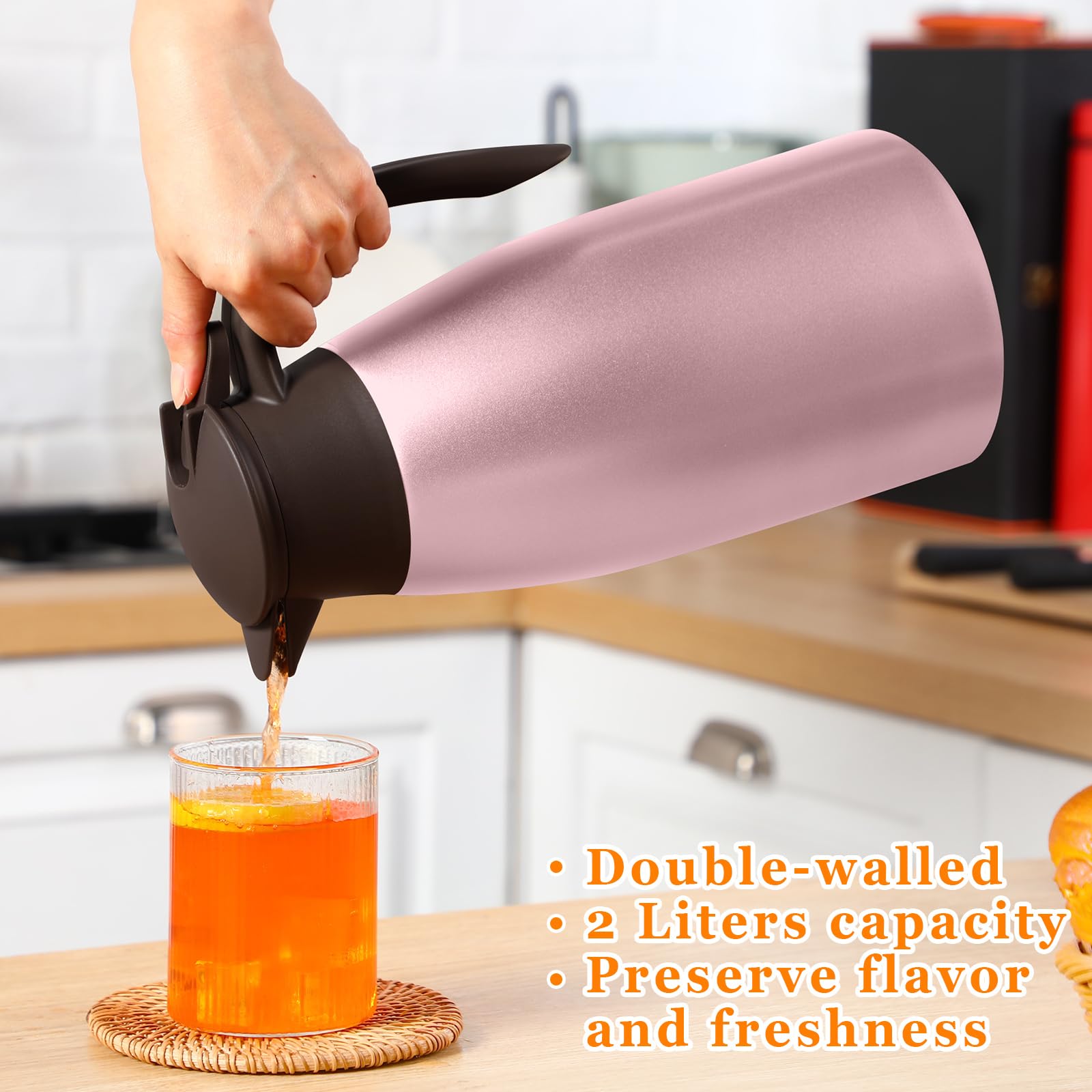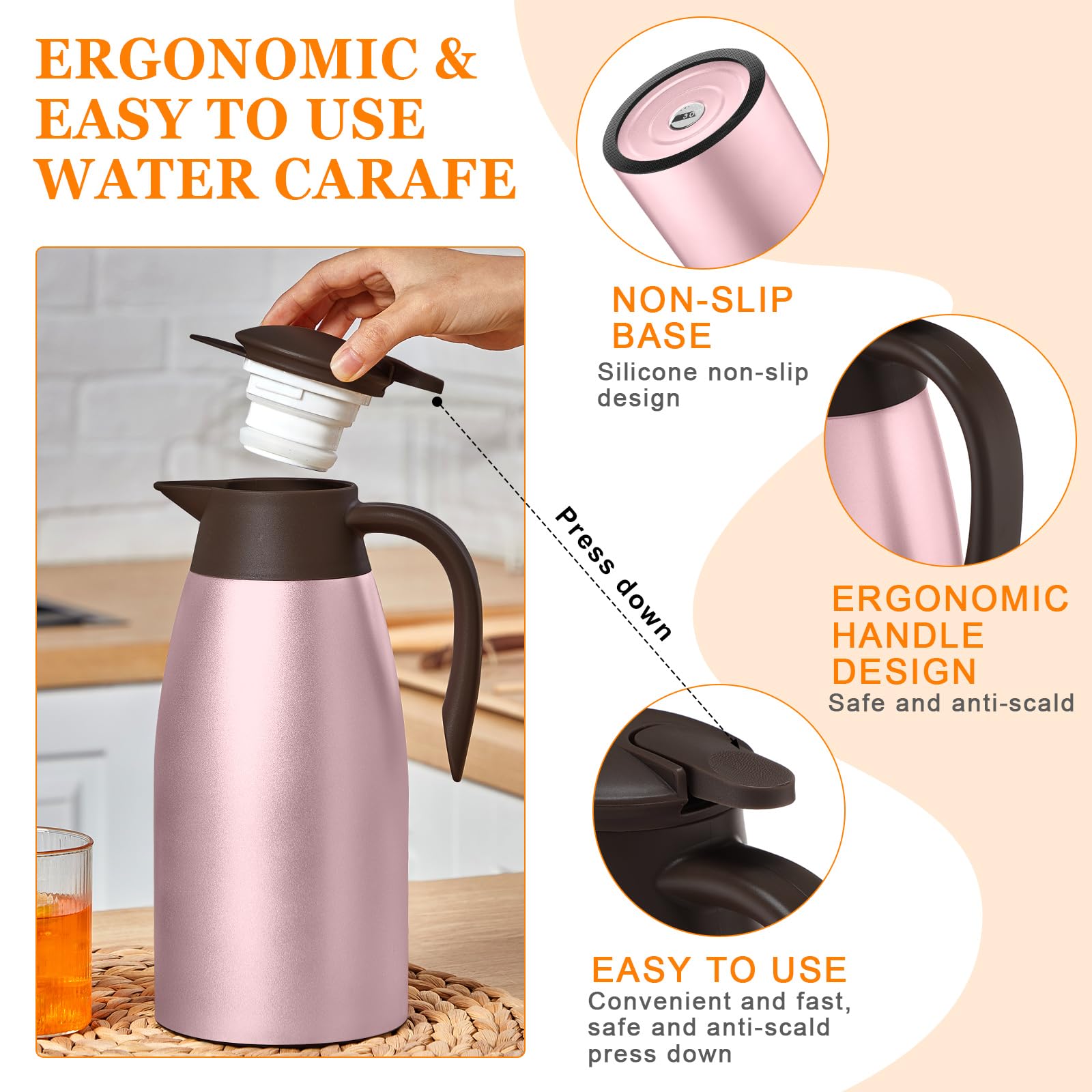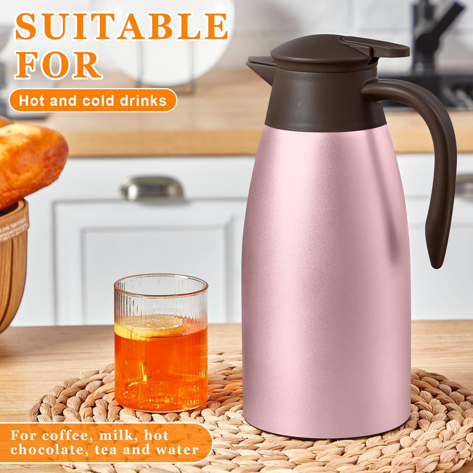 Proper Capacity: the vacuum insulated thermal coffee carafe measures about 68 oz in capacity, ideal size for holding tea, coffee, milk, water, juices, lemonade, and other cold or hot drinks; With a nonslip silicone base, it can keep stable on your table or countertop