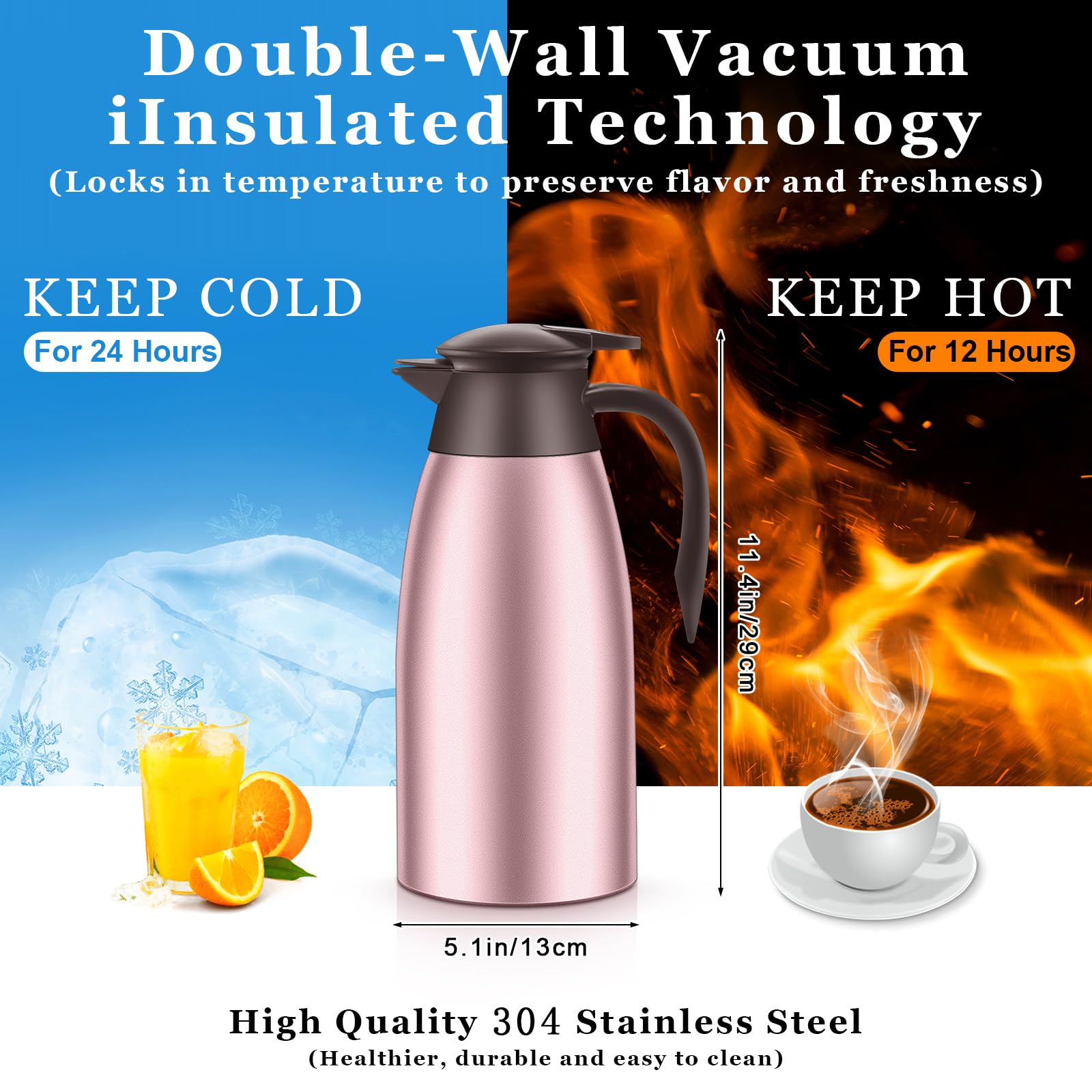 Reliable and Long Lasting: the 68 oz thermal carafe is mainly made of quality 304 stainless steel, durable and solid, safe to use and not easy to rust or break; With smooth surfaces and a removable lid, the carafe is convenient to clean and can serve you for a long time, and it is dishwasher safe