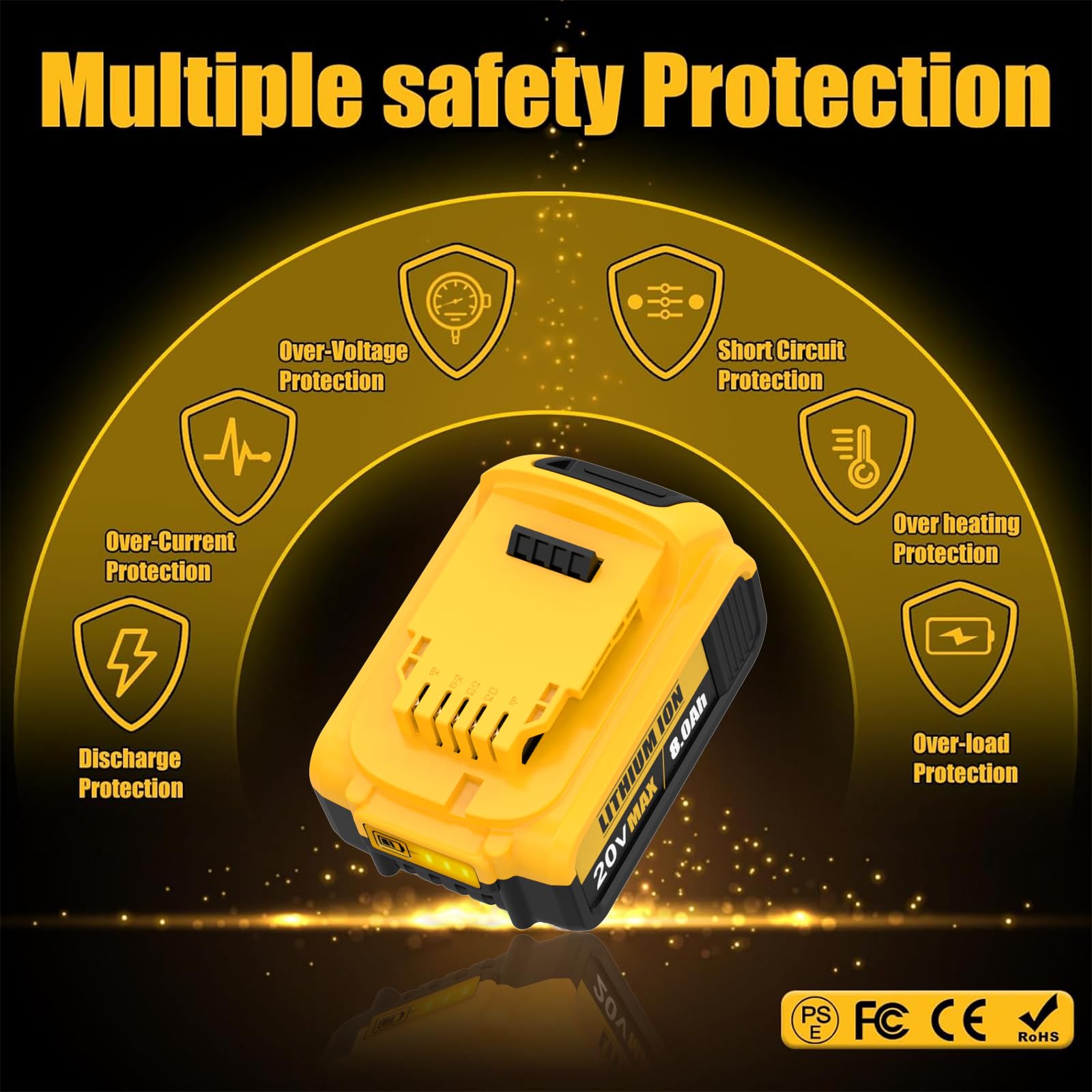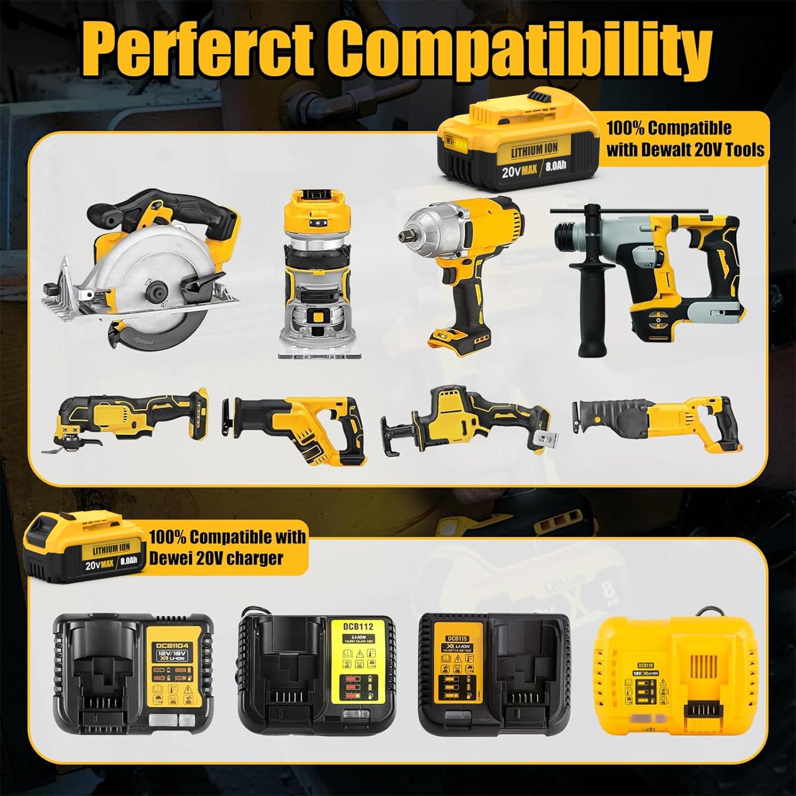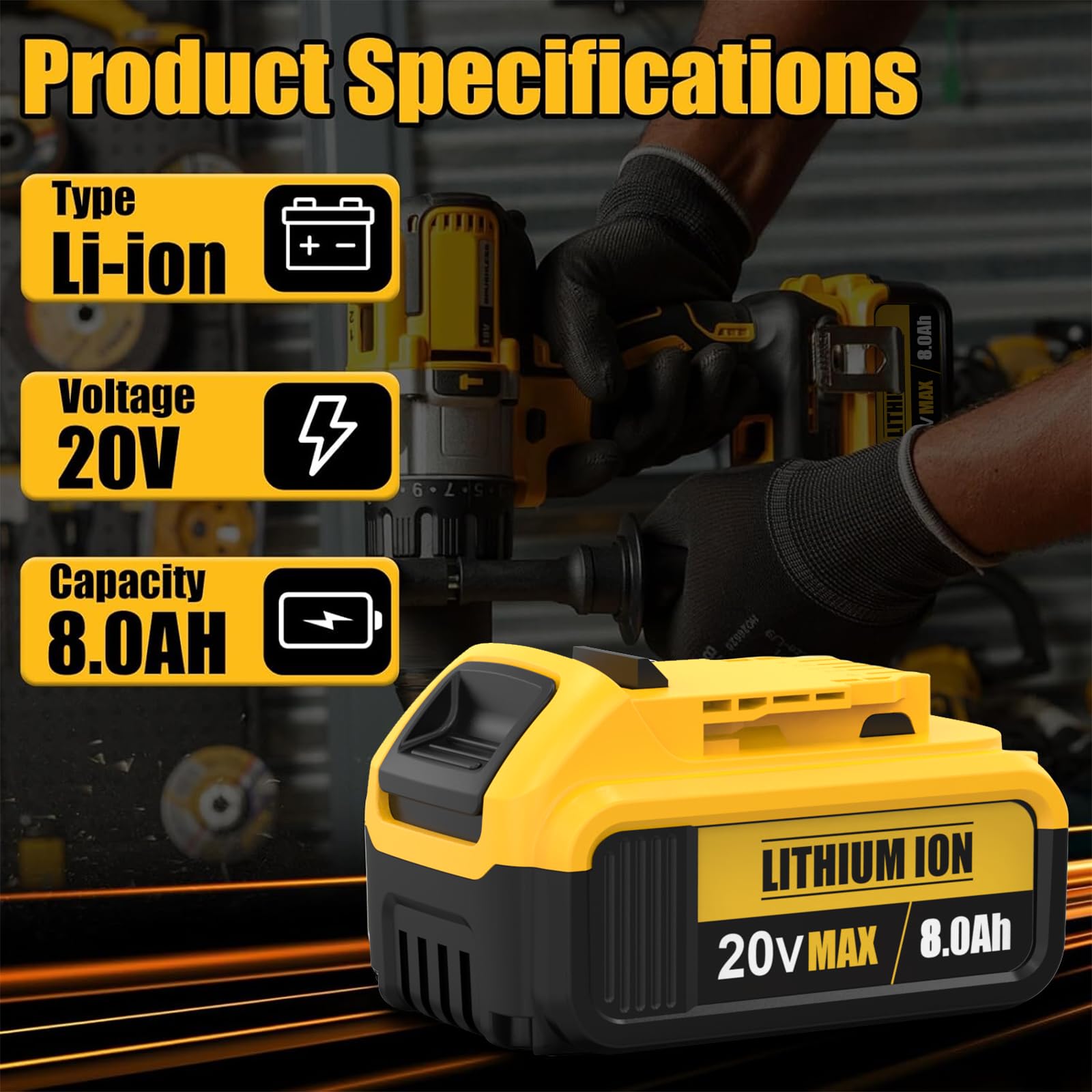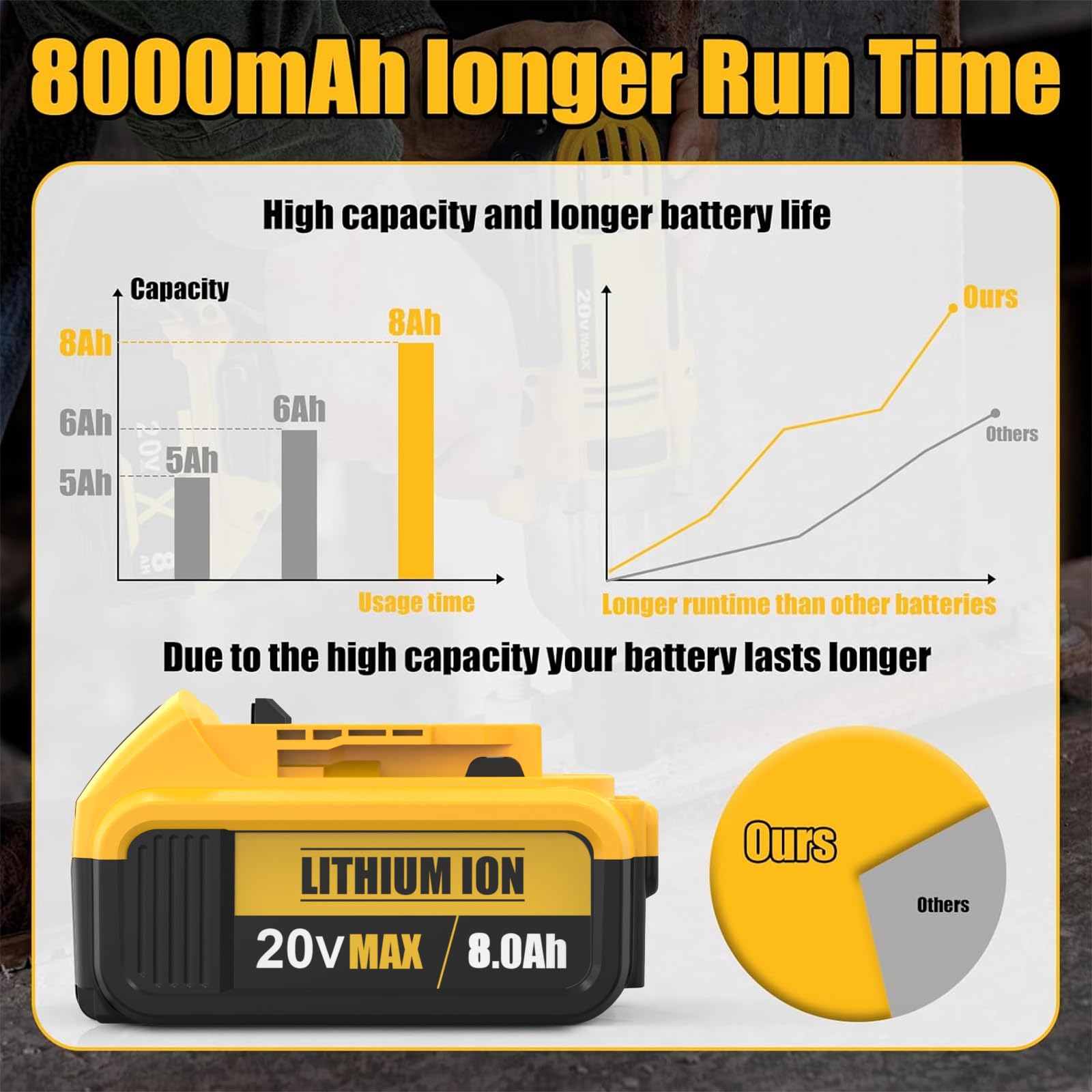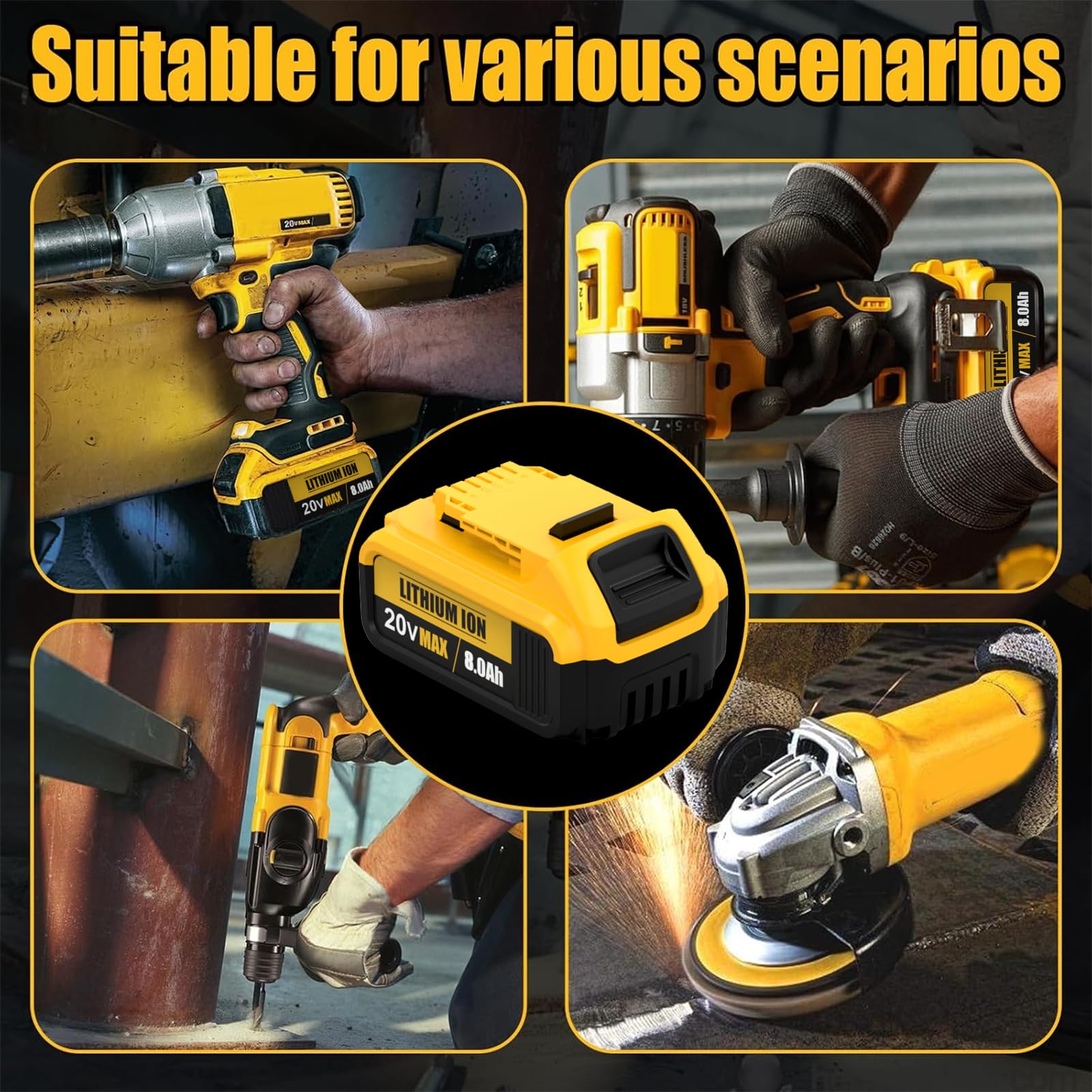 【4 Packs 8.0Ah High Capacity】Upgraded replacement for Dewalt 20V Max battery with 8000mAh capacity. Delivers longer runtime and stronger power. With 4 packs, your tools stay powered for heavy-duty projects.