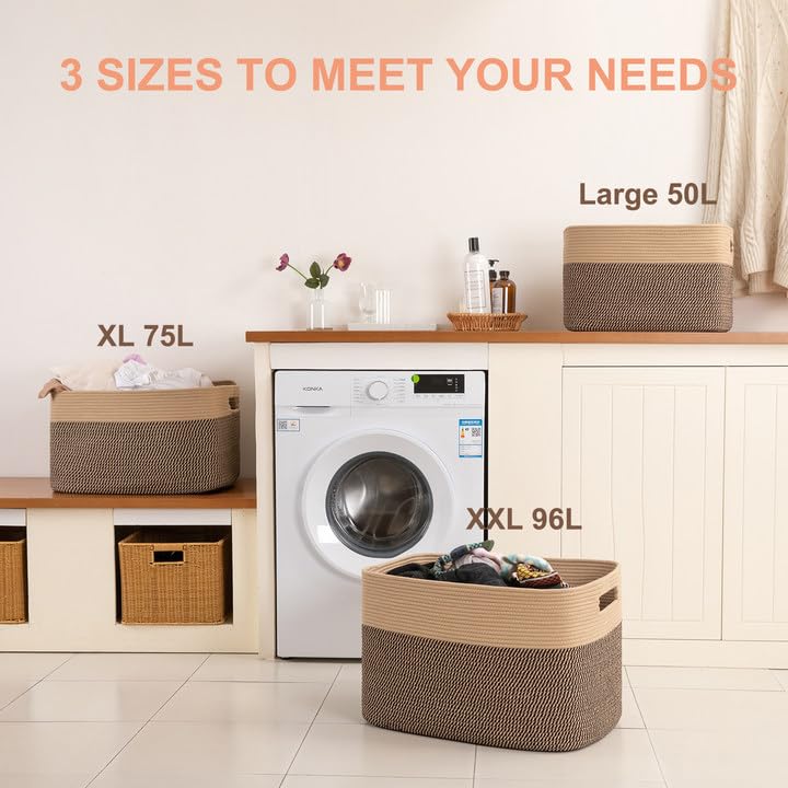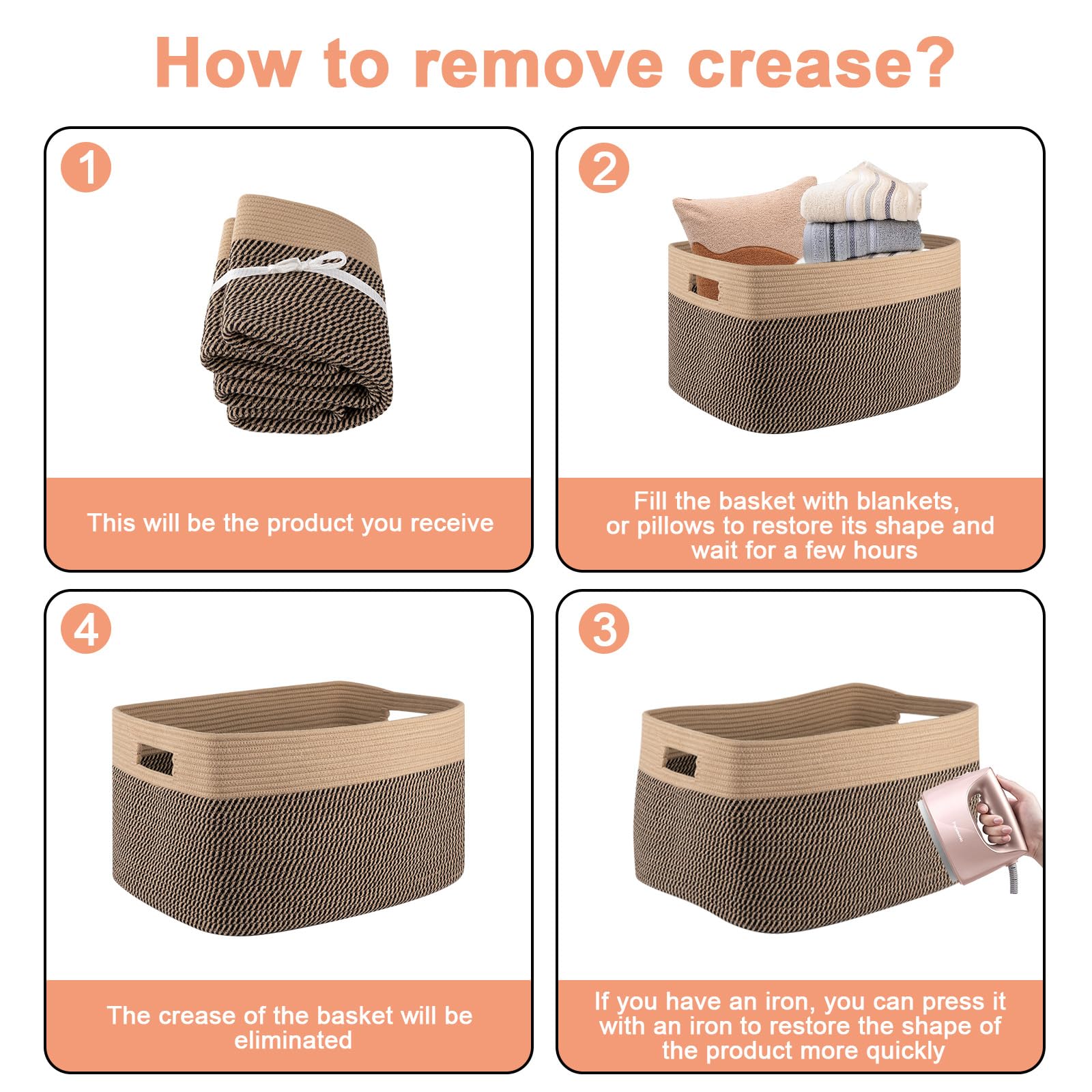 Please Attention: This clothes basket comes in folded. Filling it up with towels or blankets could help it return to its best shape. Fast smoothing the creases by ironing them. The rope basket is hand and machine-washable. It's built for long-term use